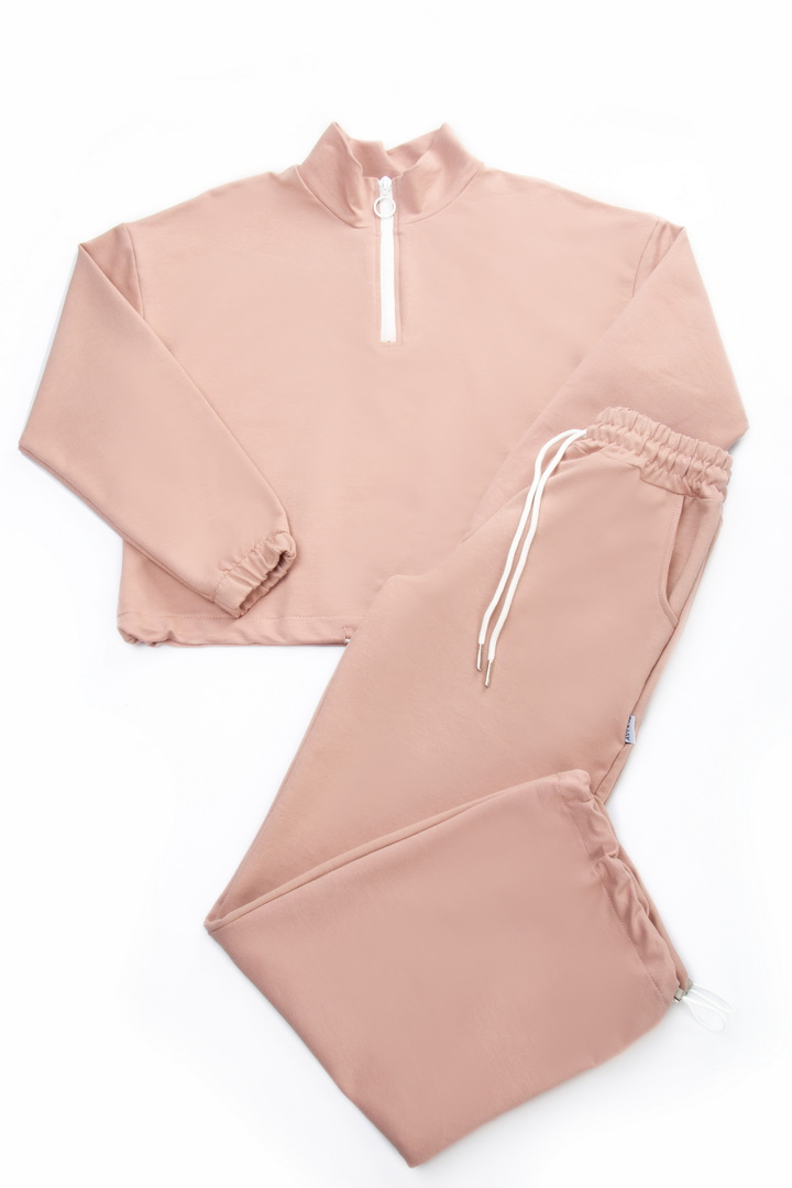 Ультрамодний костюм для дівчаток-підлітків виконаний з "Двохниткового футера піньє". Модель складається із світшоту та штанів, внизу світшота вставлений шнурок для регулювання ширини та затяжки, має високий комір на застібці "Блискавка", а також штанів з кишенями, притачним поясом із широкою гумкою та шнурком, низ виробу на гумці із затяжкою. Полотно досить щільне, не деформується та не скочується.