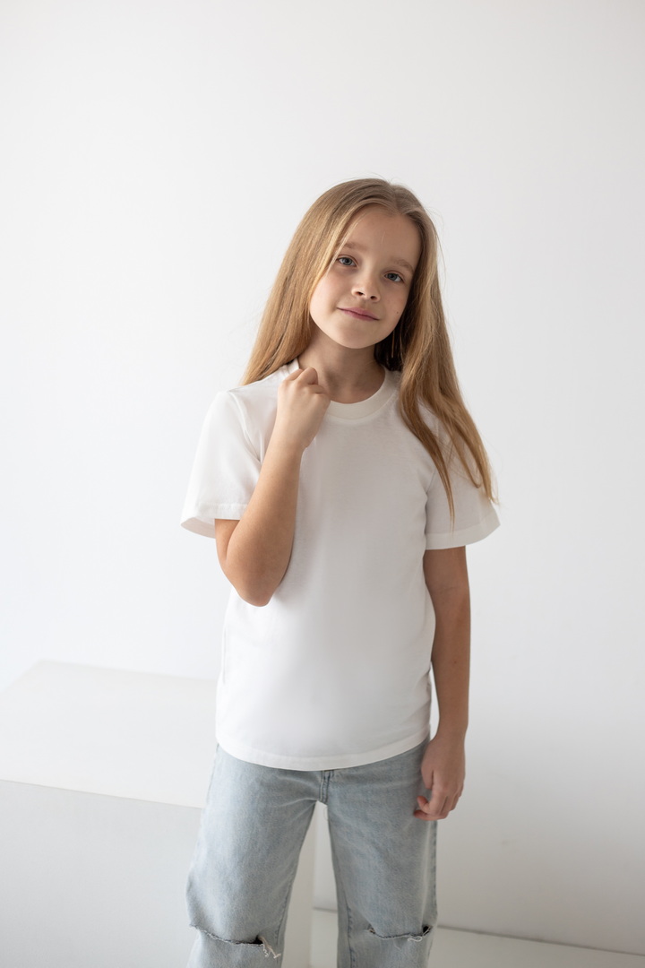 Класична футболка із куліру з округлою горловиною. Футболка стала незмінною річчю в гардеробі і дівчаток, і хлопчиків завдяки своїй універсальності. Полотно натуральне, тому в ньому дуже комфортно.