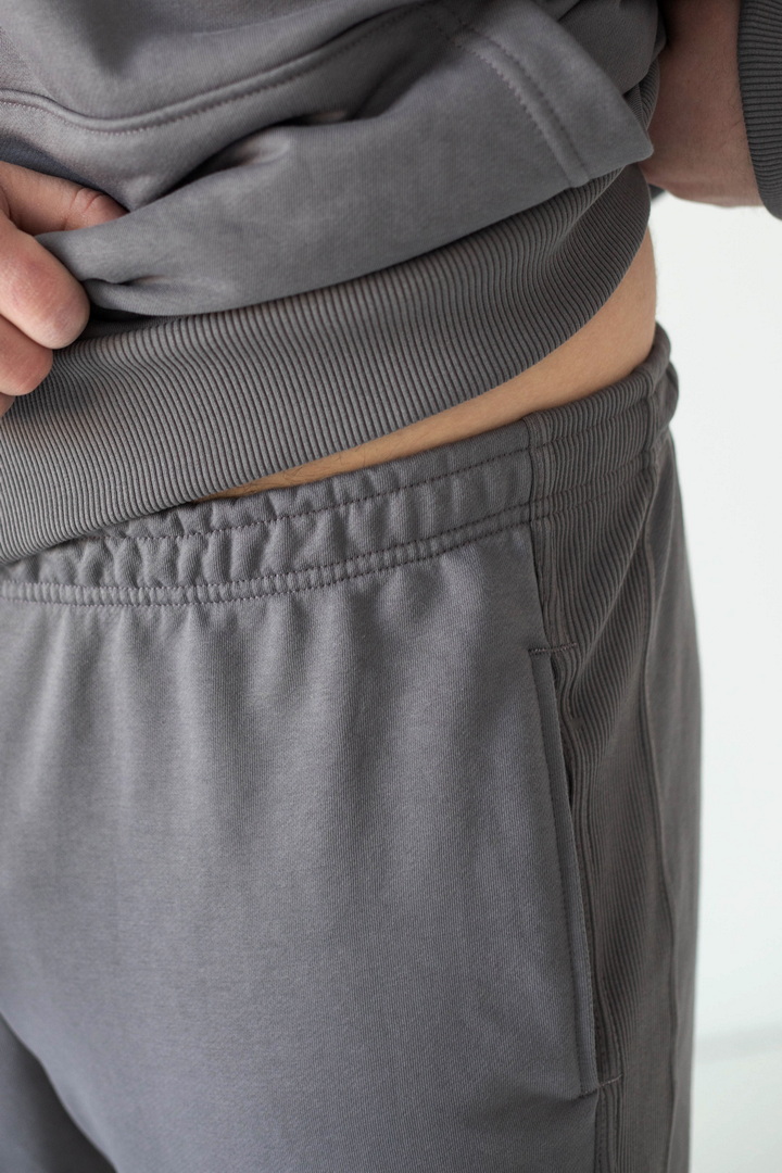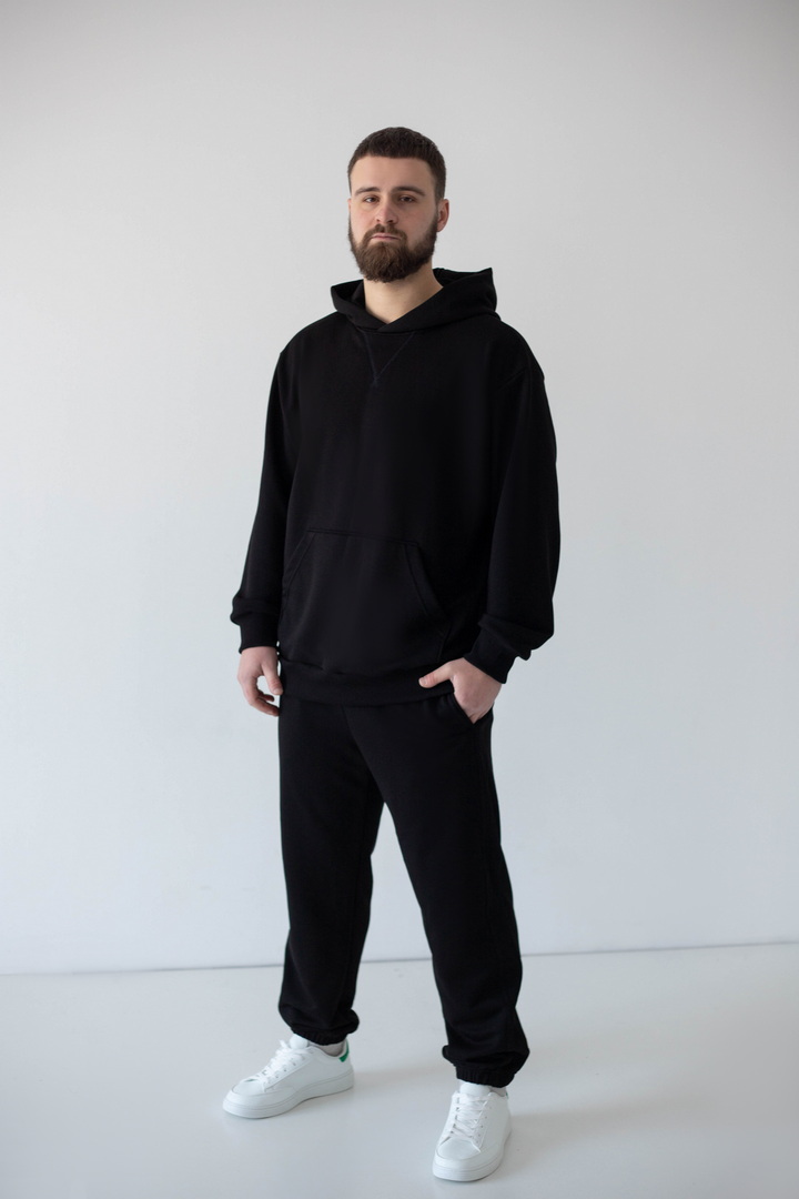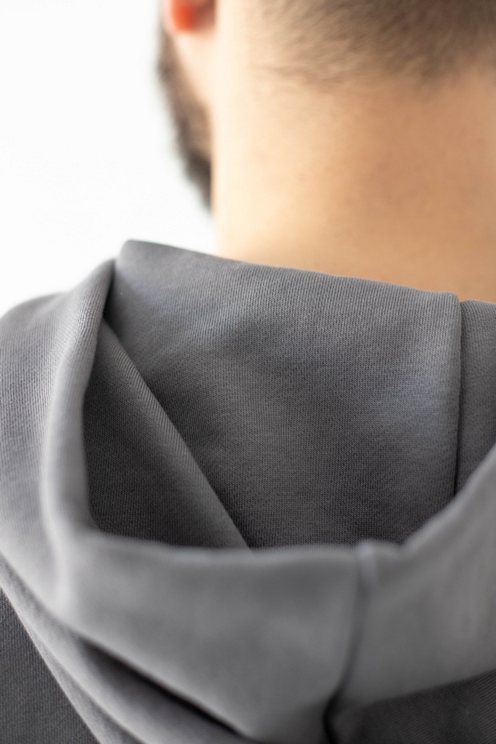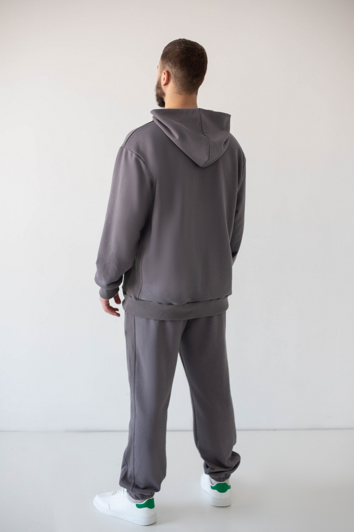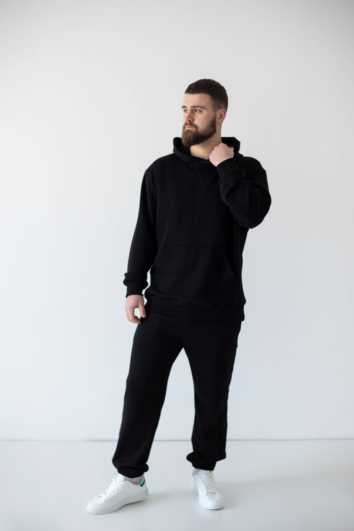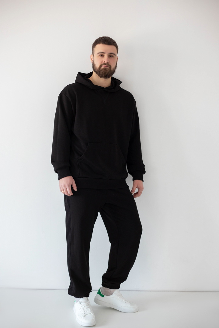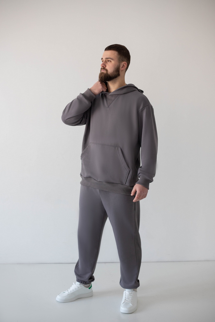Цей костюм — про спокійний стиль, продуманий комфорт і якість, яку видно одразу. Він створений для чоловіків, які не женуться за трендами, а обирають речі, що виглядають актуально сьогодні й залишаться такими завтра. Тринитка петля пеньє — щільна, гладка ззовні та м’яка зсередини. Завдяки пеньє-пряжі поверхня виглядає рівною й дорогою, без зайвої фактурності. Худі має чіткий, збалансований крій: не обтягує, але й не виглядає мішкувато. Капюшон тримає форму, кишеня-кенгуру зручна та практична. Штани з еластичним поясом і манжетами, створюють акуратний силует та добре сідають по фігурі. Це універсальний костюм, який створює стильний та впевнений образ без зайвих зусиль.