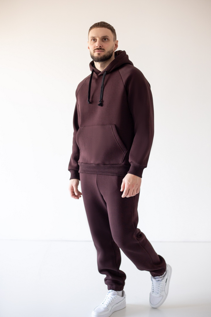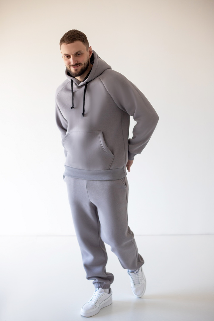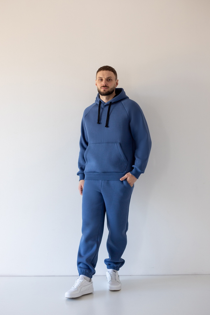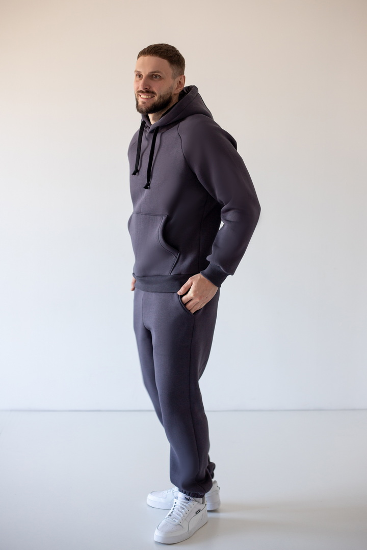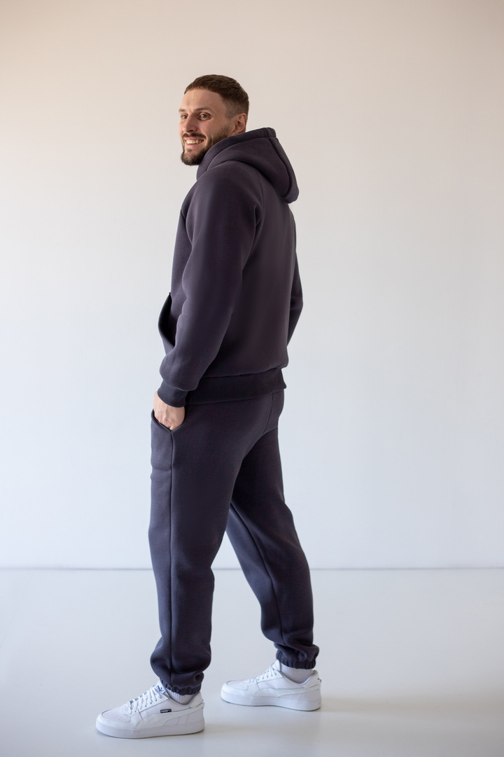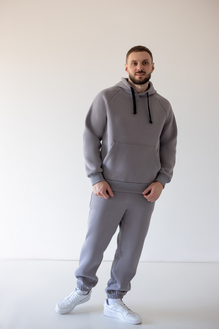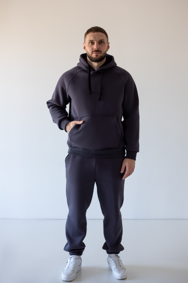 Базовий теплий костюм для чоловіків із триниткового футера з начосом. Костюм складається з худі та штанів з пришивним поясом на еластичній тасьмі, еластична тасьма по низу виробу сприяє щільному приляганню по щиколотці, для зручності використання в пояс вставлено шнурок. Худі модного зручного крою oversize, штани стандартного вільного ступеня прилягання. Полотно відмінної якості, не скачується, не линяє. Костюм дуже теплий, стане незамінним в гардеробі чоловіка прохолодної осені, навесні, а також в зимовий період під верхній одяг.