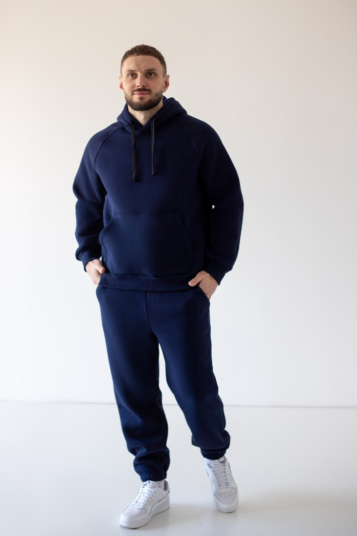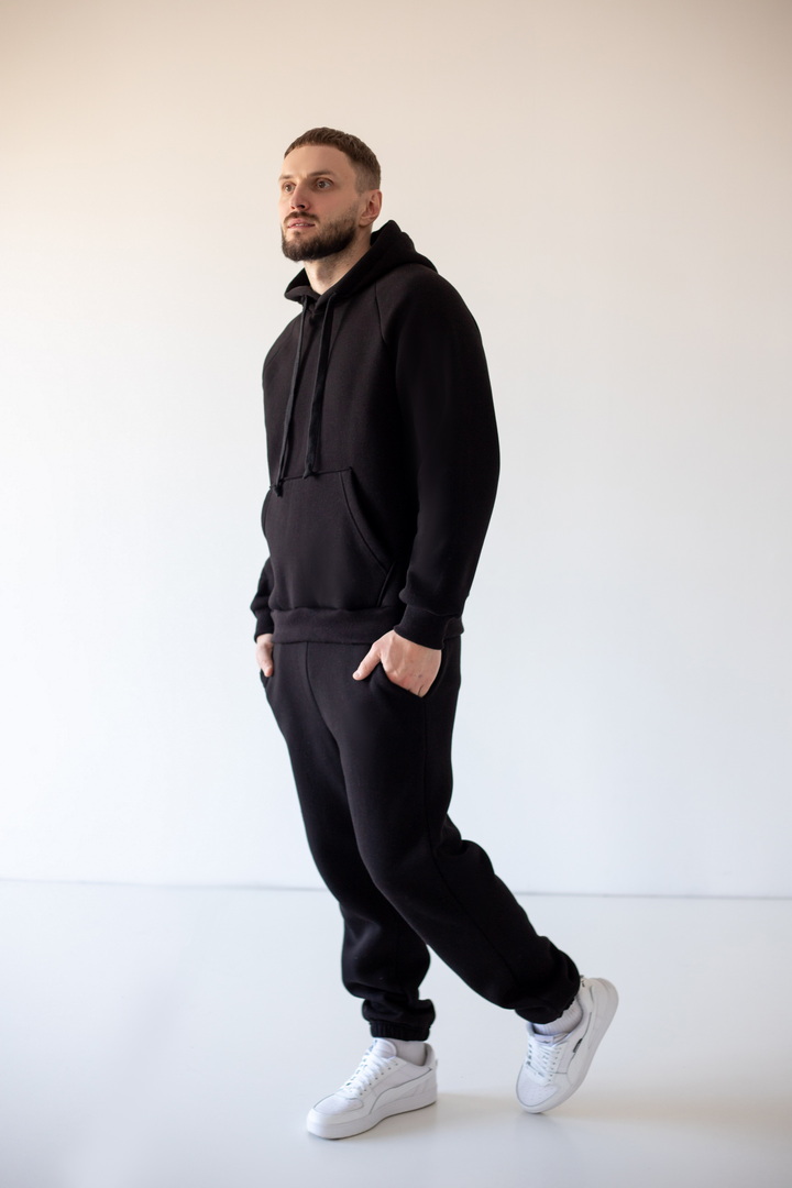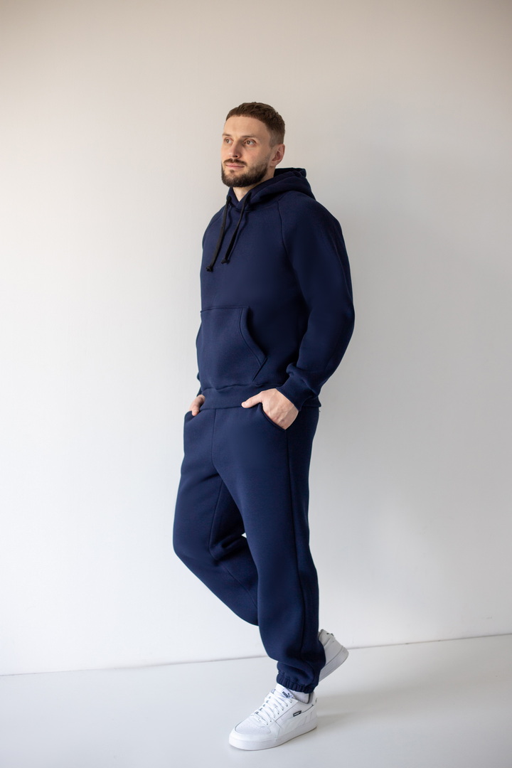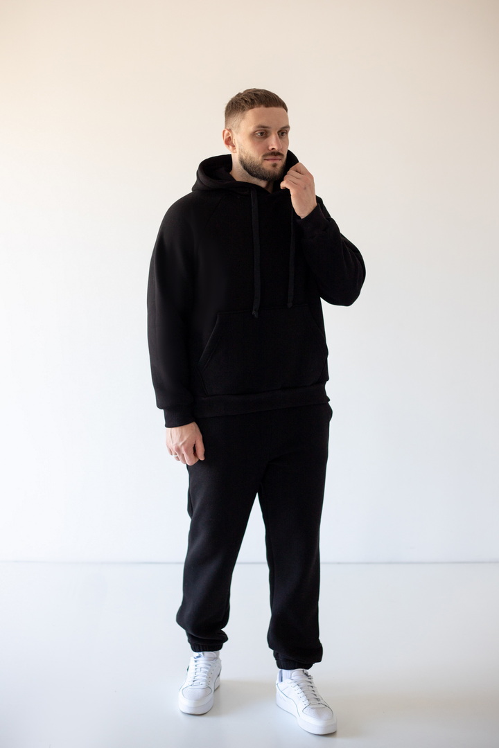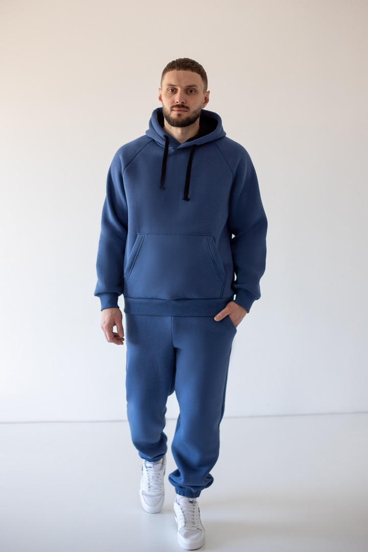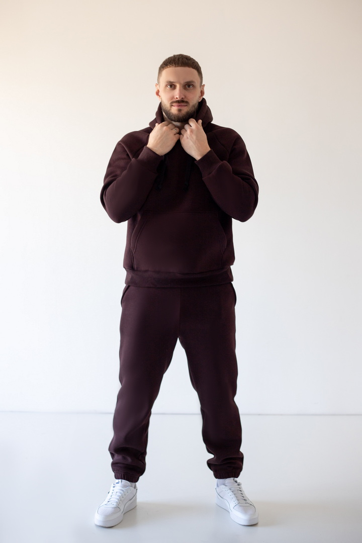 Базовий теплий костюм для чоловіків із триниткового футера з начосом. Костюм складається з худі та штанів з пришивним поясом на еластичній тасьмі, еластична тасьма по низу виробу сприяє щільному приляганню по щиколотці, для зручності використання в пояс вставлено шнурок. Худі модного зручного крою oversize, штани стандартного вільного ступеня прилягання. Полотно відмінної якості, не скачується, не линяє. Костюм дуже теплий, стане незамінним в гардеробі чоловіка прохолодної осені, навесні, а також в зимовий період під верхній одяг.