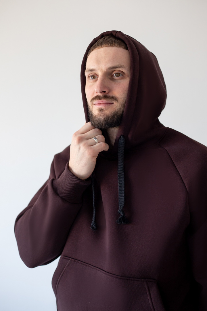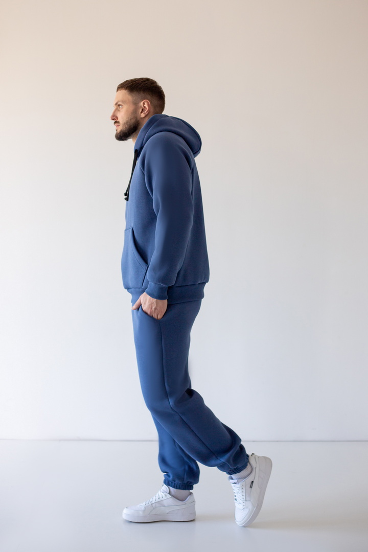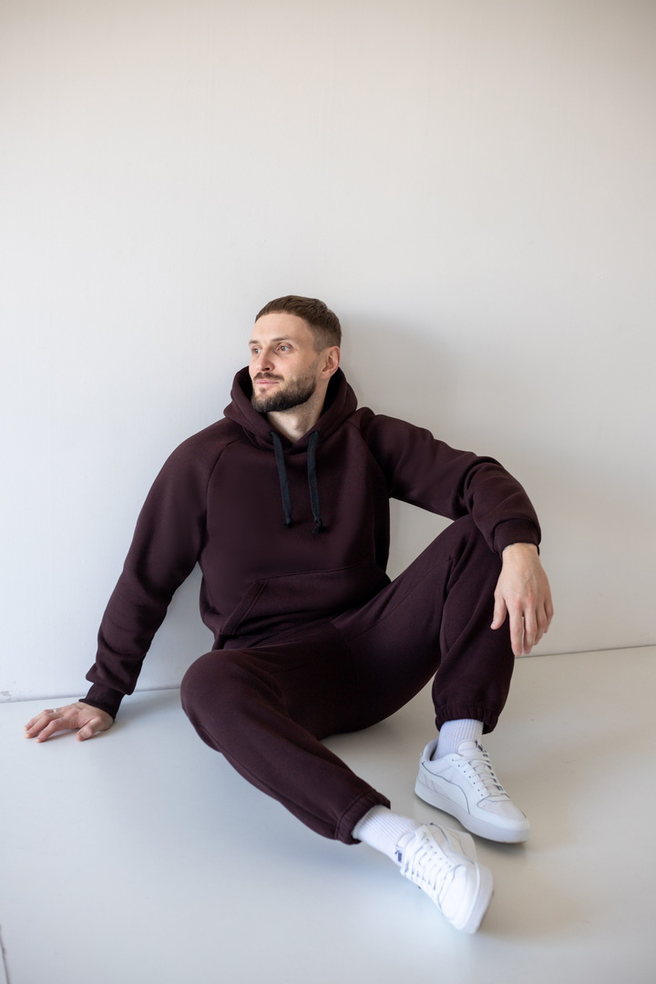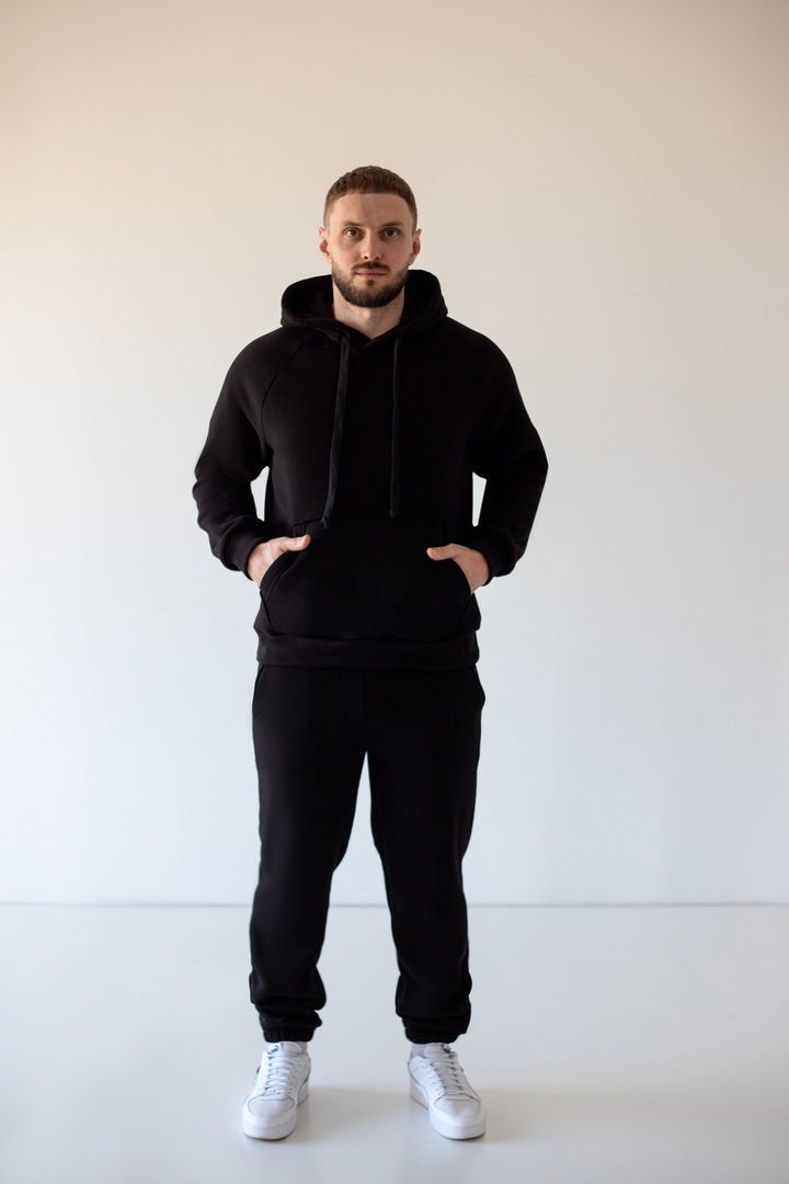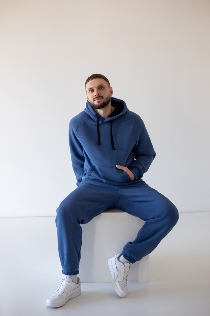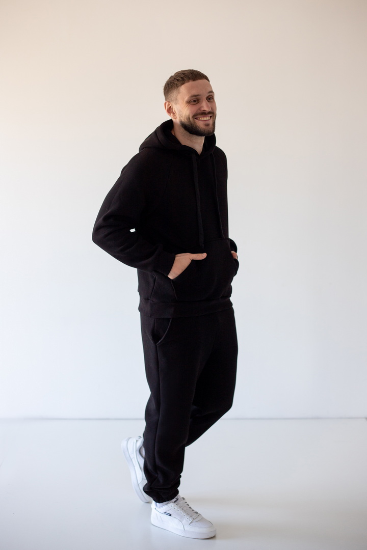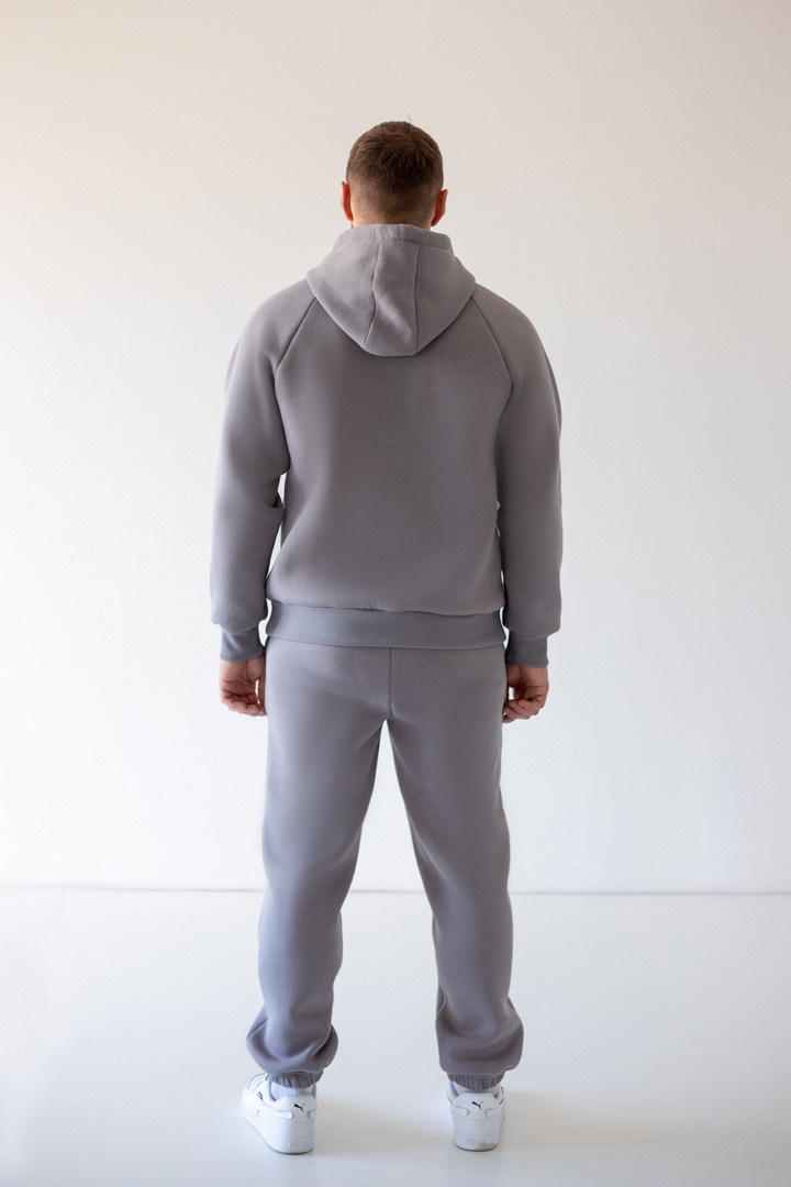 Базовий теплий костюм для чоловіків із триниткового футера з начосом. Костюм складається з худі та штанів з пришивним поясом на еластичній тасьмі, еластична тасьма по низу виробу сприяє щільному приляганню по щиколотці, для зручності використання в пояс вставлено шнурок. Худі модного зручного крою oversize, штани стандартного вільного ступеня прилягання. Полотно відмінної якості, не скачується, не линяє. Костюм дуже теплий, стане незамінним в гардеробі чоловіка прохолодної осені, навесні, а також в зимовий період під верхній одяг.