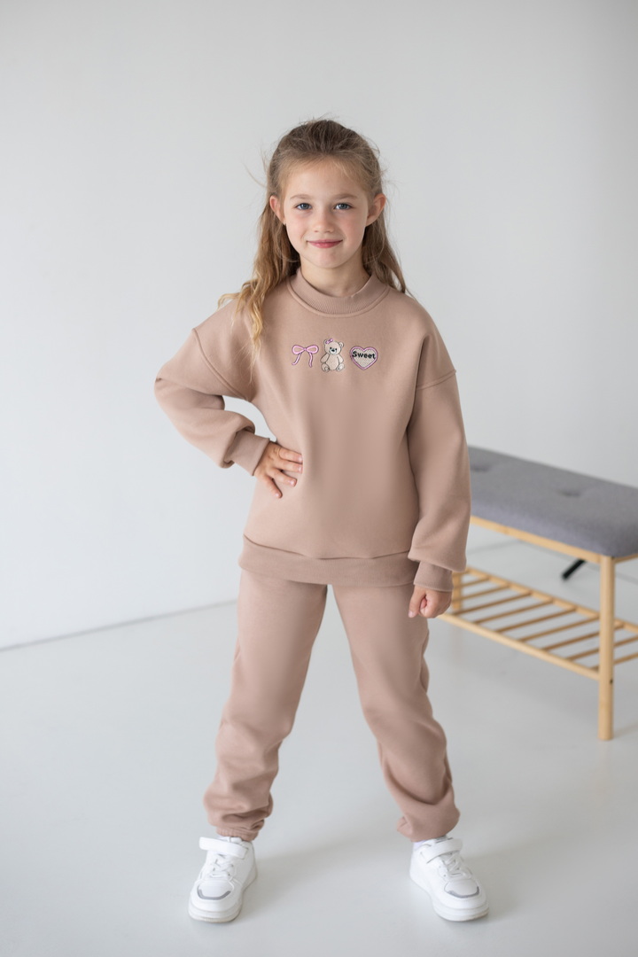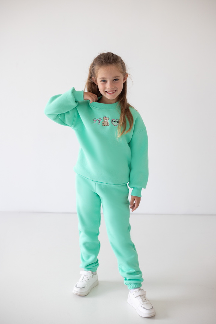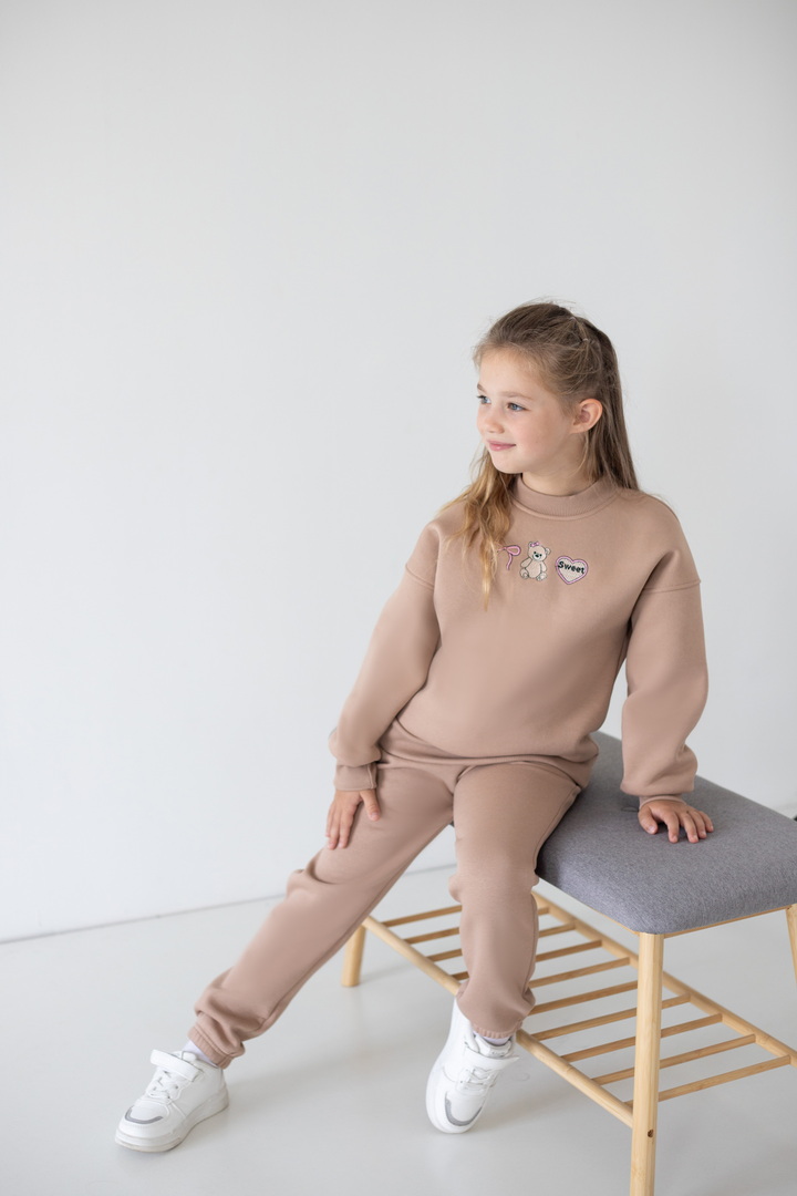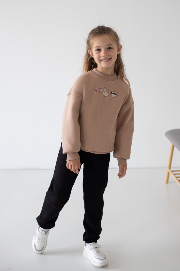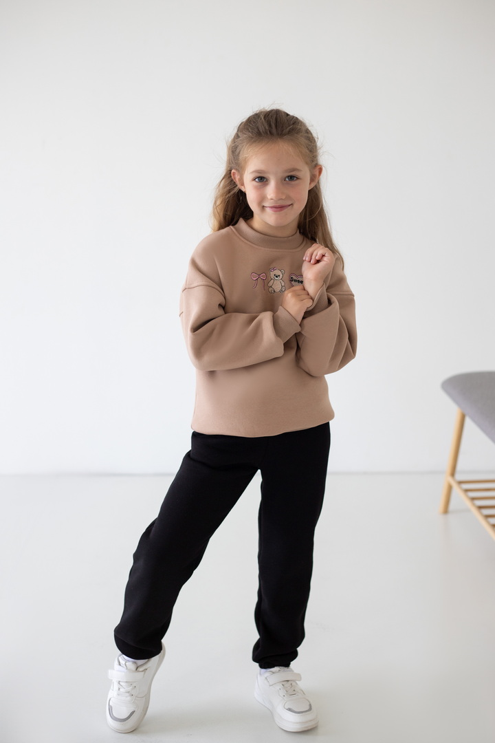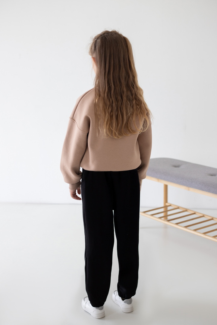 Базові штани для дівчаток з теплого триниткового футера з начосом. Модель з кишенями, на еластичній тасьмі по низу, з широким поясом з еластичною тасьмою, відстрочкою і шнурками. Штани виконані в різних кольорах на будь-який смак. Полотно щільне, має гарні теплоізоляційні властивості, при правильному догляді може давати незначну усадку після прання.