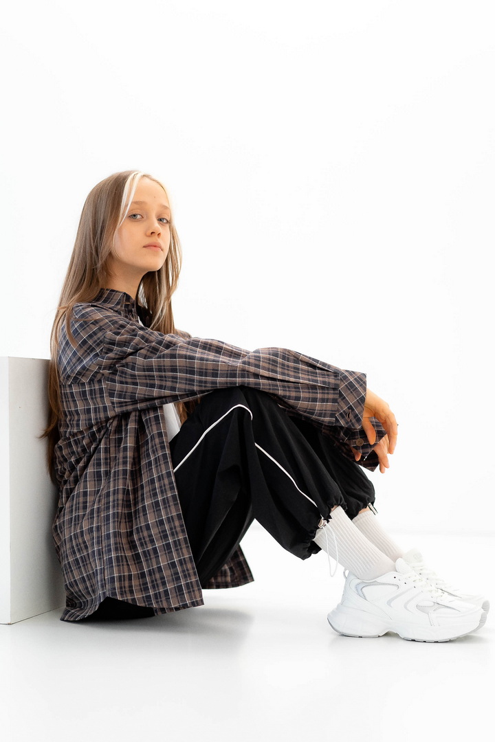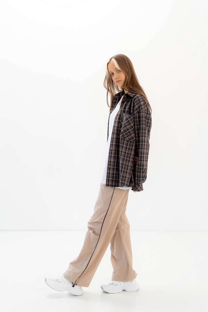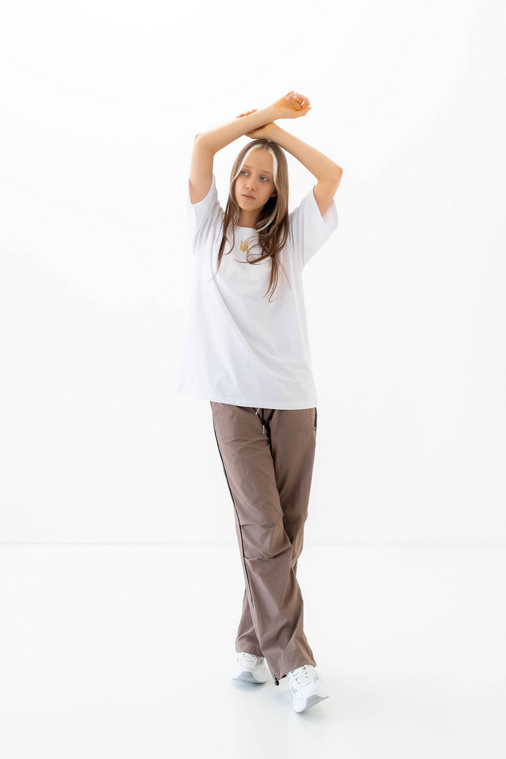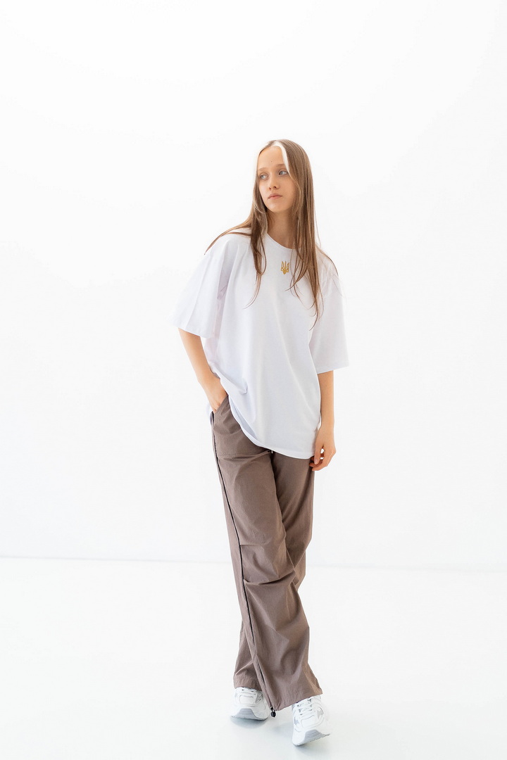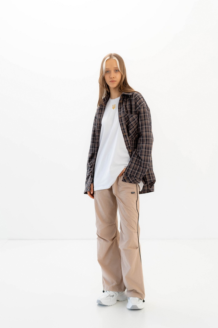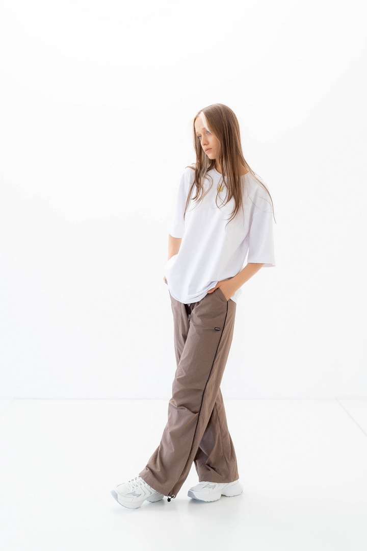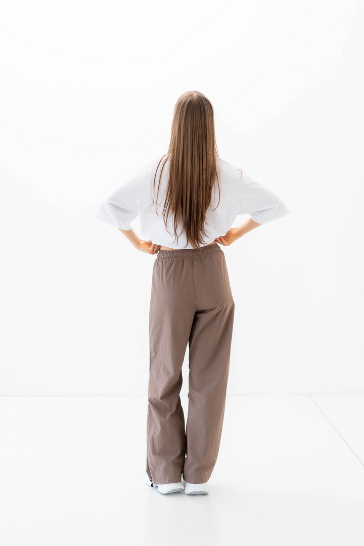 Стильні штани для дівчат із високою посадкою. Модель виготовлена з полотна "Плащівка", пояс на резинці із шнурком, ефектності додають затяжки внизу виробу, які можна призібрати. Штани не тільки стильна, а й універсальна річ, їх можна носити по-різному, створювати модні та трендові образи. Прекрасно комбінуються з футболками, щоб завершити образ можна додати розстебнутою сорочкою, джинсовою курткою. Також з такими брюками чудово комбінується спортивне взуття.