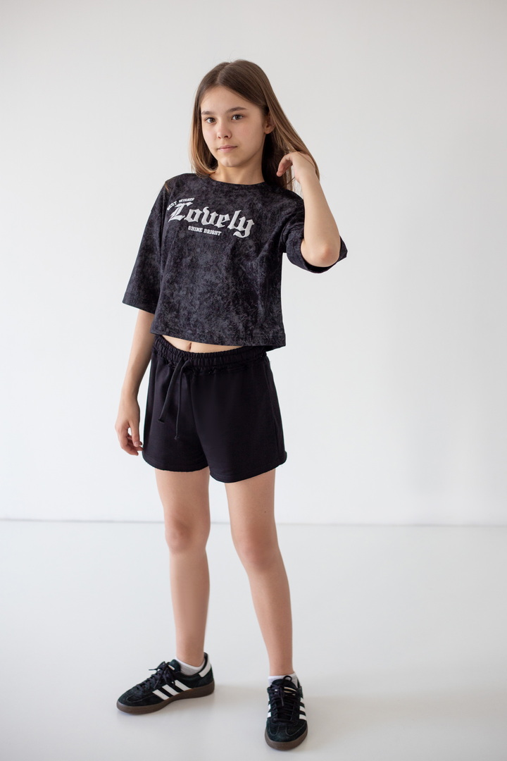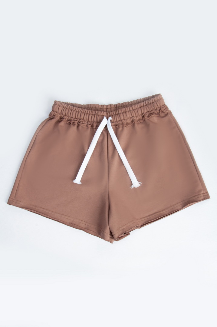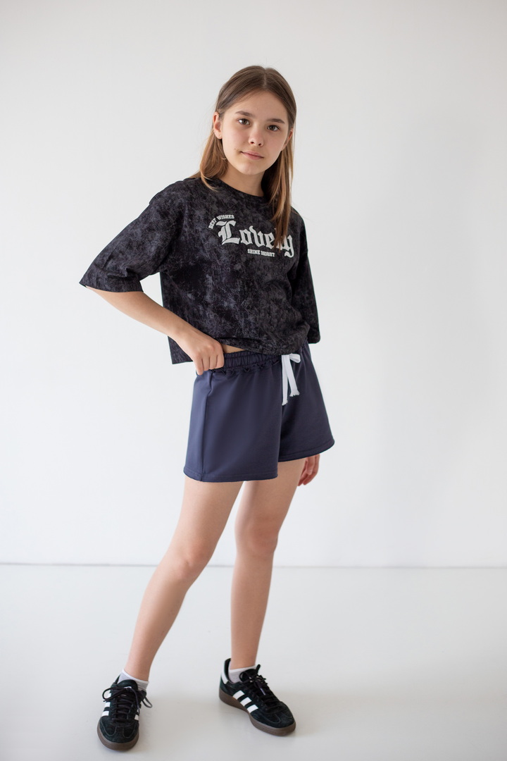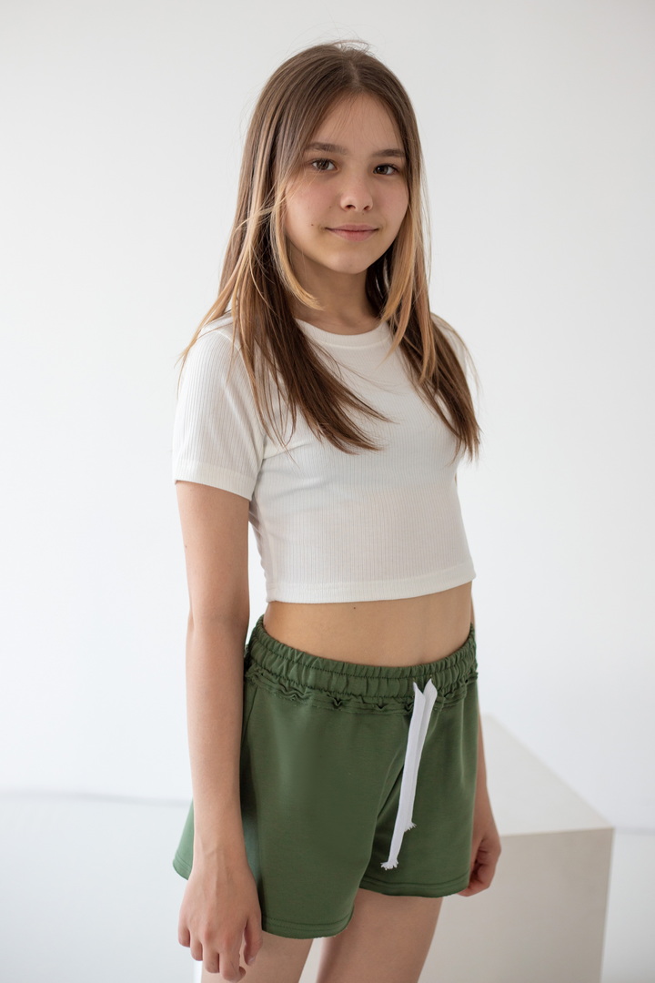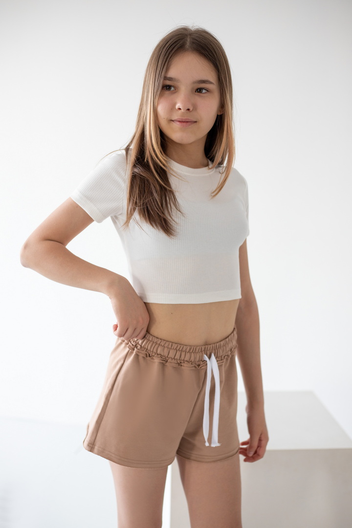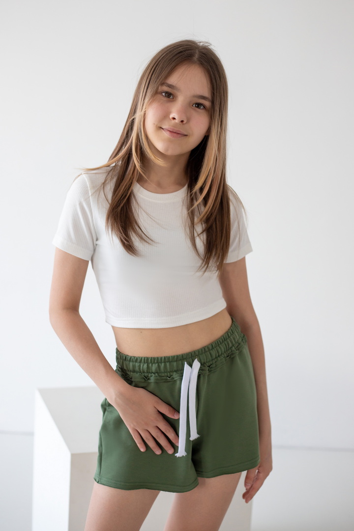 Базові літні шорти для дівчат-підлітків з двониткового футера. Модель стандартної посадки, з кишенями, пришивним поясом з широкою еластичною тасьмою, відстрочкою і шнурком. Шорти універсальні, підходять для носіння з будь-якою футболкою, топом. Полотно хорошої якості, не скачується.