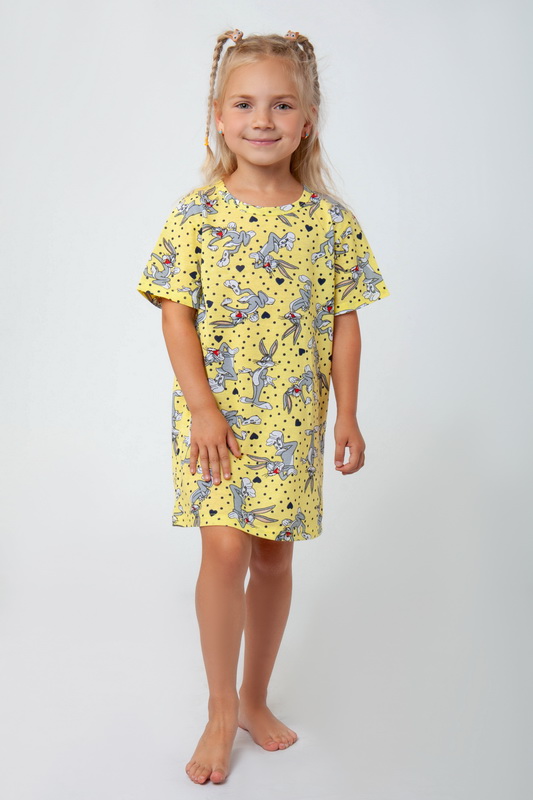Базова нічна сорочка для дівчаток з принтованого куліру. Модель вільного крою з короткими рукавами і округлим вирізом. Сорочка може використовуватися також в якості домашньої сукні. Полотно натуральне за складом, може давати усадку після прання.