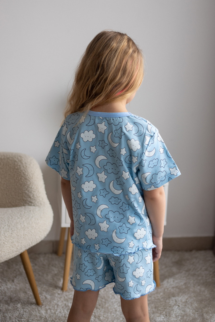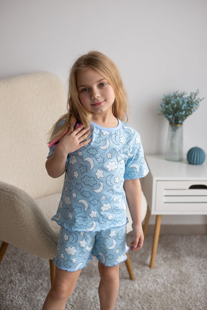 Легка зручна піжама для дівчаток з принтованого куліру. Модель вільного крою, складається з футболки з короткими рукавами, зі спущенною лінією плеча, округлою горловиною, а також шорт на еластичній тасьмі. Завдяки натуральному складу полотна (100% бавовна) ця піжама стане улюбленою річчю в домашньому гардеробі дівчаток.