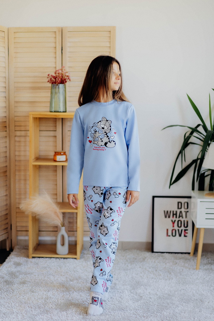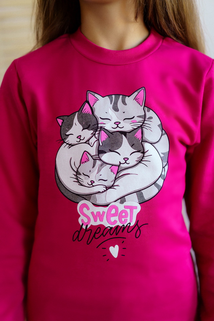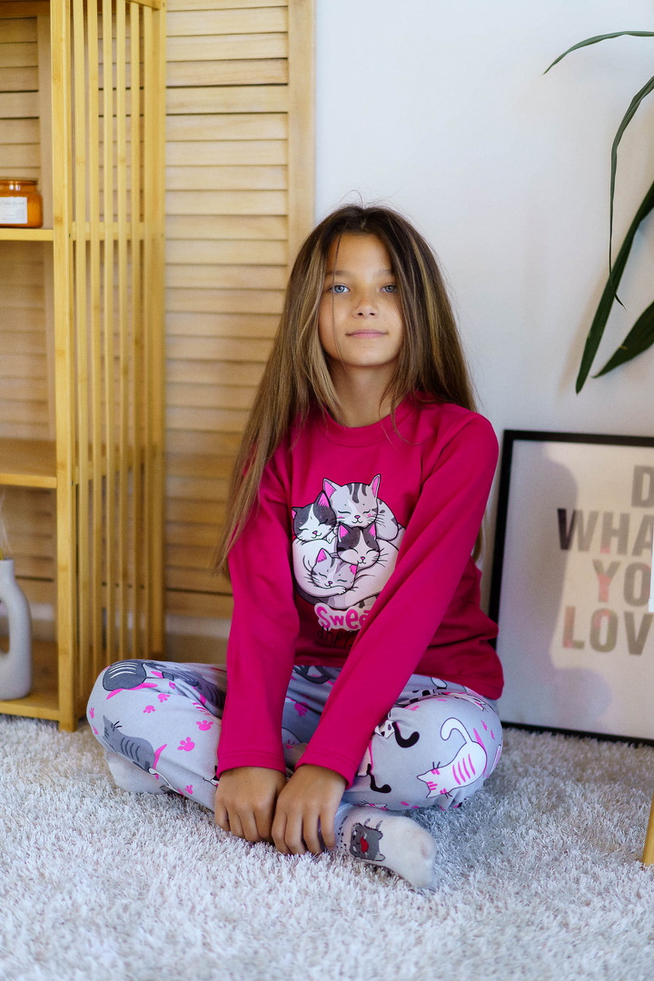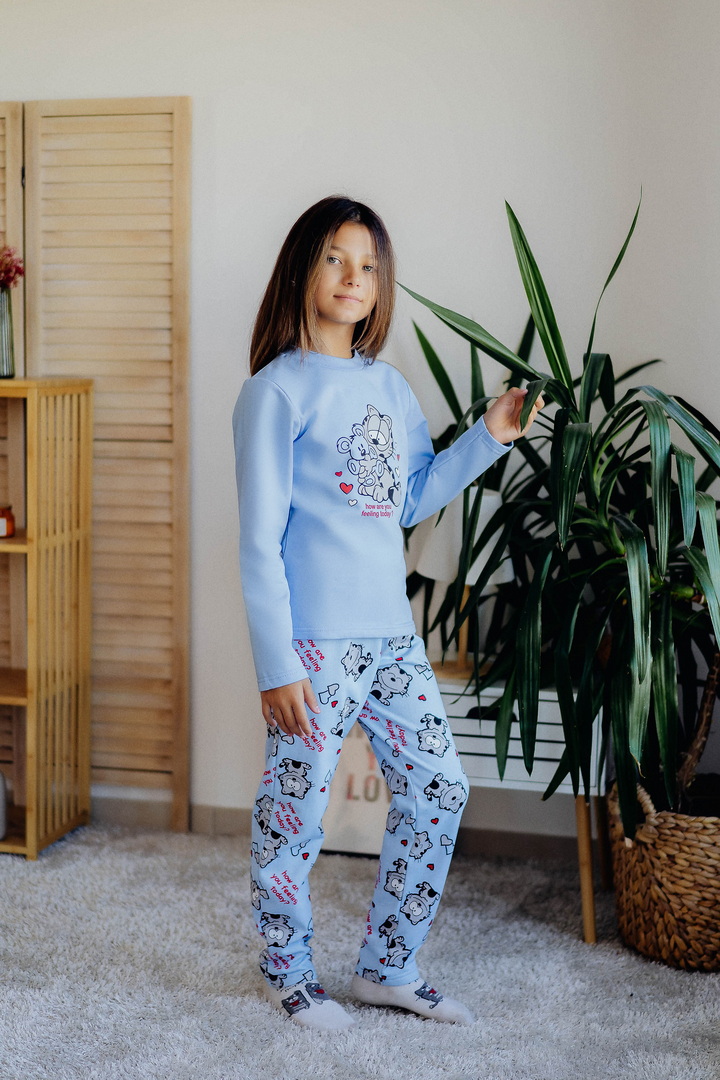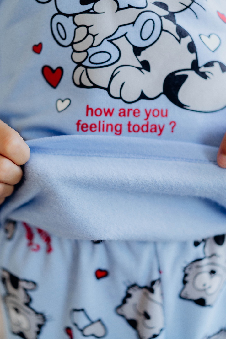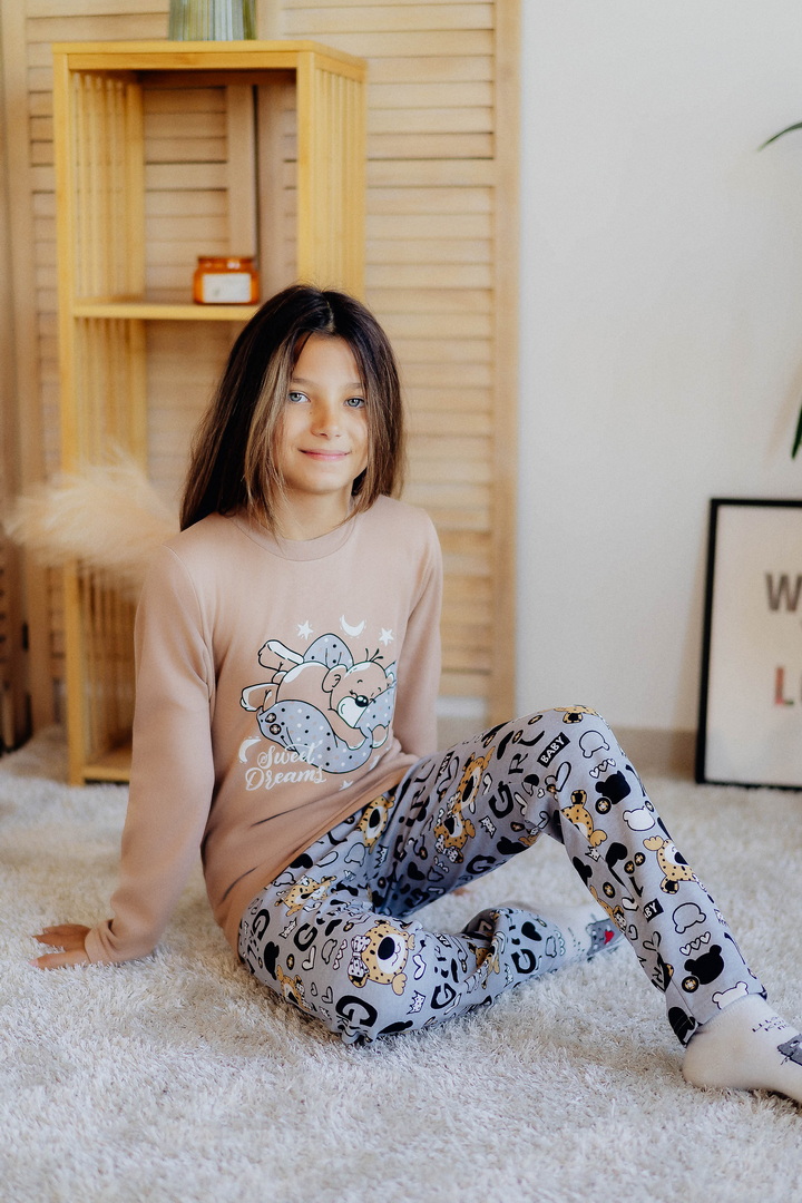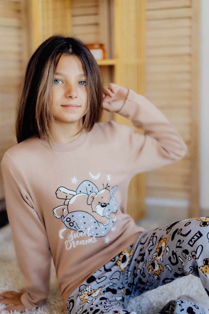 Тепла піжама для дівчаток з футера з начосом, з принтом, виконаним методом шовкотрафаретного друку. Кофта з довгими рукавами і округлим вирізом з однотонного полотна світлих кольорів. Штани прямі на еластичній тасьмі по талії, виконані з яскравого принтованого полотна. Футер з начосом натуральний за складом, дуже приємний до тіла, дає усадку після прання. Рекомендується строго дотримуватися температурного режиму при пранні (при підвищенні температури значно збільшується усадка - до 7см).