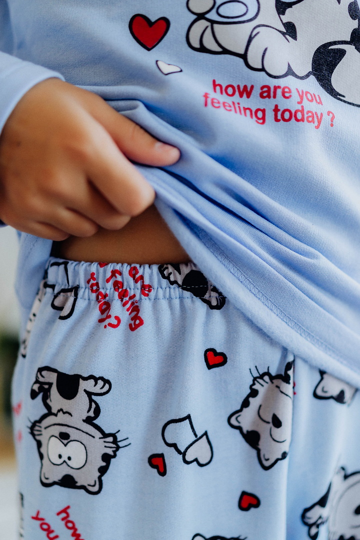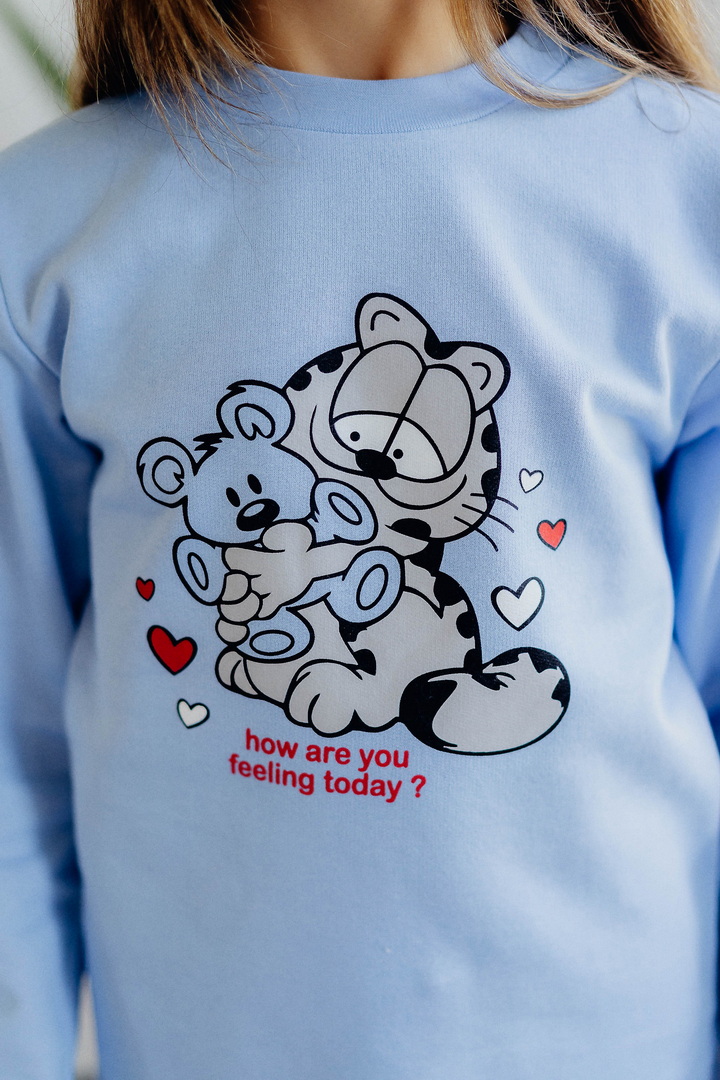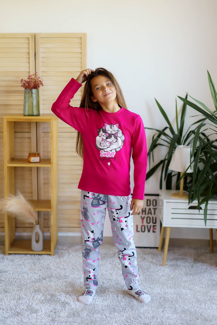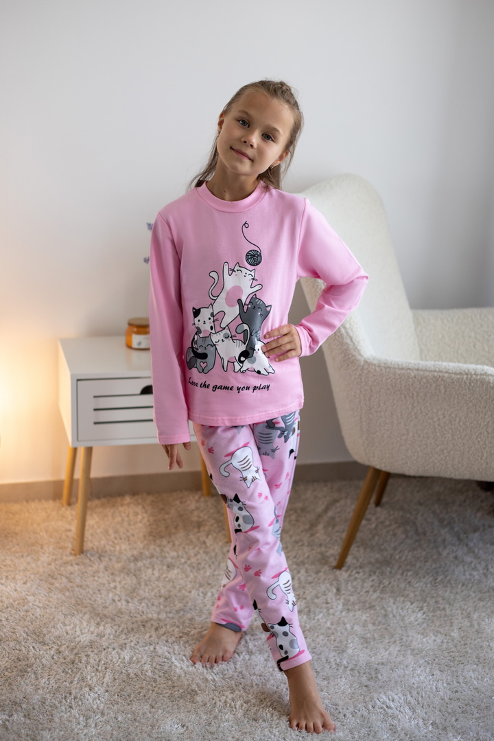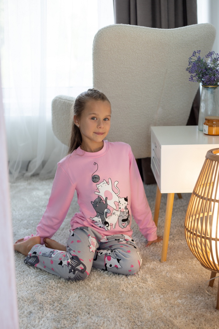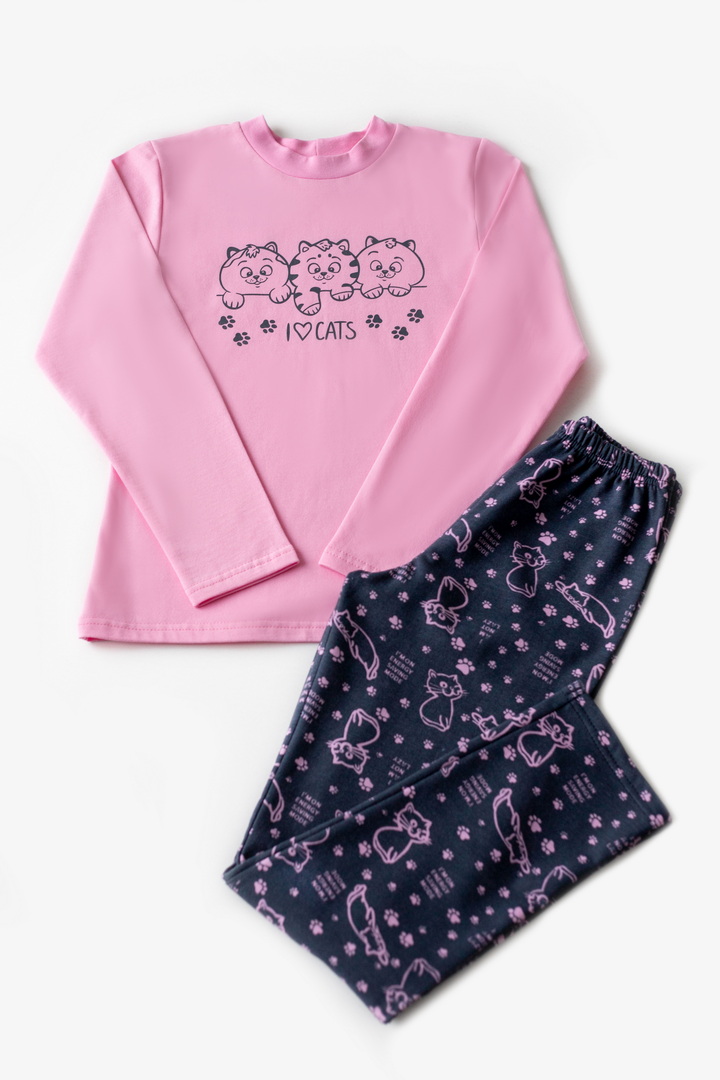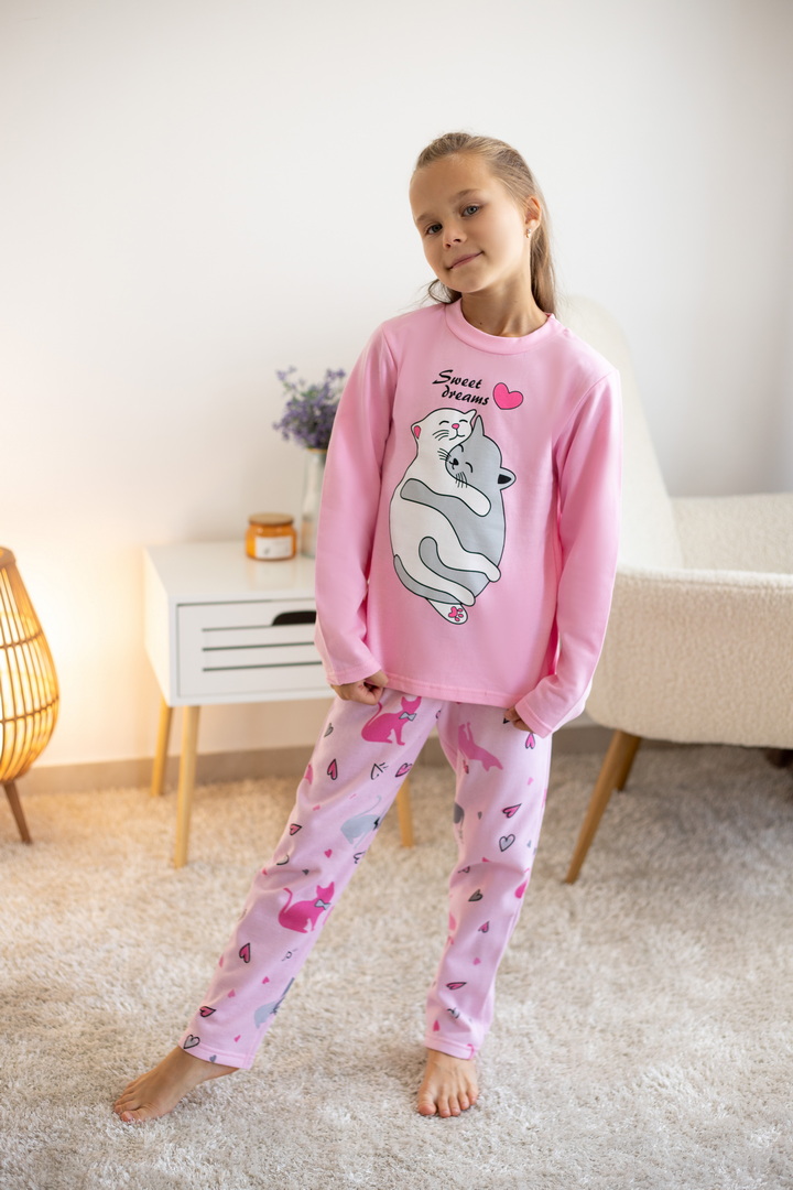 Тепла піжама для дівчаток з футера з начосом, з принтом, виконаним методом шовкотрафаретного друку. Кофта з довгими рукавами і округлим вирізом з однотонного полотна світлих кольорів. Штани прямі на еластичній тасьмі по талії, виконані з яскравого принтованого полотна. Футер з начосом натуральний за складом, дуже приємний до тіла, дає усадку після прання. Рекомендується строго дотримуватися температурного режиму при пранні (при підвищенні температури значно збільшується усадка - до 7см).