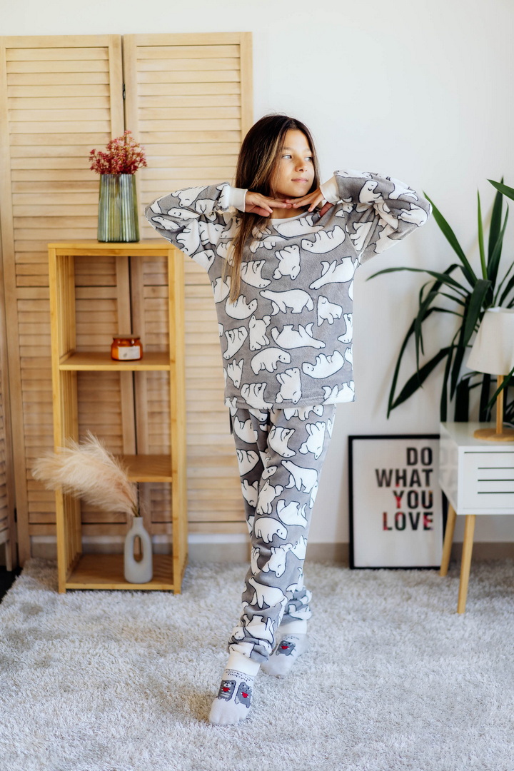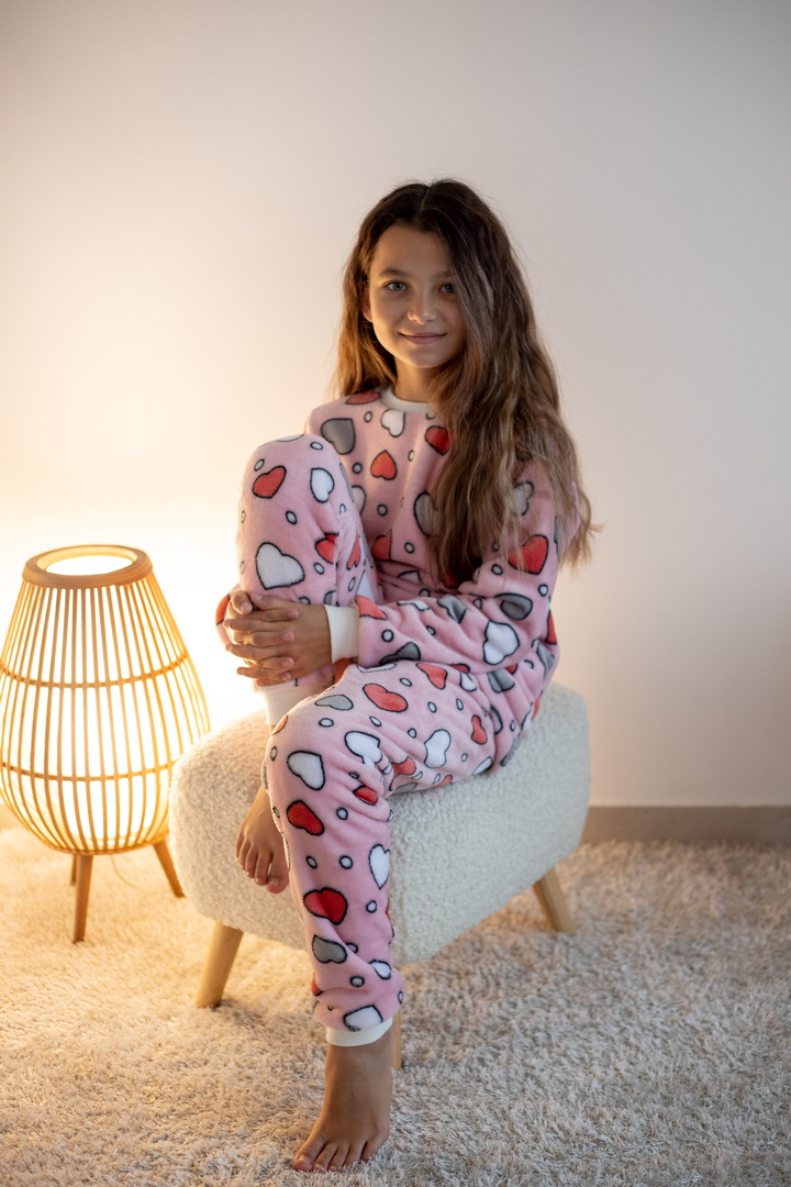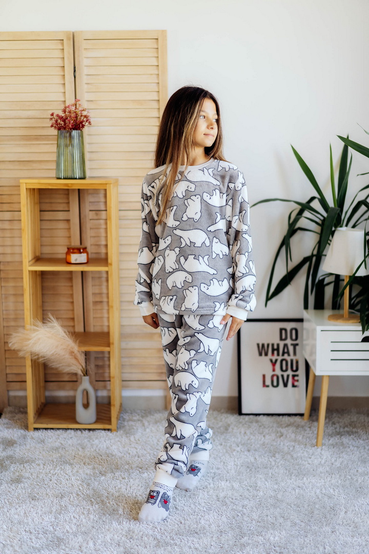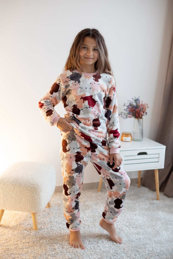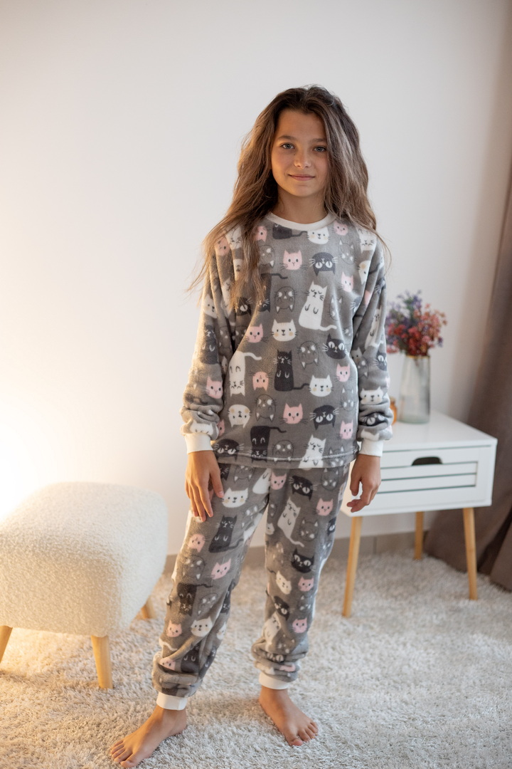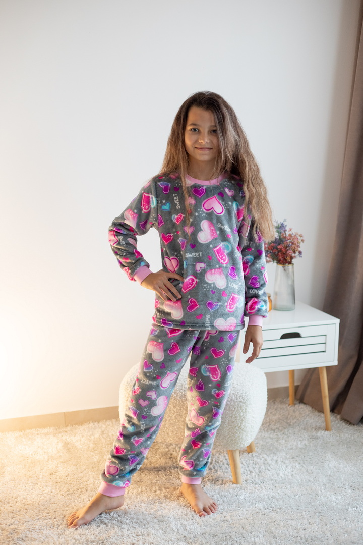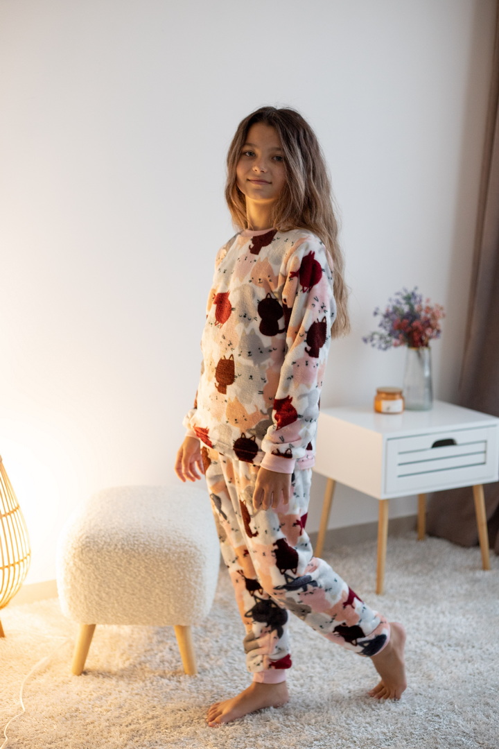 Затишна піжама для дівчаток-підлітків із м'якої махри – ідеальний вибір для холодного сезону. Піжама складається з джемпера та штанів (рукава та низ штанин на еластичних манжетах для зручності у використанні). Теплий домашній одяг та одяг для сну часто виготовляється саме з махри. Така тканина приємна до тіла, добре зберігає тепло в холодну пору року і дає шкірі можливість дихати – тому комфортний та здоровий сон вам забезпечений. Стильний та практичний варіант для дому, сну та відпочинку.