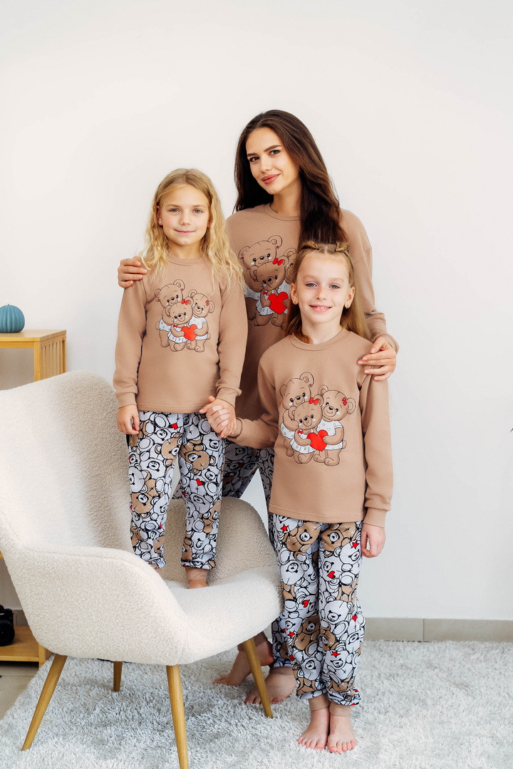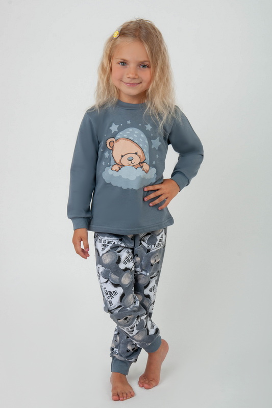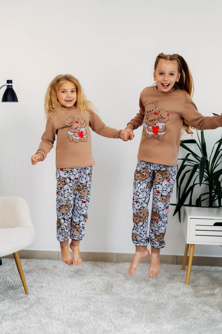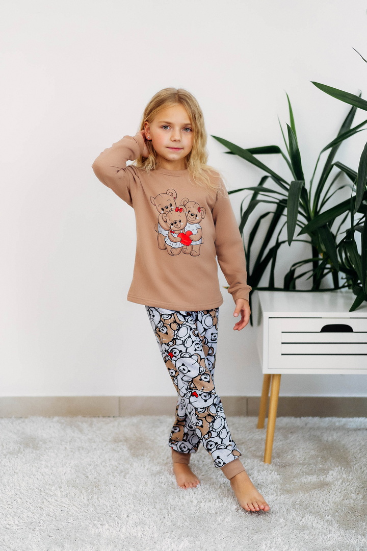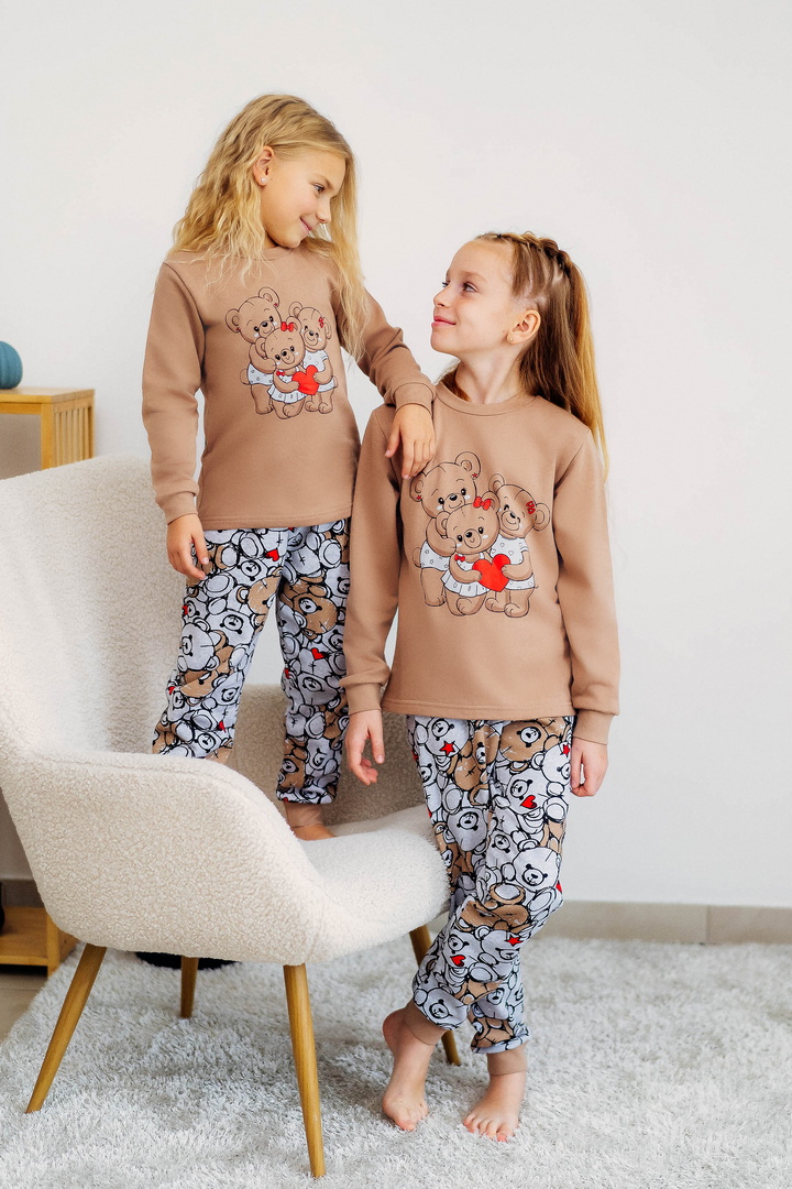 Утеплена піжама для дівчат із футера з начісом, складається з кофти (довгий рукав на манжетах) і коміром-стійкою та прямих штанів на манжетах з широкою гумкою.  Модель виконана в комбінації однотонного полотна з набивним, стильний на кофті малюнок. Комплект може використовуватися як домашній костюм. Можна створити образ family look з моделями 2681, 2682. Полотно якісне, з натуральним складом, має гарну теплоізоляцію, м'який начос приємний до тіла.