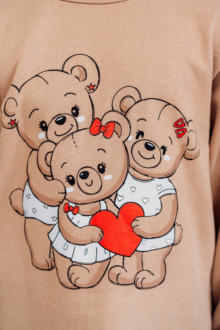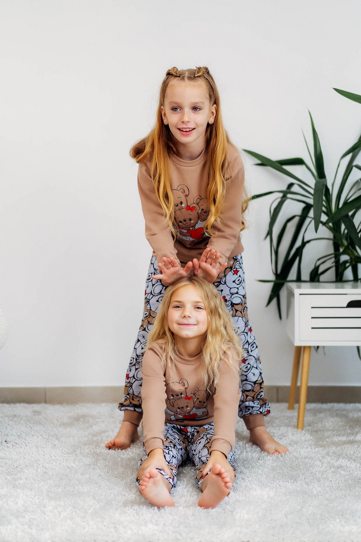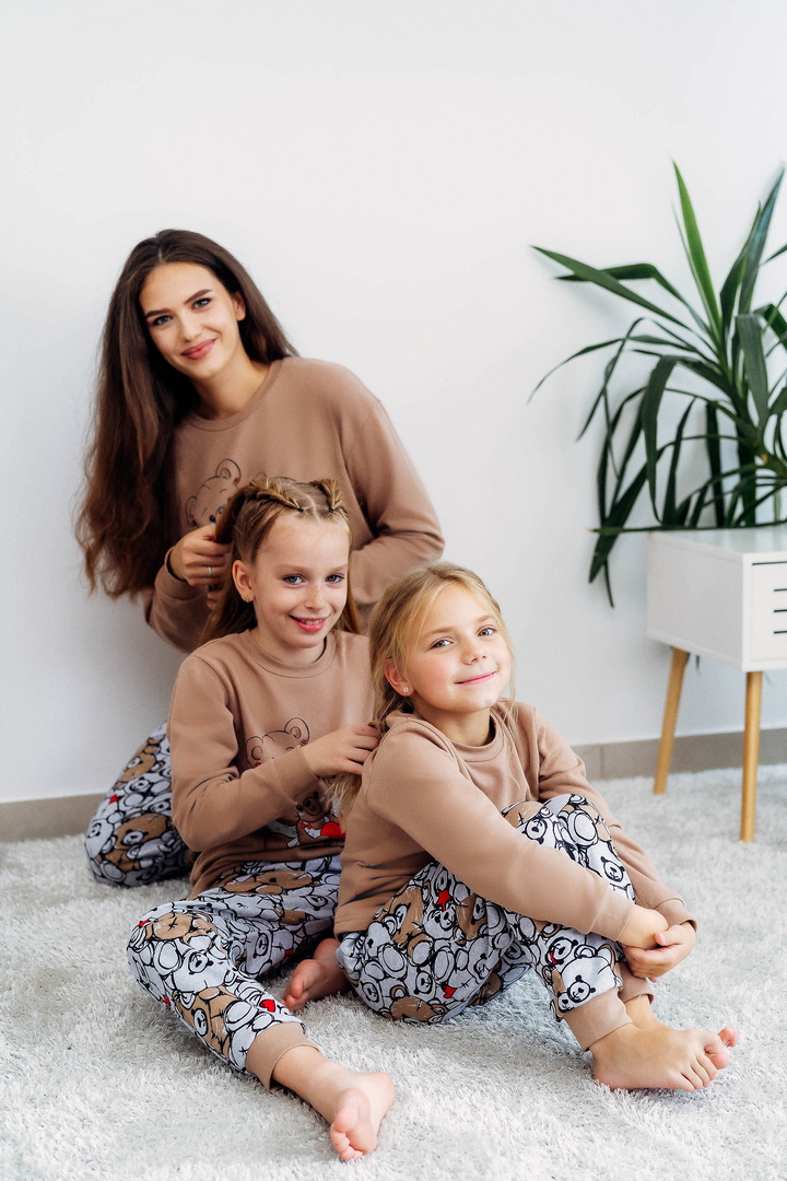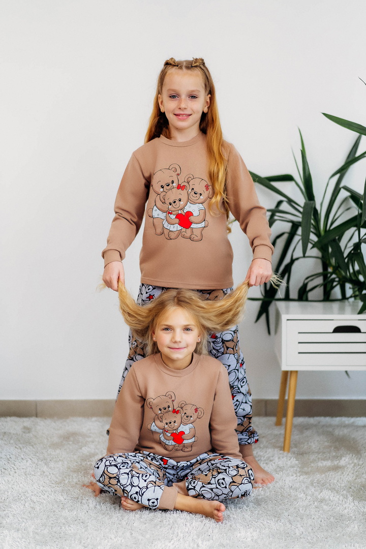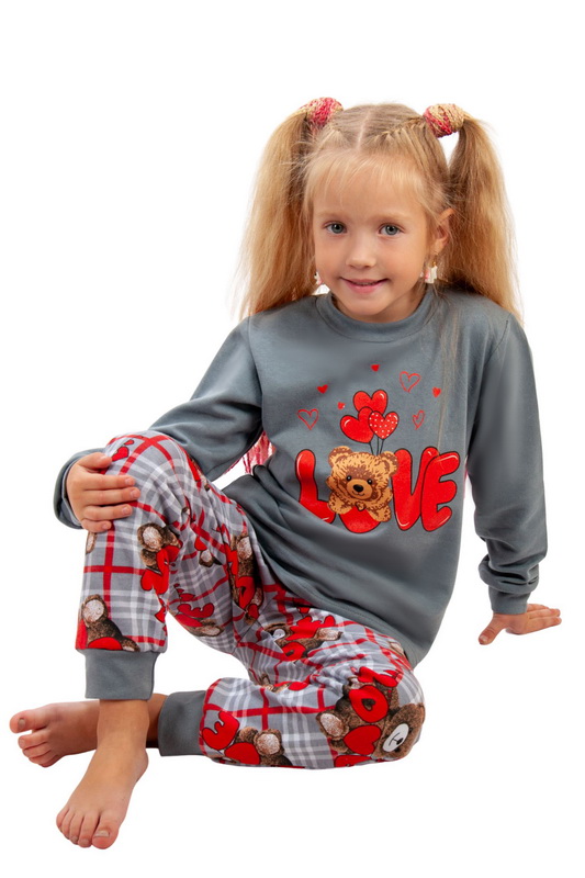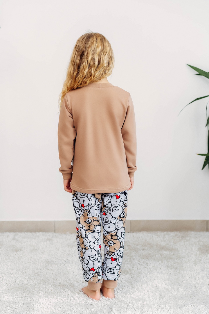 Утеплена піжама для дівчат із футера з начісом, складається з кофти (довгий рукав на манжетах) і коміром-стійкою та прямих штанів на манжетах з широкою гумкою.  Модель виконана в комбінації однотонного полотна з набивним, стильний на кофті малюнок. Комплект може використовуватися як домашній костюм. Можна створити образ family look з моделями 2681, 2682. Полотно якісне, з натуральним складом, має гарну теплоізоляцію, м'який начос приємний до тіла.
