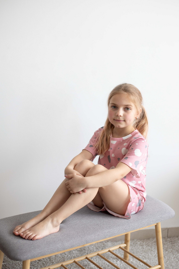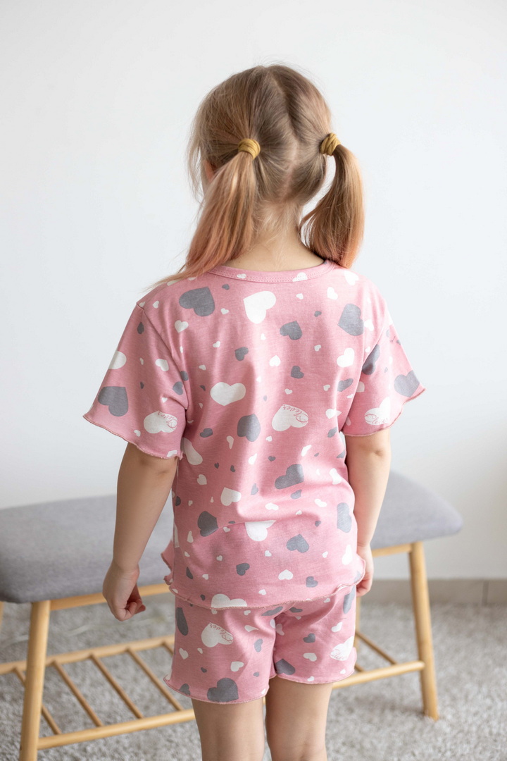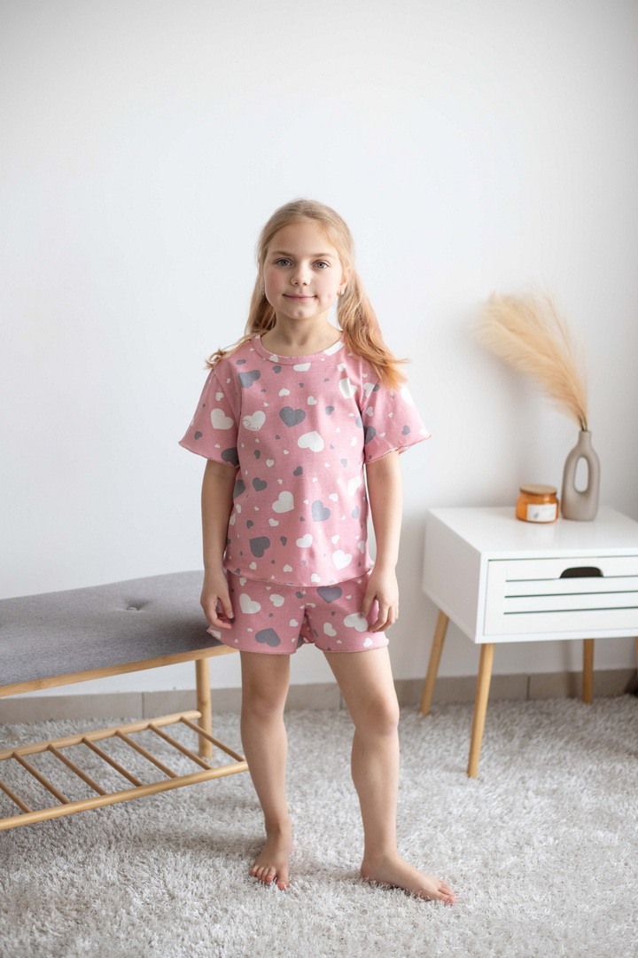 Легка, як літній вітерець, і ніжна, як ранковий сон — ця піжама створена для тих моментів, коли дитинство наповнене затишком і безтурботністю. Комплект із футболки та шортиків дарує максимальний комфорт завдяки м’якому набивному куліру, який лагідно огортає шкіру та дозволяє їй вільно дихати. Тканина приємно торкається тіла, не парить і чудово підходить як для теплого вечора, так і для солодкого нічного відпочинку. Футболка з акуратною горловиною та легким вільним силуетом виглядає невимушено та сучасно, а шортики з еластичним поясом забезпечують повну свободу — хоч для сну, хоч для домашніх пригод. Дизайн наповнений настроєм радості: милі принти додають образу грайливості, підкреслюючи дитячу щирість і легкість. Це не просто одяг для сну — це маленька історія про комфорт, тепло та щасливі миті вдома.