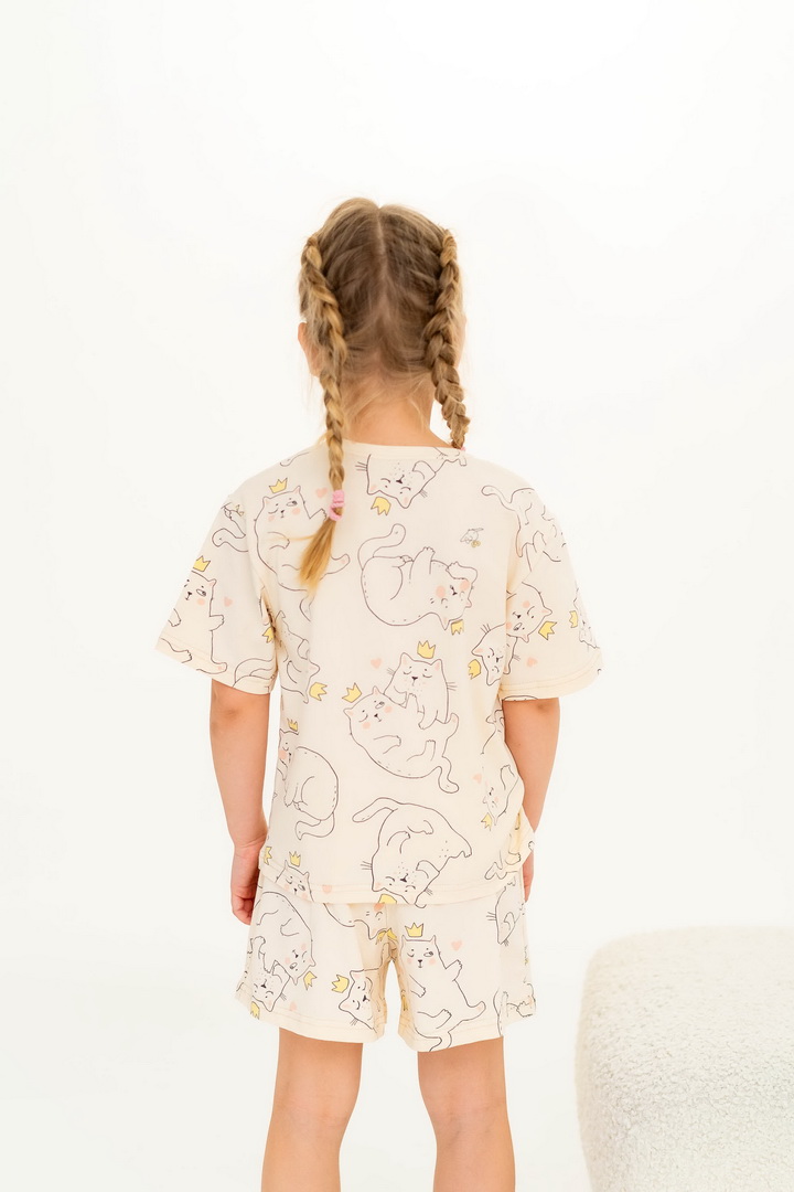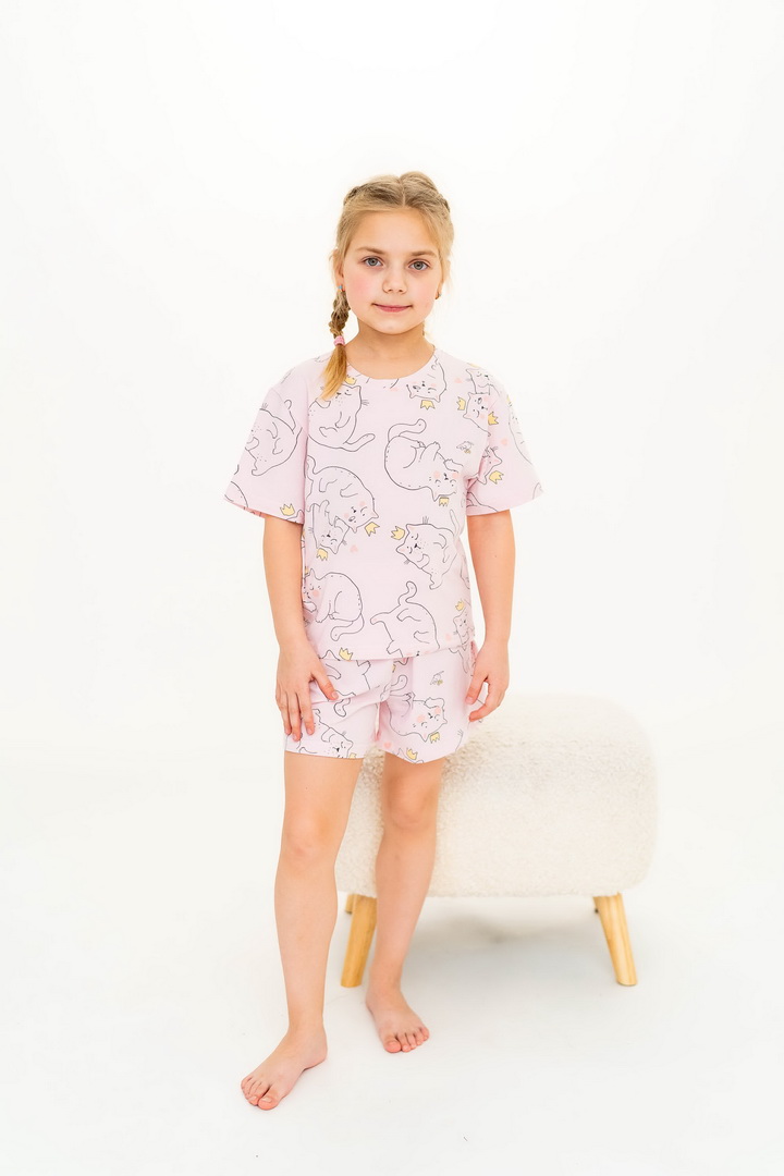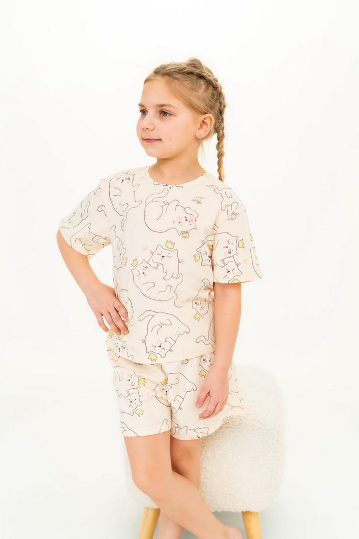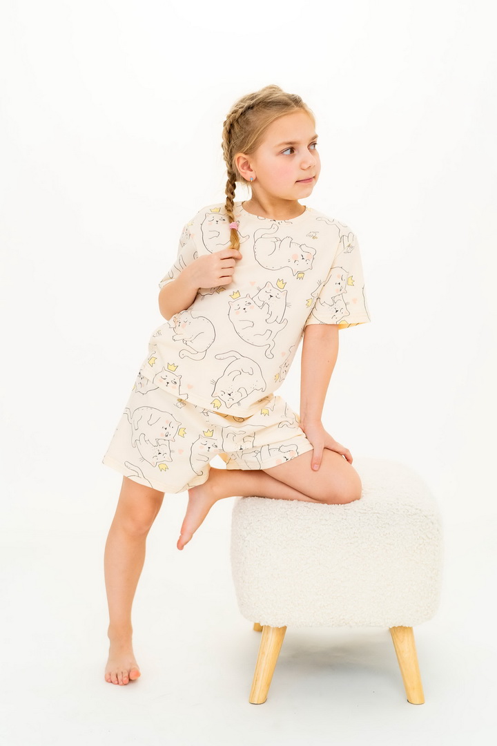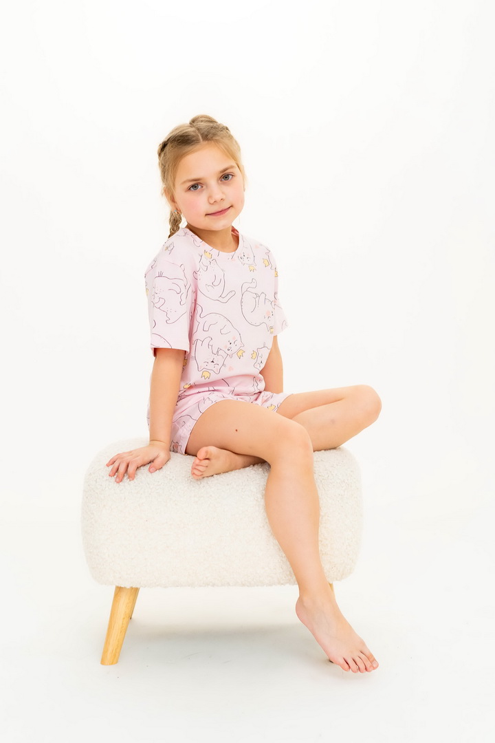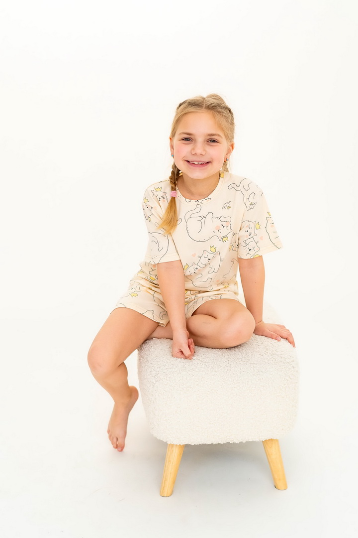 Ця піжама для дівчаток зі стрейч-куліру пеньє створена для тих моментів, коли дім наповнюється теплом, а вечір перетворюється на казку. Вона ніжно огортає тіло — дитина спить спокійно, а батьки впевнені у комфорті. Комплект складається з легкої футболки та зручних шортиків із м’якою посадкою. Тканина пеньє — це якісна бавовна з ідеально гладкою поверхнею, яка приємна навіть для найчутливішої шкіри. Завдяки еластану, піжама добре тягнеться та не втрачає форму. Ніжний, милий принт додає настрою та робить піжаму улюбленою річчю — саме тією, яку дитина хоче вдягати знову і знову. Лаконічний дизайн дозволяє носити комплект не лише для сну, а й для домашніх ігор чи ранкових обіймів. Також є можливість придбати схожу модель жіночої піжами для створення Family look.