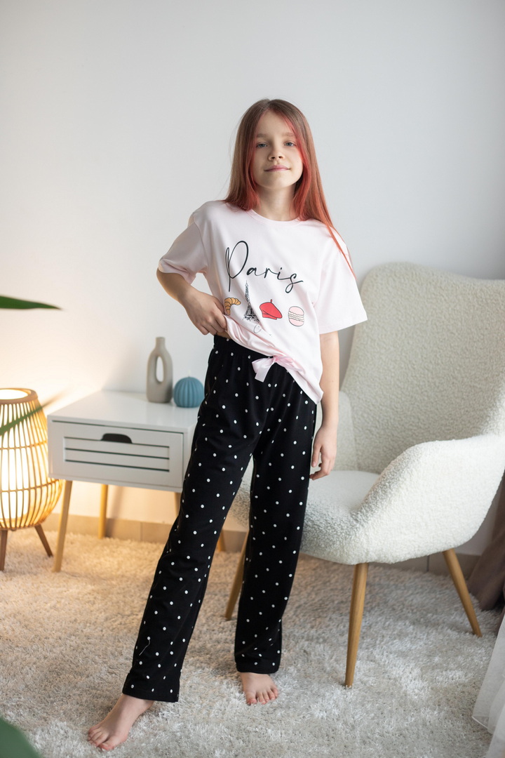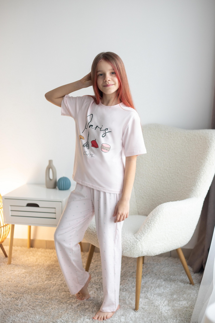 Домашній комплект для дівчат зі стрейч-кулір пеньє — це про комфорт, легкість та настрій. Ідеальний варіант для затишних днів вдома, активних ігор та солодких моментів відпочинку. Футболка має вільний крій та дарує відчуття повної свободи. М’яка тканина ніжно торкається шкіри, не викликає подразнень і забезпечує максимальний комфорт. Стильний принт додає образу грайливості та робить комплект яскравим і сучасним. Штани прямого крою зручно сідають по фігурі завдяки еластичному поясу. Вони не тиснуть, добре тримаються та дозволяють дитині залишатися активною протягом усього дня — від домашніх справ до веселих ігор. Стрейч-кулір пеньє — це високоякісна бавовняна тканина з додаванням еластичних волокон. Вона відзначається м’якістю, гладкою поверхнею та відмінною повітропроникністю. Цей комплект створений для комфорту — стильний, практичний і водночас дуже затишний. Ідеальний вибір для дому, сну або просто гарного настрою.