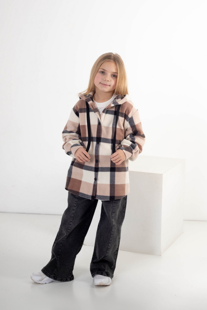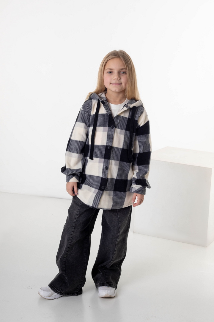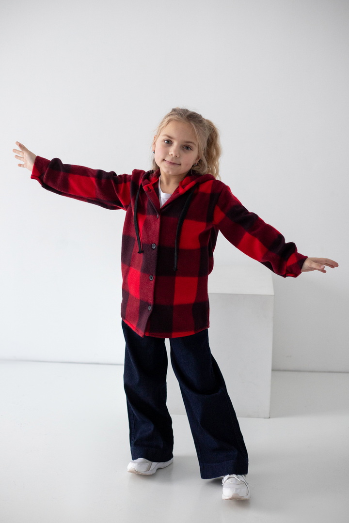 Флісова сорочка для дівчат — це стильне та надзвичайно комфортне рішення для прохолодної пори року. Модель поєднує в собі зручність куртки та легкість сорочки, що робить її універсальною. Виготовлена з флісу — м’якого, приємного до тіла полотна, яке чудово зберігає тепло. Сорочка має вільний крій, застібку на ґудзики, що забезпечує легке одягання, а капюшон додає практичності та захисту від прохолоди й вітру. Класичний клітинний дизайн виглядає стильно та сучасно. Флісова сорочка — практична, тепла та модна.