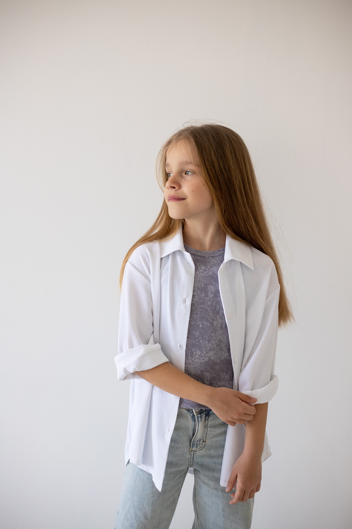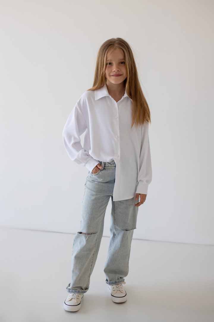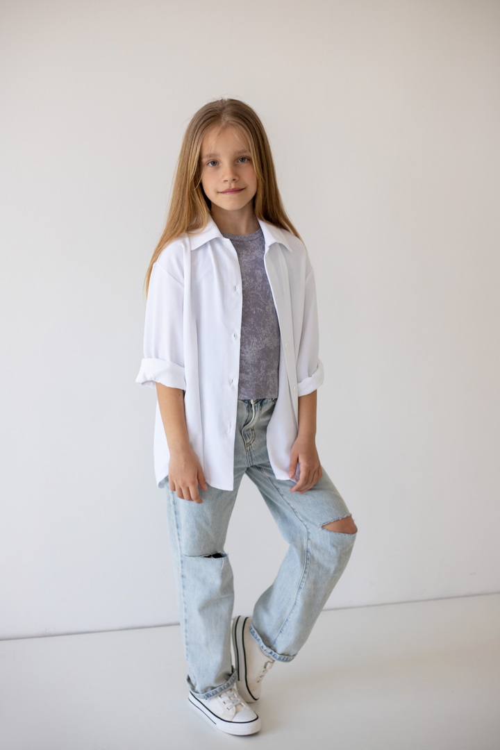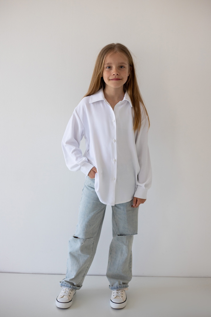 Стильна сорочка для дівчат, виконана з легкого, повітрянного полотна "Американський креп". Сорочка застібається на гудзики. Така сорочка дуже актуальна цього літа, її легко поєднувати з будь-яким взуттям - кросівки, босоніжки, лофери. Щоб довершити образ, можна одягнути під розстібнуту сорочку однотонну майку, футболку або топ, та поєднати з брюками, спідницею та джинсами.