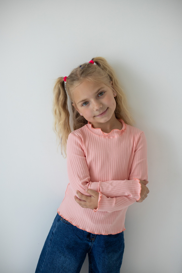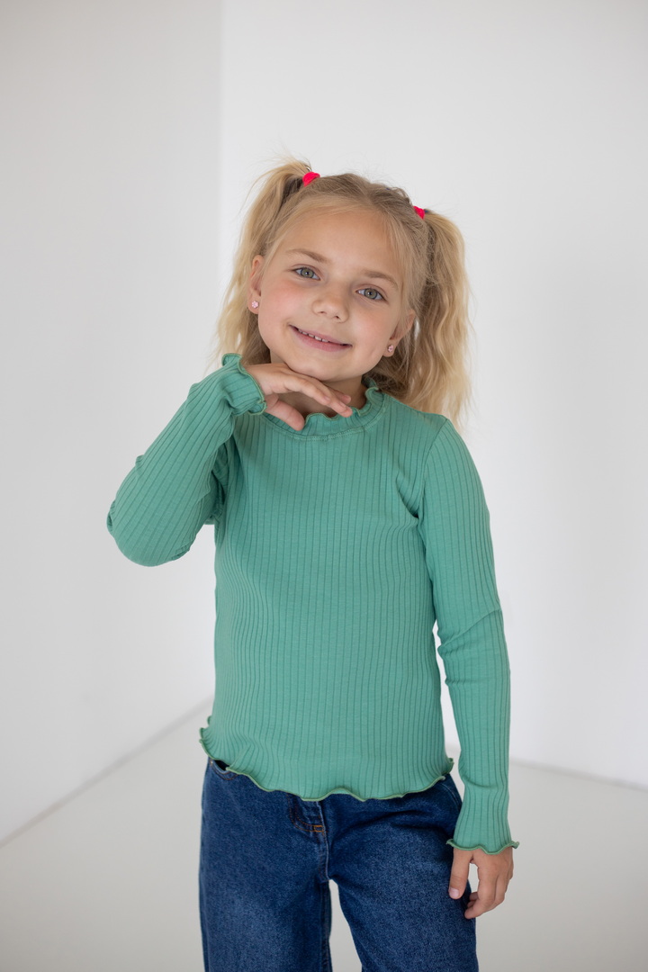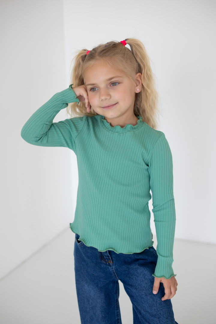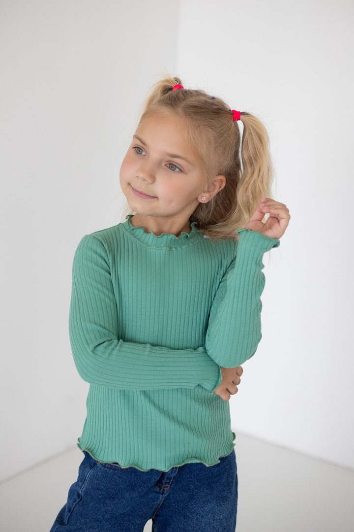 Класичний лонгслів для дівчаток із якісного полотна "Мустанг". Полотно м'яке, приємне до тіла. Добре тримає форму, не розтягується та не скочується. Джемпер з округлою горловиною, довгим рукавом. Модель поєднується з класичними брюками, спідницею, джинсами та сарафаном.
