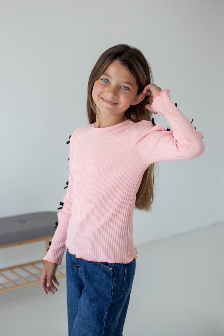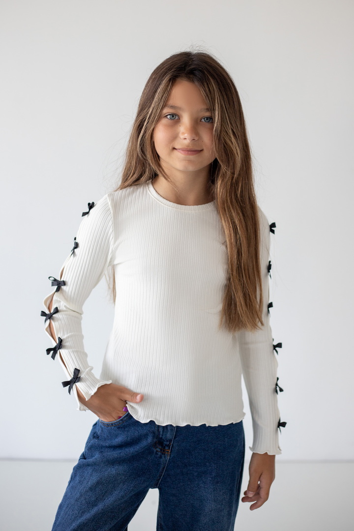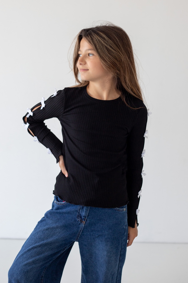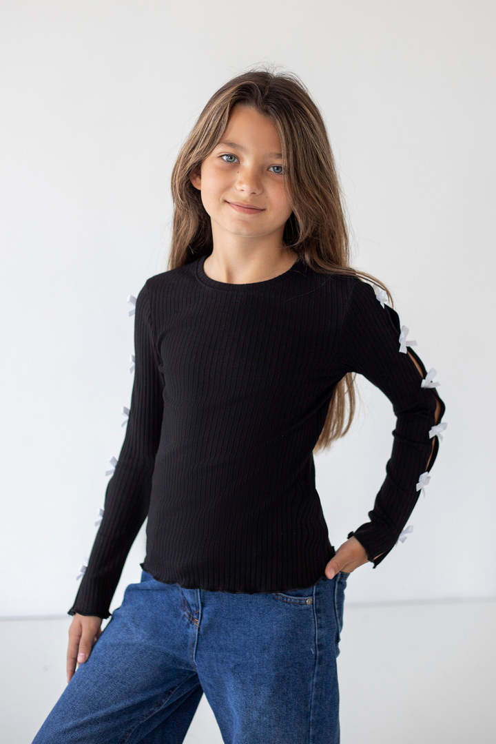 Стильний та комфортний лонгслів для дівчат, виготовлений з м’якої та еластичної тканини мустанг, що приємно облягає тіло та забезпечує зручність протягом дня. Модель має приталений силует, який додає виробу сучасного вигляду. Рукава довгі, з декоративними прорізами вздовж усієї довжини, прикрашеними акуратними бантиками. Така деталь створює ніжний акцент та робить лонгслів яскравим елементом гардероба. Низ виробу та рукавів оформлено хвилястою обробкою, що додає лаконічності та витонченості. Лонгслів ідеально підійде для школи або прогулянок, легко поєднується з джинсами, спідницями та брюками.