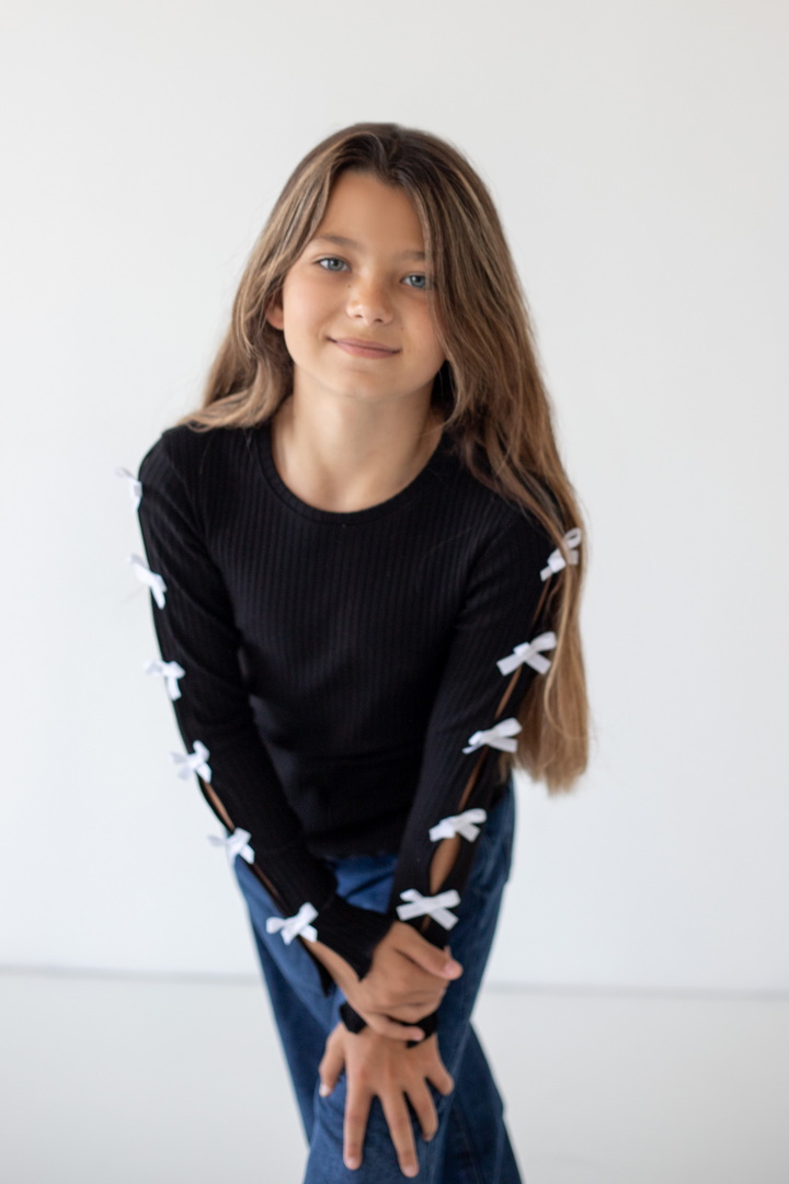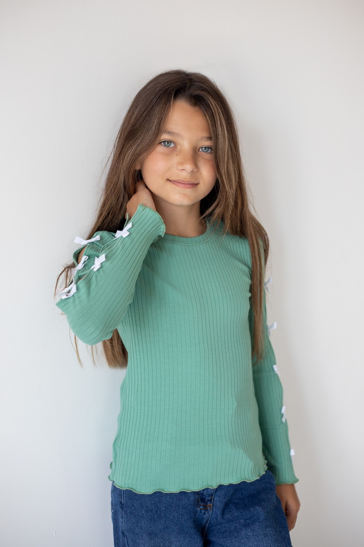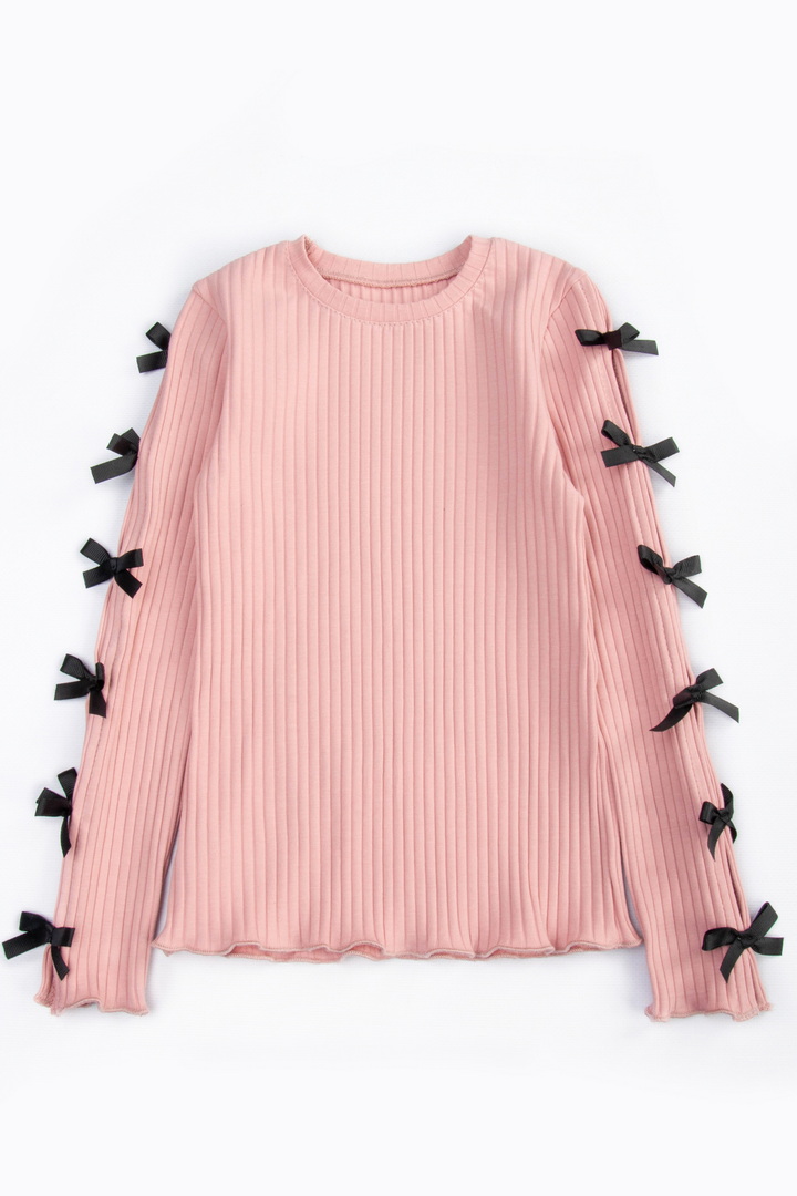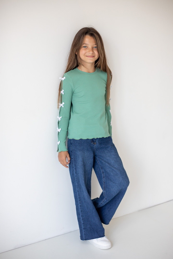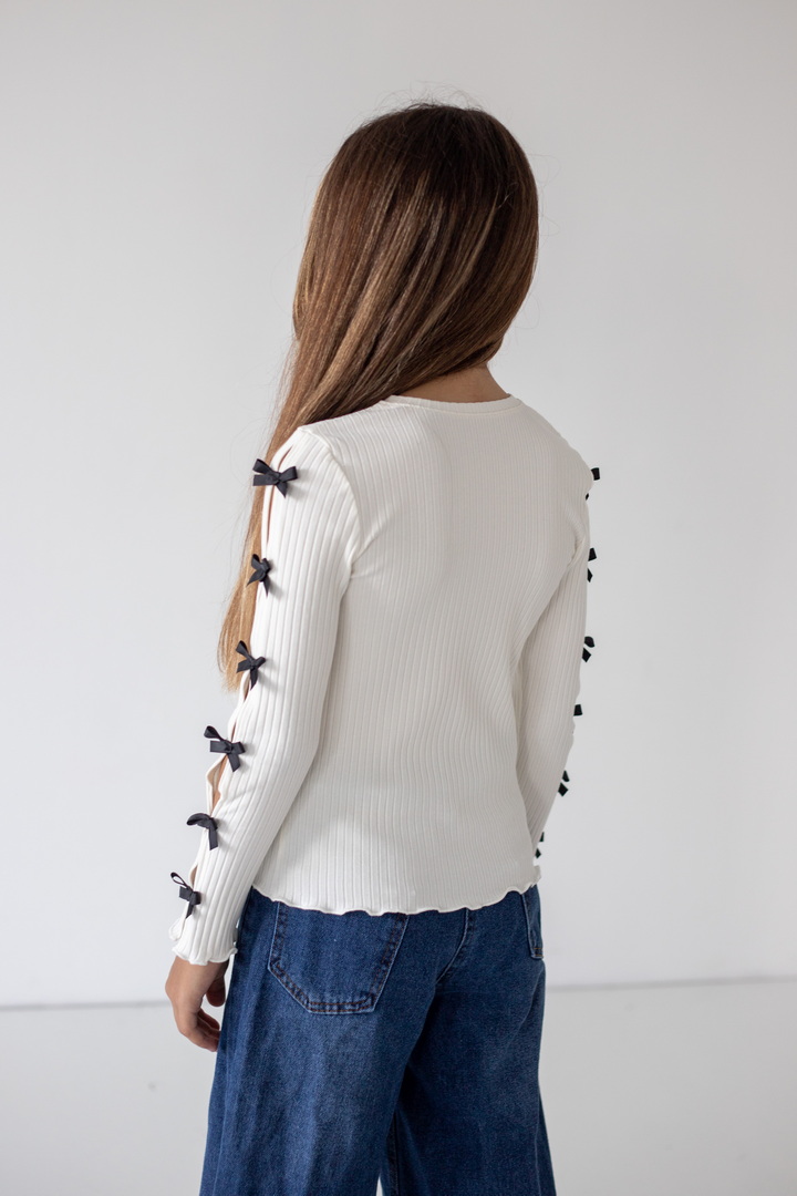 Стильний та комфортний лонгслів для дівчат, виготовлений з м’якої та еластичної тканини мустанг, що приємно облягає тіло та забезпечує зручність протягом дня. Модель має приталений силует, який додає виробу сучасного вигляду. Рукава довгі, з декоративними прорізами вздовж усієї довжини, прикрашеними акуратними бантиками. Така деталь створює ніжний акцент та робить лонгслів яскравим елементом гардероба. Низ виробу та рукавів оформлено хвилястою обробкою, що додає лаконічності та витонченості. Лонгслів ідеально підійде для школи або прогулянок, легко поєднується з джинсами, спідницями та брюками.