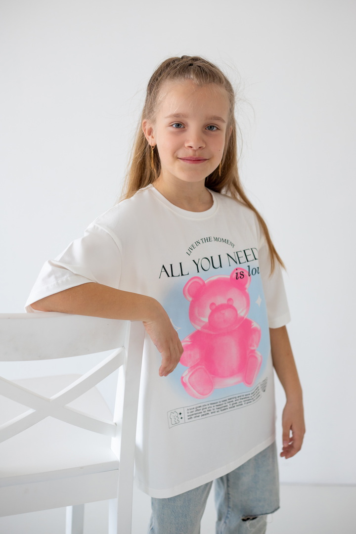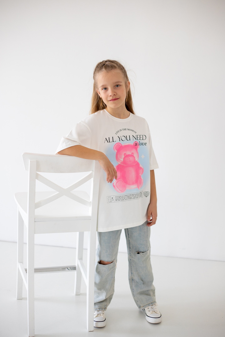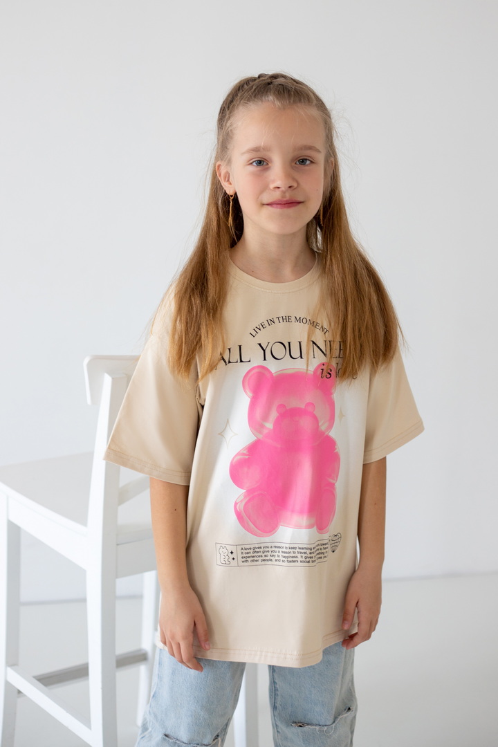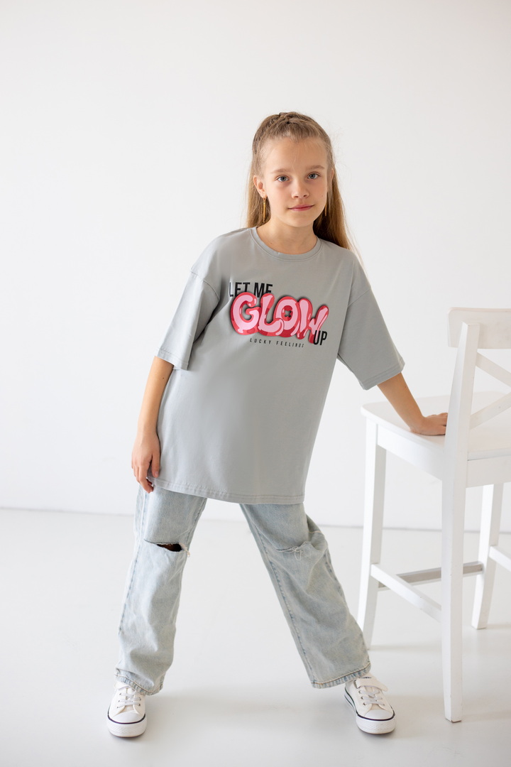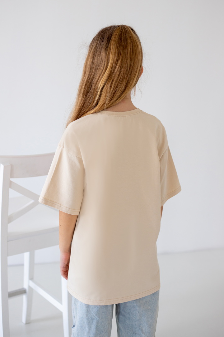 Базова футболка крою oversize з еластичного стрейч-куліру для дівчат-підлітків. Модель з короткими рукавами і округлим вирізом, по переду нанесений малюнок. Футболка універсальна, доповнити образ можна джинсами, однотонними або принтованими шортами. Полотно хорошої якості, натуральне за складом, після прання може давати усадку.