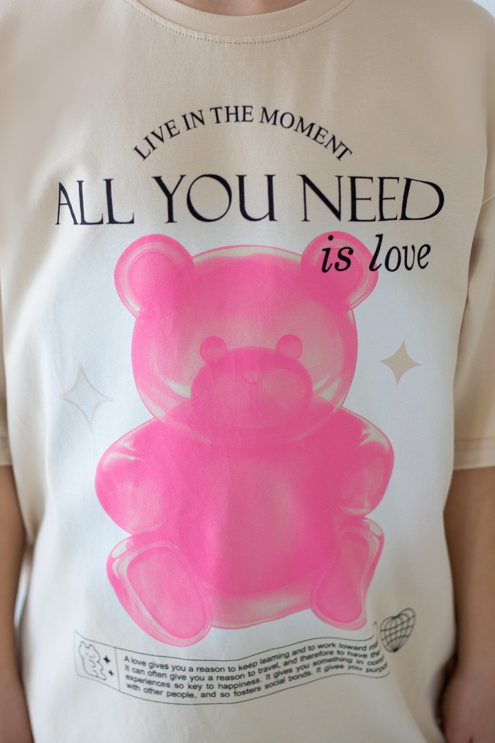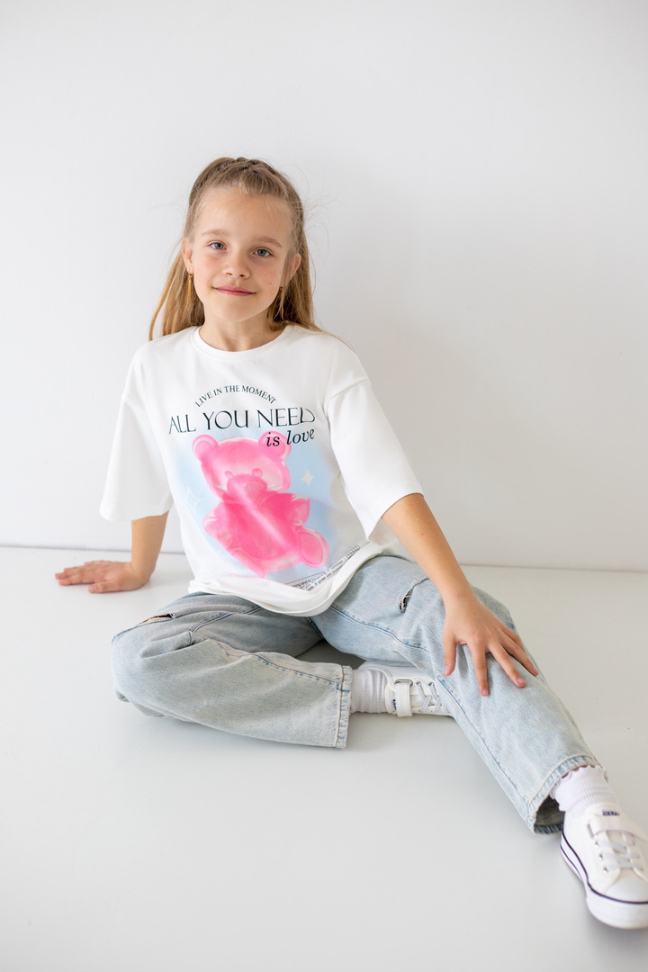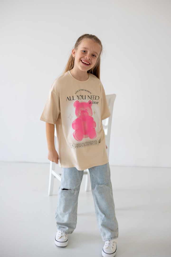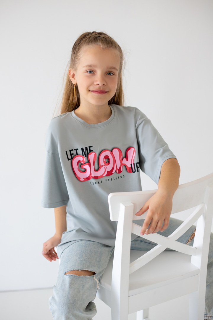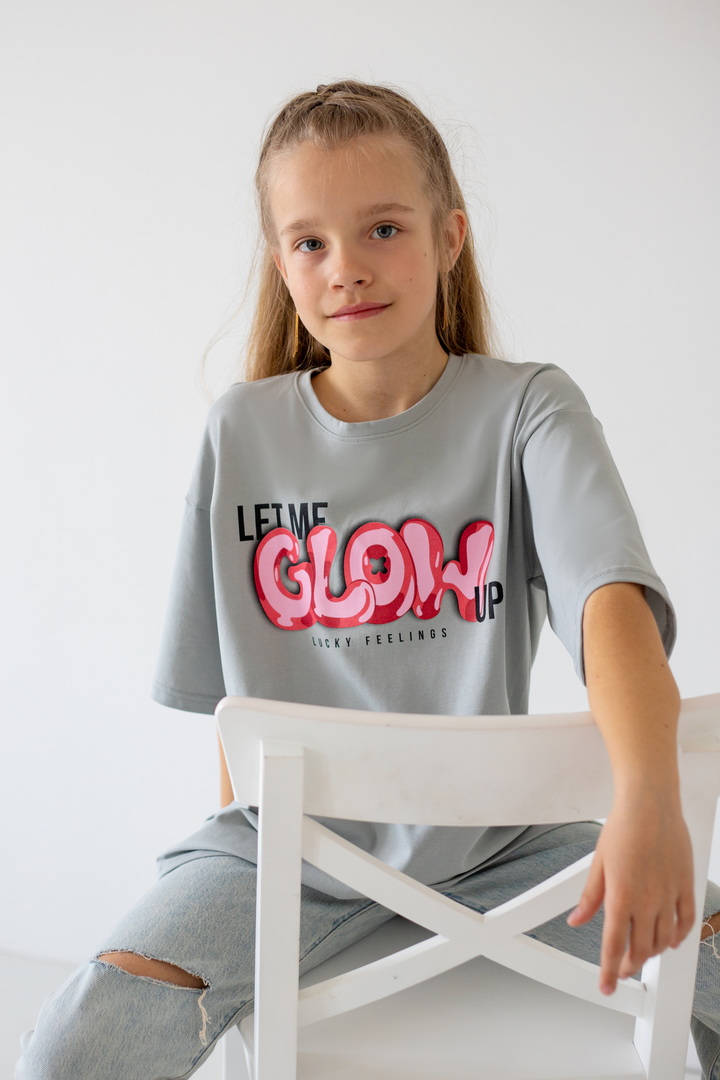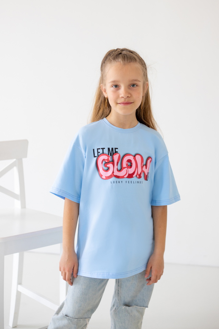 Базова футболка крою oversize з еластичного стрейч-куліру для дівчат-підлітків. Модель з короткими рукавами і округлим вирізом, по переду нанесений малюнок. Футболка універсальна, доповнити образ можна джинсами, однотонними або принтованими шортами. Полотно хорошої якості, натуральне за складом, після прання може давати усадку.