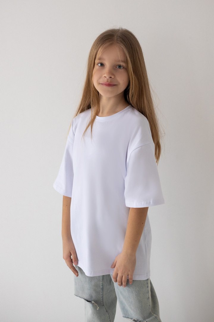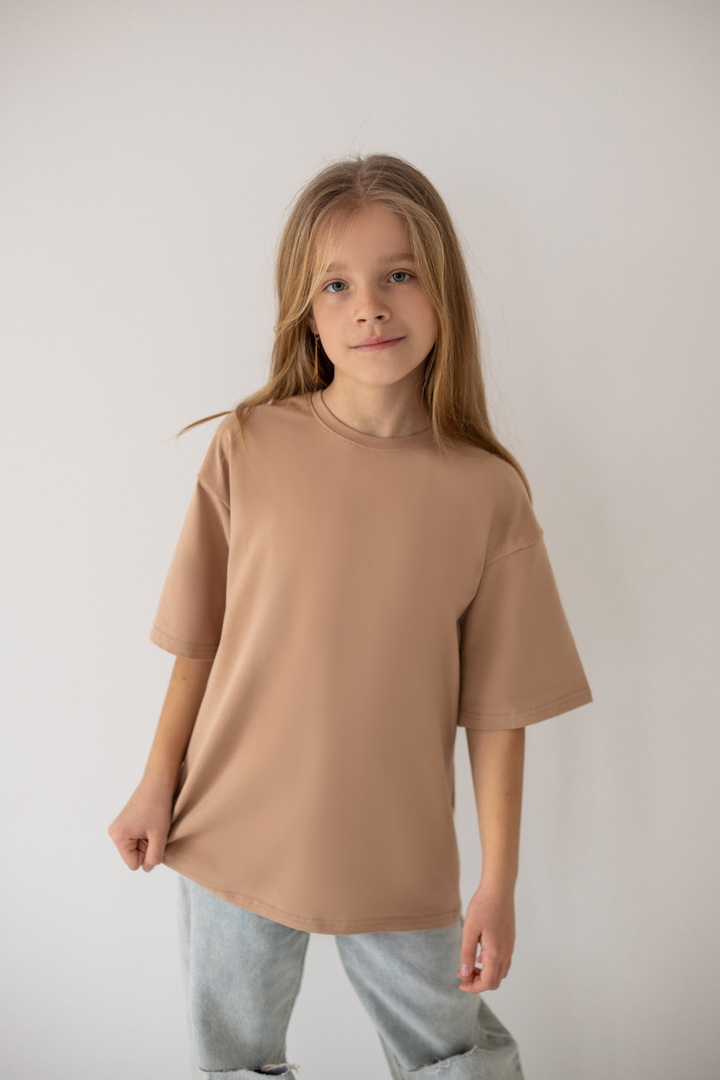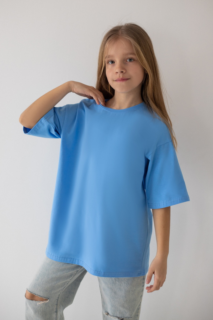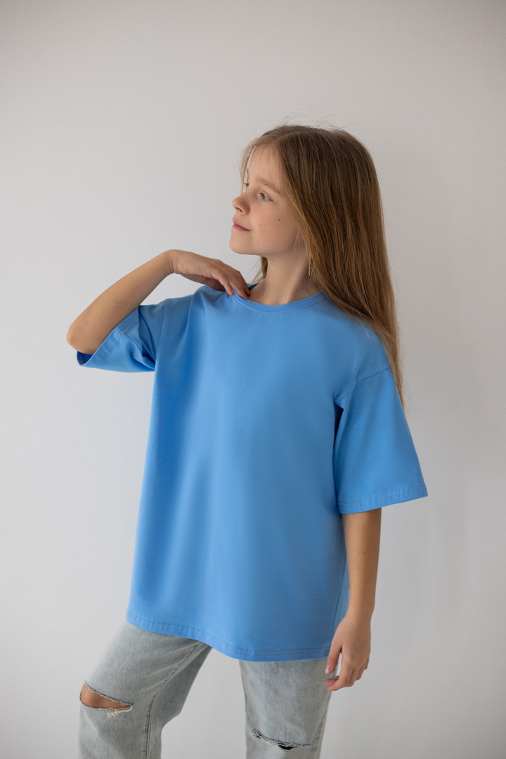 Базова футболка крою oversize з еластичного стрейч-куліру для дівчат-підлітків. Модель з короткими рукавами і округлим вирізом. Футболка універсальна, доповнити образ можна джинсами, однотонними або принтованими шортами. Полотно хорошої якості, натуральне за складом, після прання може давати усадку.
