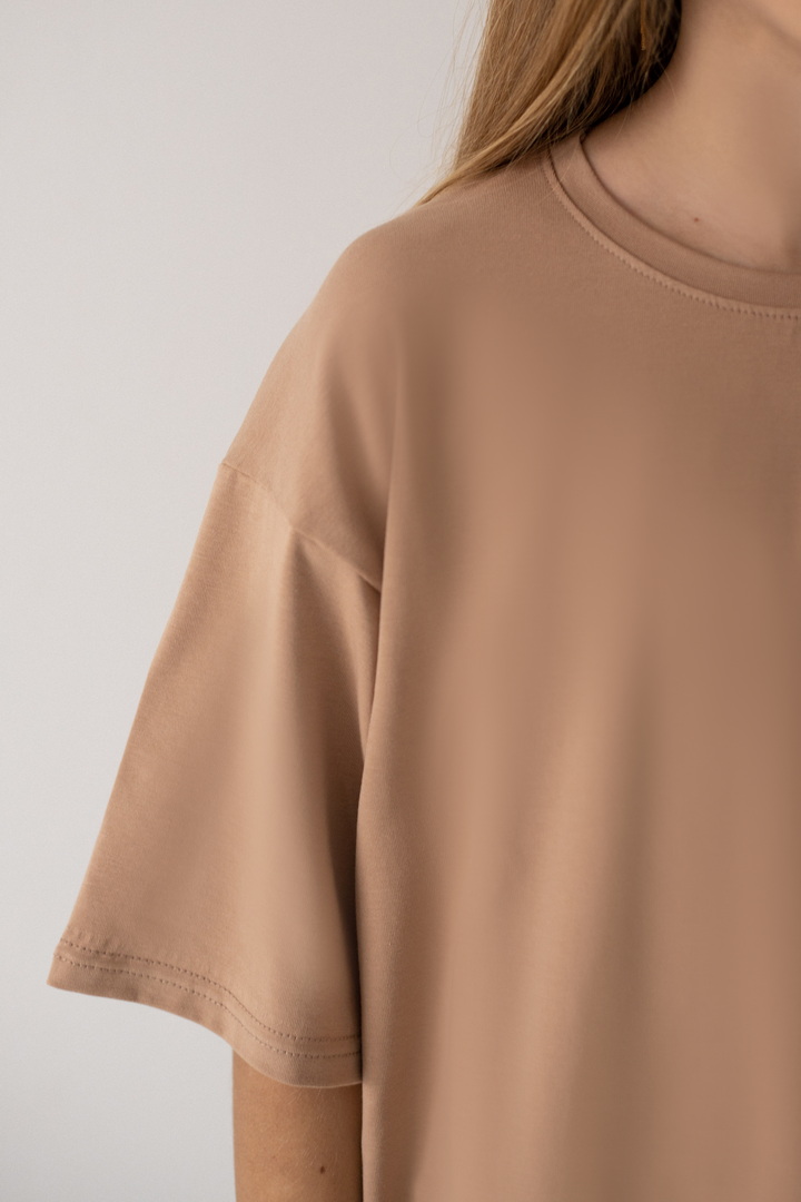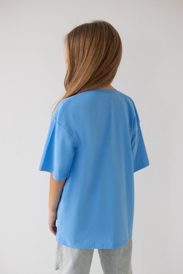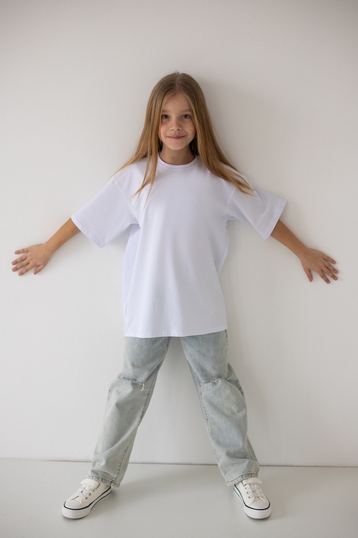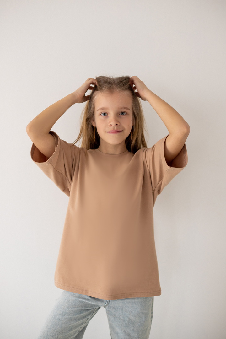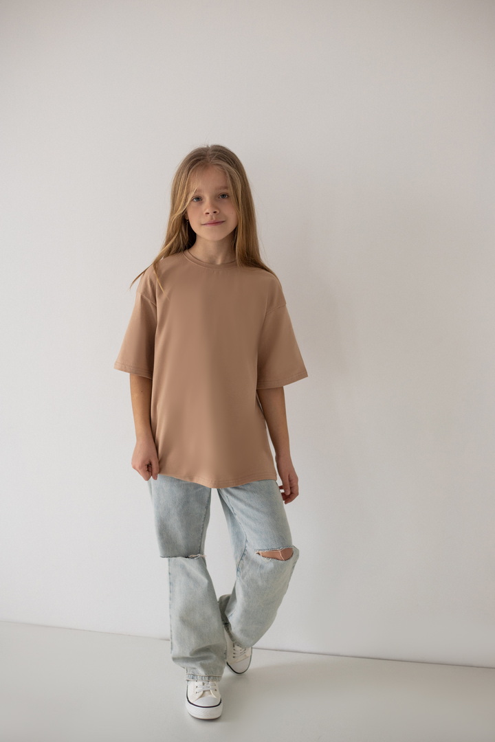Базова футболка крою oversize з еластичного стрейч-куліру для дівчат-підлітків. Модель з короткими рукавами і округлим вирізом. Футболка універсальна, доповнити образ можна джинсами, однотонними або принтованими шортами. Полотно хорошої якості, натуральне за складом, після прання може давати усадку.