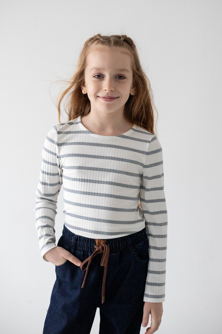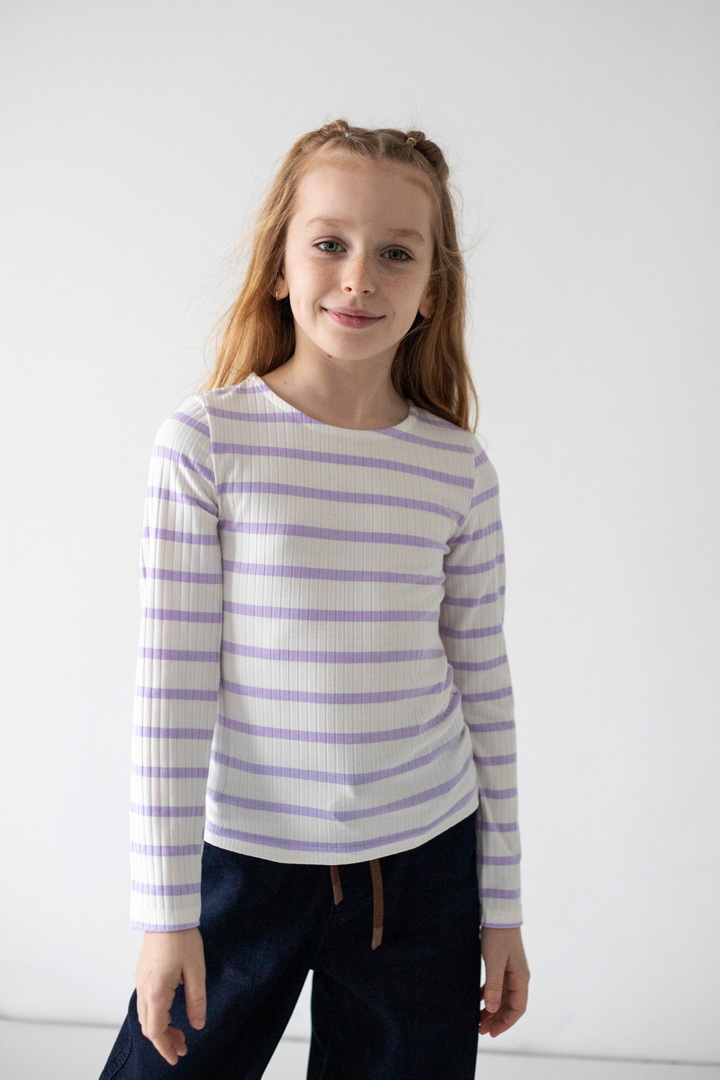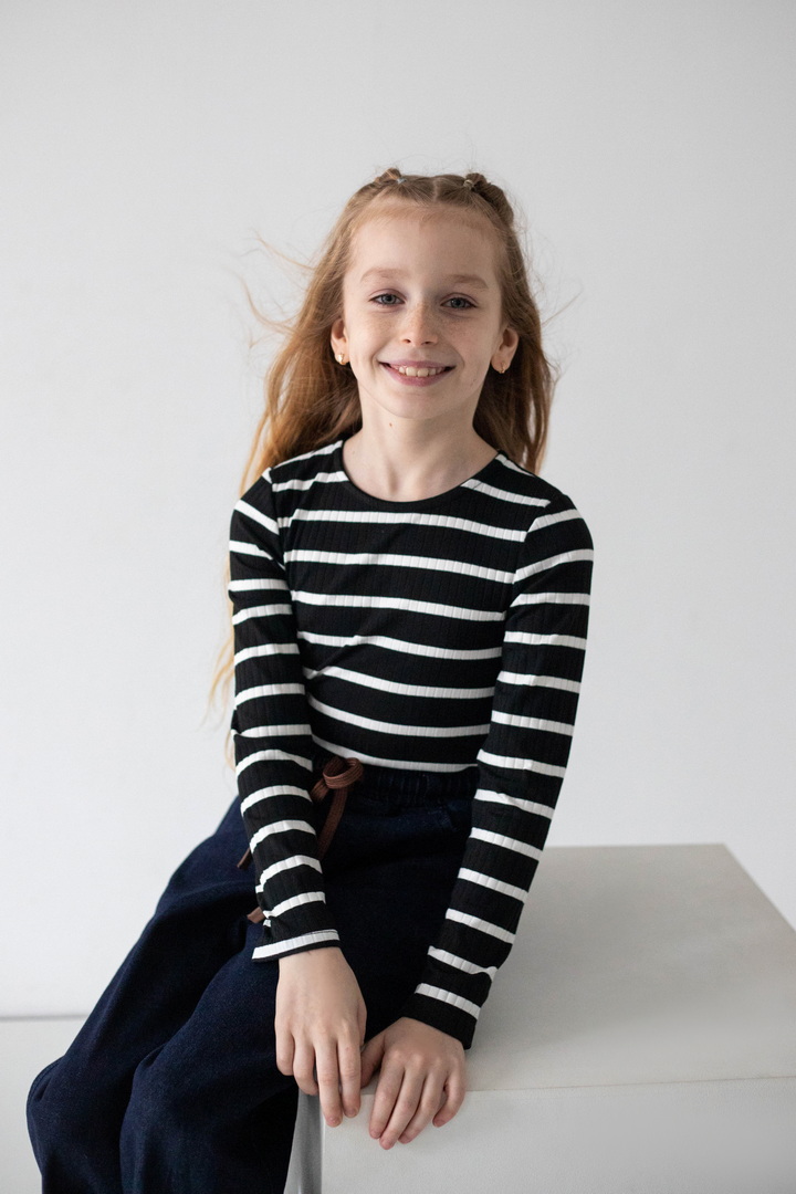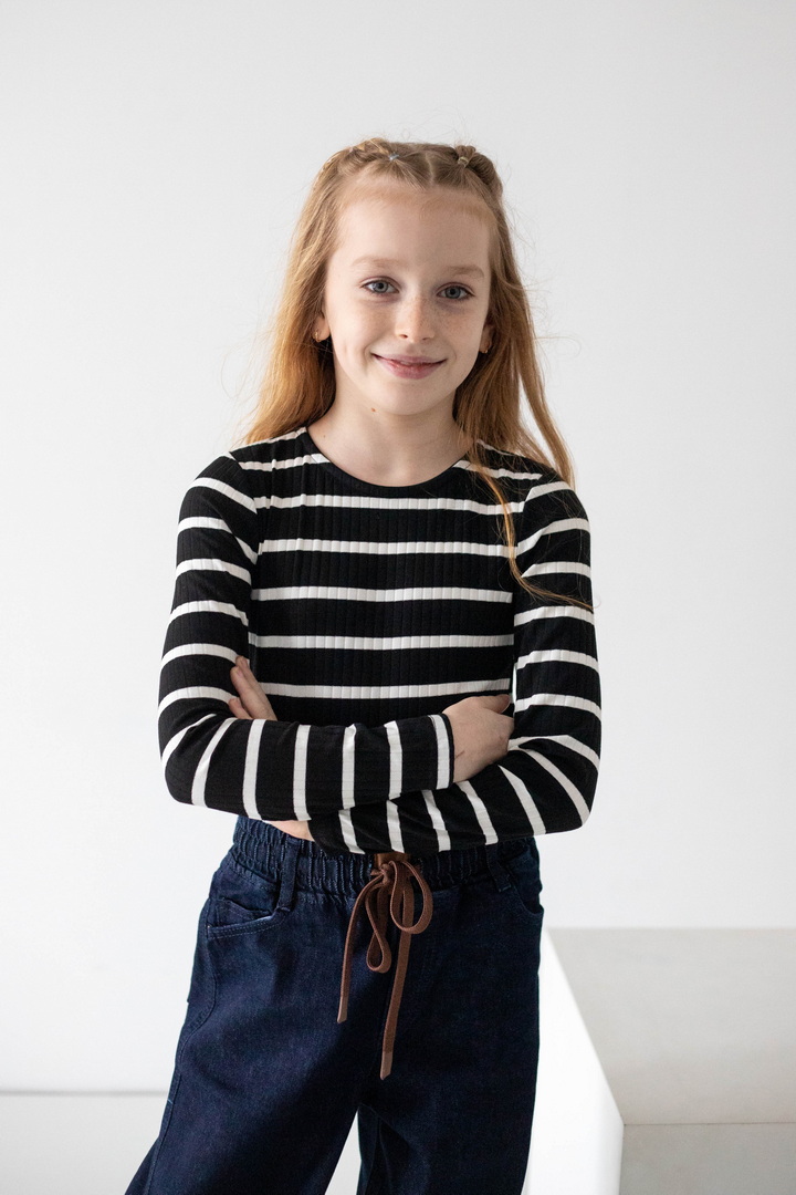 Стильний лонгслів для дівчат із трикотажу в рубчик — ідеальна річ, яка легко впишеться в будь-який гардероб. Завдяки еластичній структурі тканини, виріб м’яко прилягає до тіла, підкреслює силует та дарує максимальний комфорт. Матеріал приємний на дотик та добре пропускає повітря. Класичний крій і кругла горловина роблять модель універсальною, а довгі рукава забезпечують затишок у прохолодну погоду. Горизонтальна смужка додає лонгсліву модного акценту та візуально освіжає образ. Модель виглядає стильно як самостійний елемент, так і в поєднанні з жакетами, жилетами чи сарафанами. Практичний у догляді, не втрачає форму та колір після прання, зберігаючи охайний вигляд надовго.