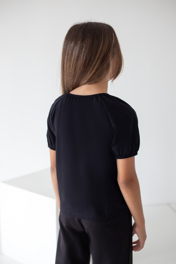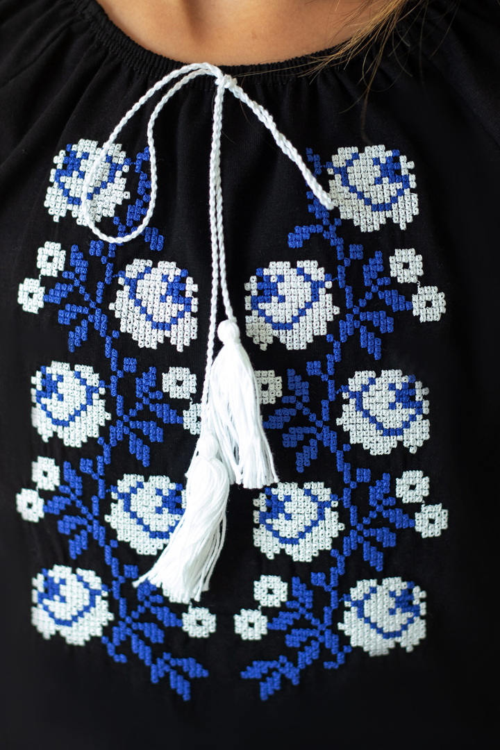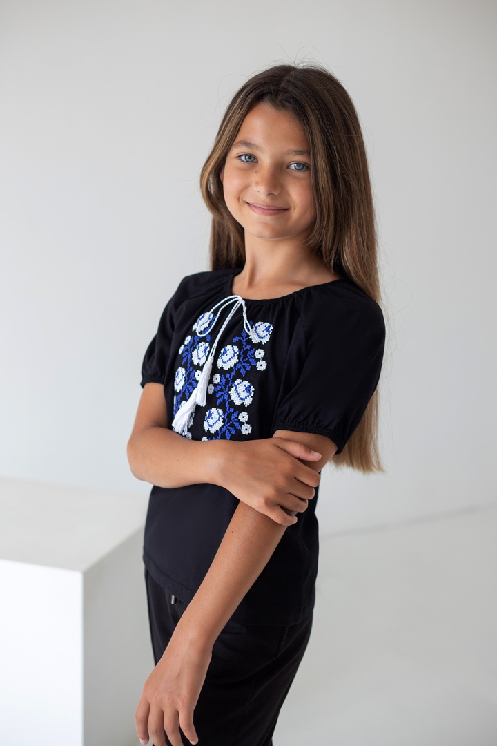 Вишиванка для дівчаток виготовлена з полотна "Стрейч-кулір піньє" - полотно м'яке, еластичне, високоякісне та приємне до тіла - гарно сідає по фігурі. Модель з коротким рукавом, округлою горловиною призібраною на резинці, прикрашена квітковим узором вишитим на машинці. Вишиванка відмінно комбінується з спідницею або штанами та стане доповненням будь-якого святкового чи урочистого образу.
