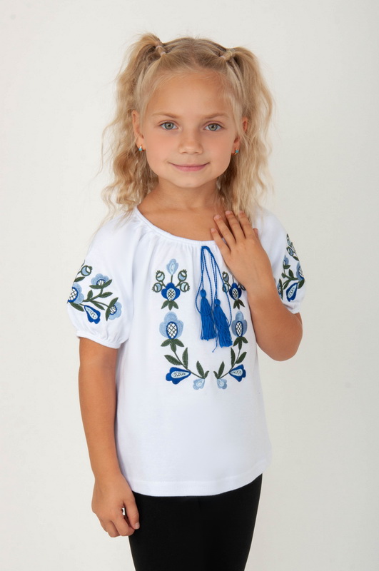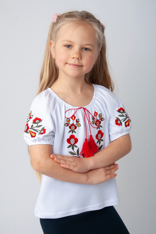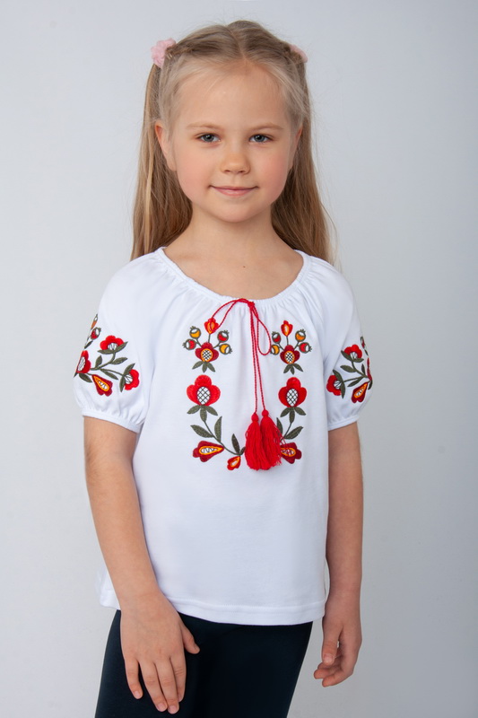 Вишиванка для дівчаток виготовлена з полотна "Інтерлок". Така тканина приємна і ніжна на дотик, має гладку поверхню – речі виходять зручні та м'які, в яких зручно ходити/сидітиме. Дана модель прямого крою з коротким рукавом, округлою горловиною, зібраною на гумці, прикрашена квітковим візерунком вишитим на машинці.