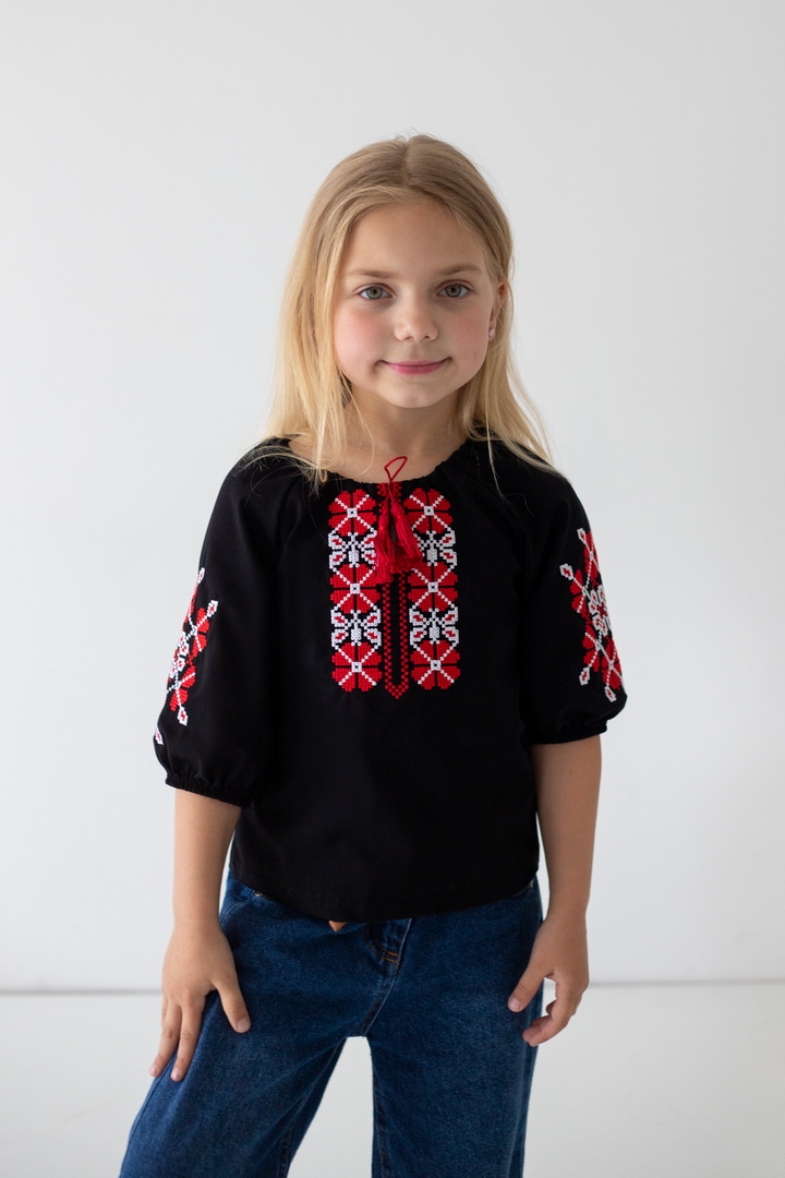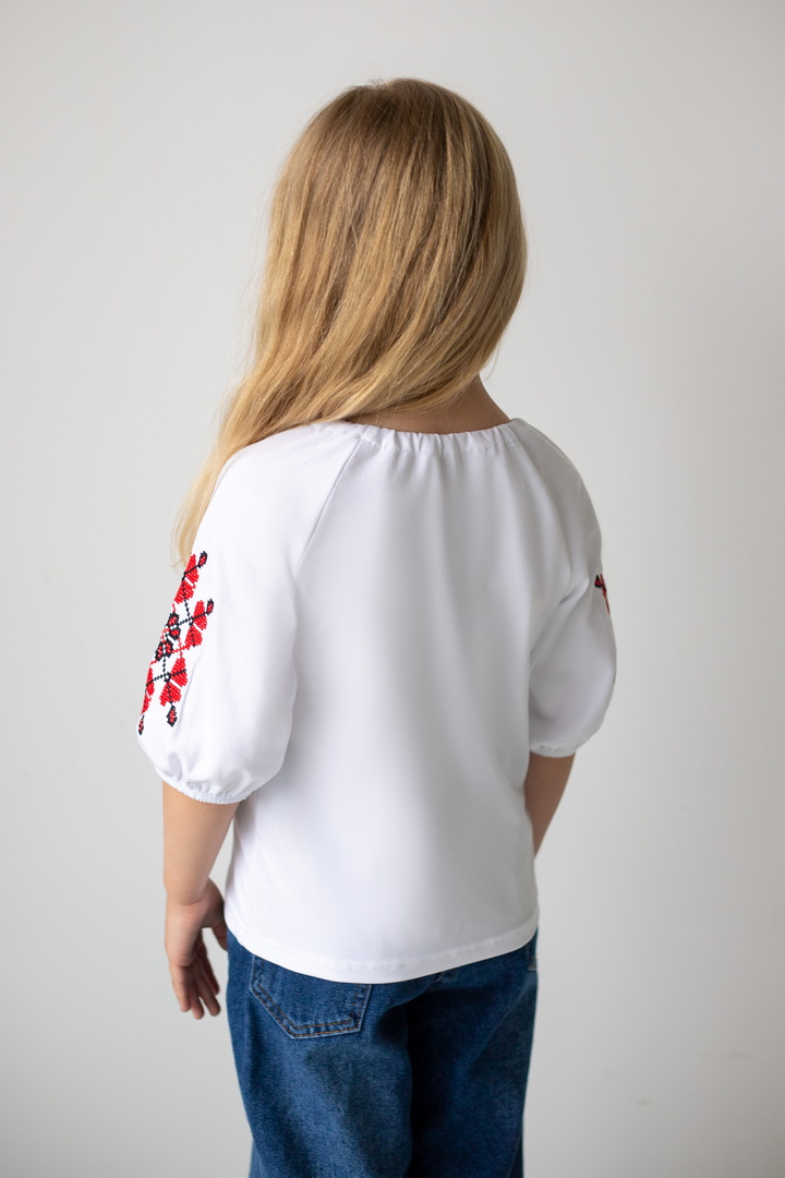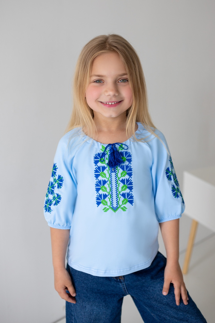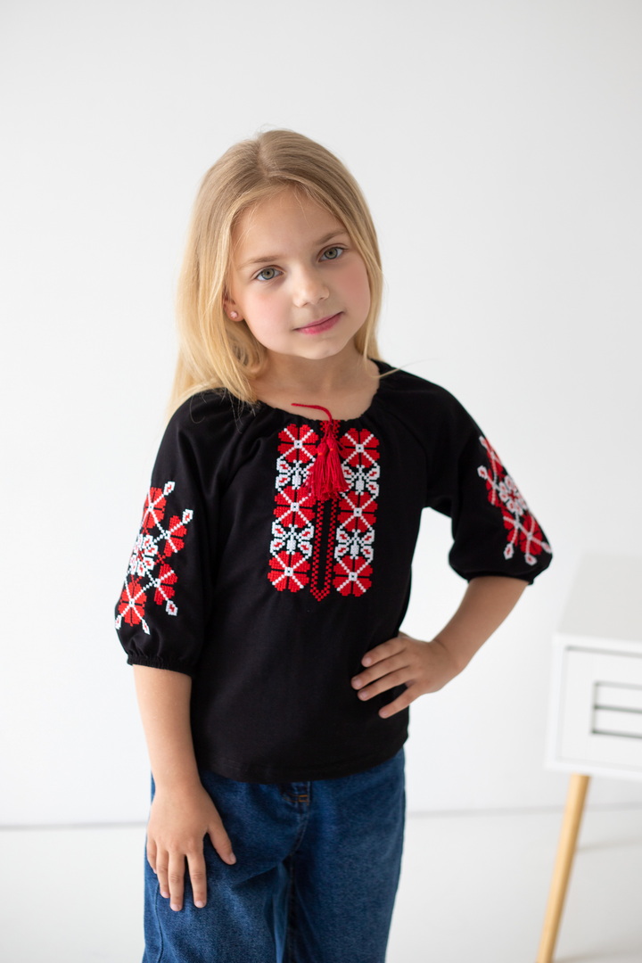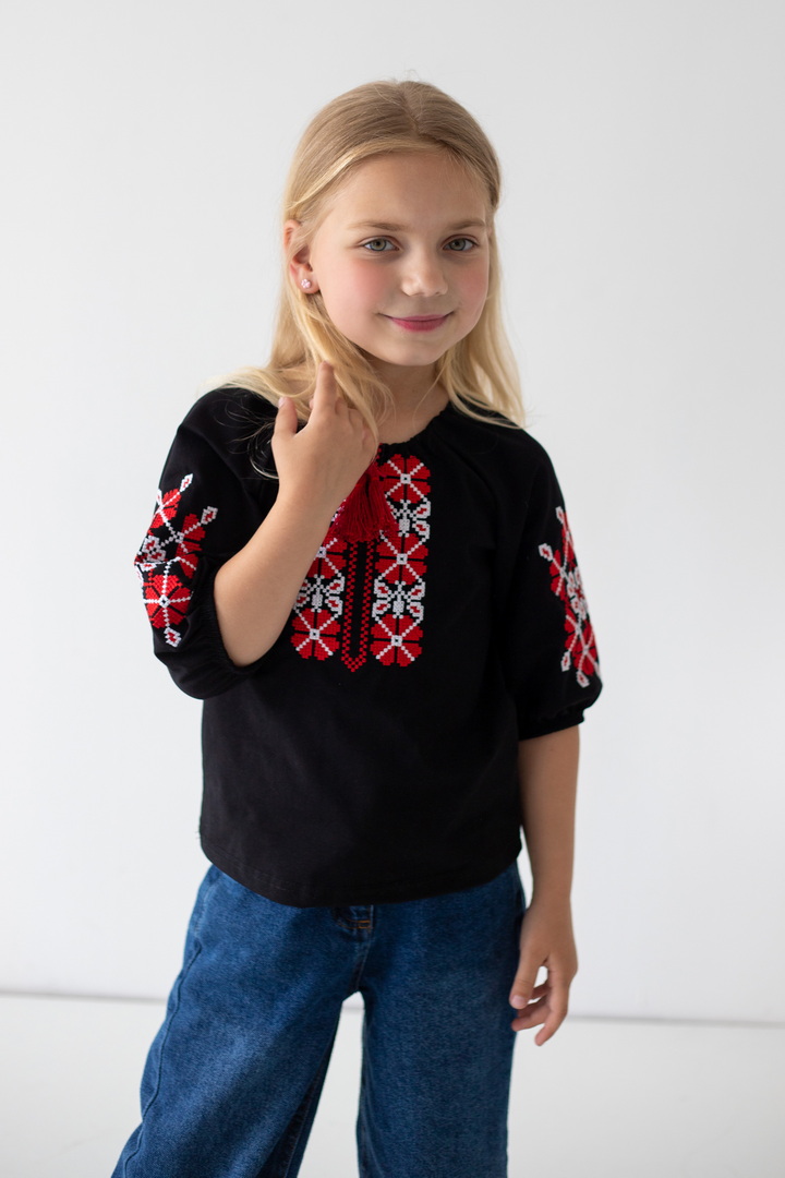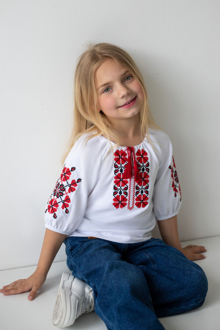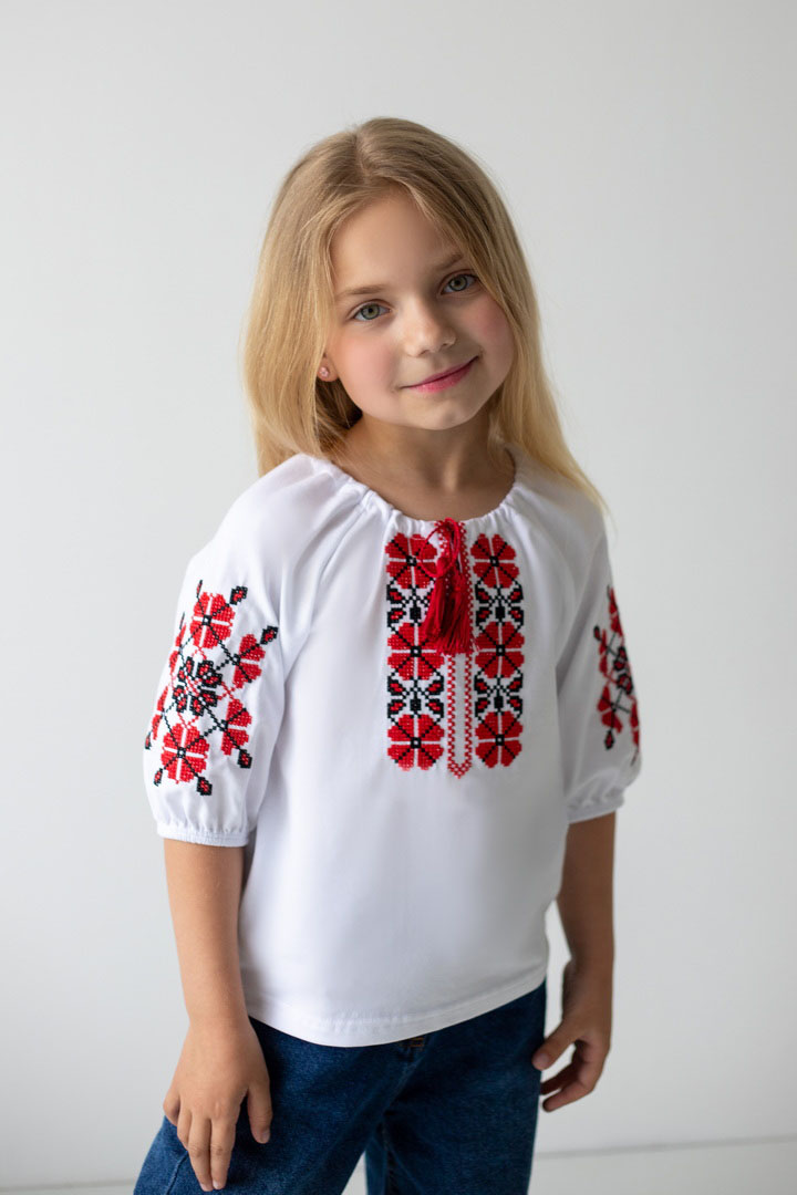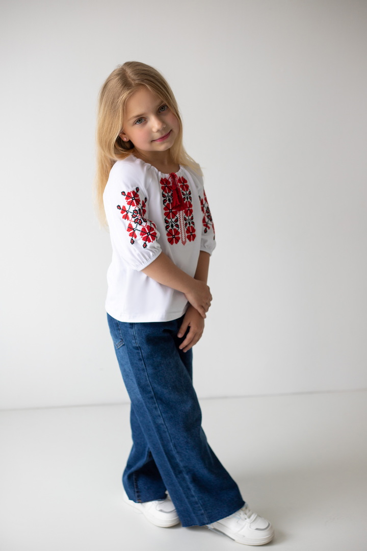 Вишиванка для дівчаток виготовлена з полотна "Стрейч-кулір пеньє" - полотно м'яке, еластичне, високоякісне та приємне до тіла - гарно сідає по фігурі. Модель з рукавом три чверті, округлою горловиною призібраною на резинці, прикрашена квітковим узором вишитим на машинці. Вишиванка відмінно комбінується з спідницею або штанами та стане доповненням будь-якого святкового чи урочистого образу.