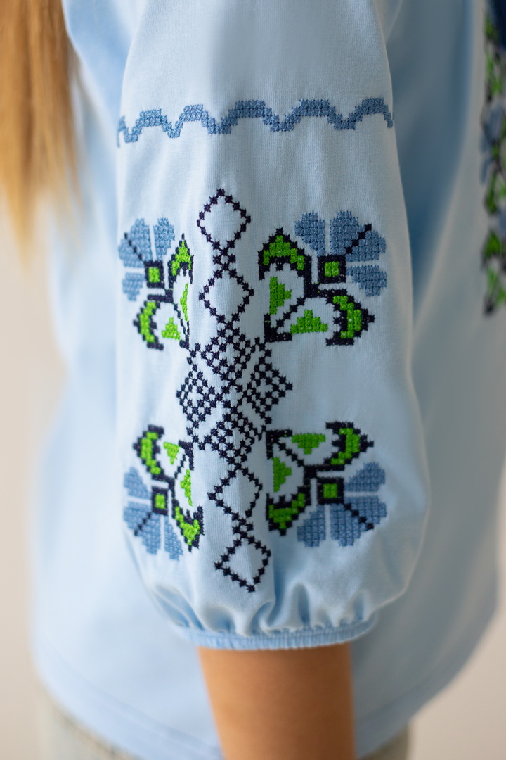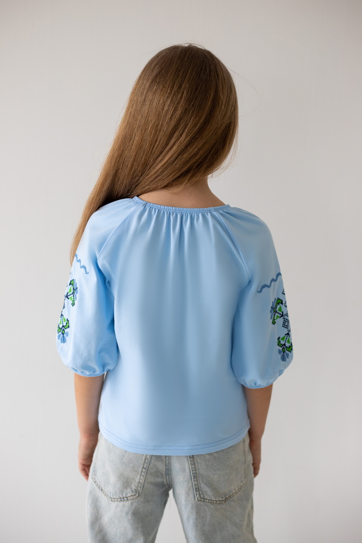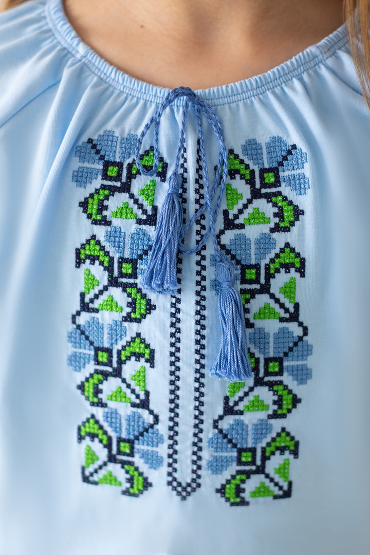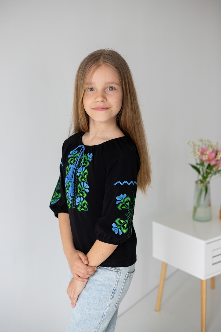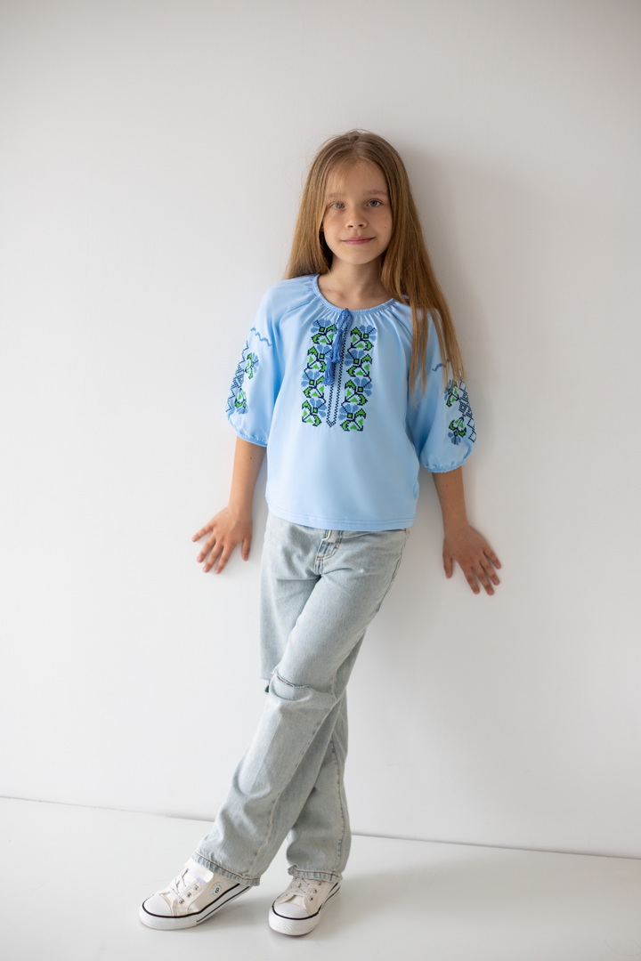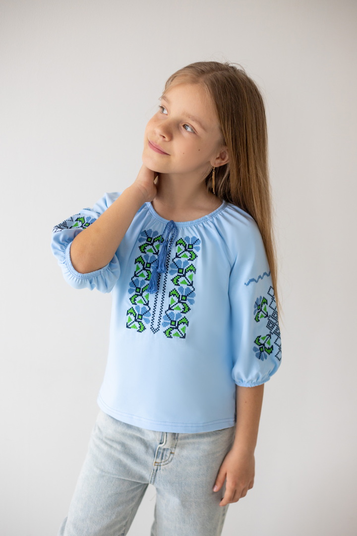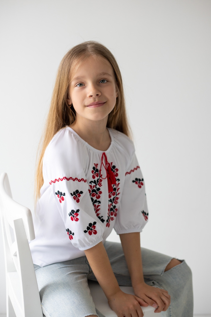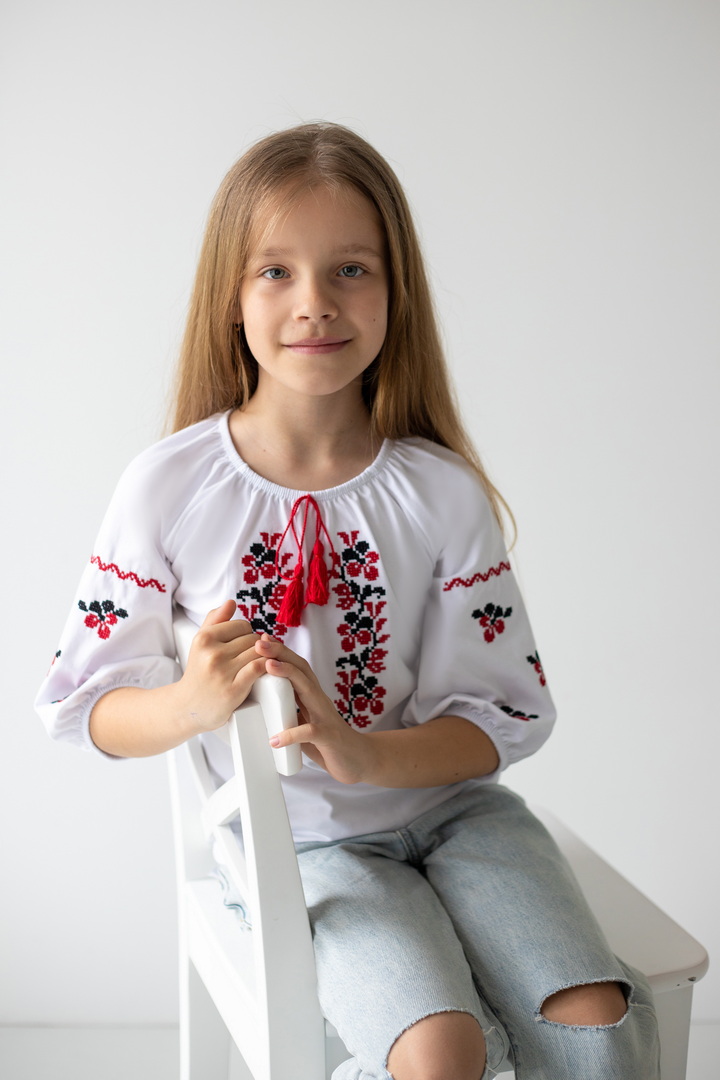 Вишиванка для дівчаток виготовлена з полотна "Стрейч-кулір пеньє" - полотно м'яке, еластичне, високоякісне та приємне до тіла - гарно сідає по фігурі. Модель з коротким рукавом, округлою горловиною призібраною на резинці, прикрашена квітковим узором вишитим на машинці. Вишиванка відмінно комбінується з спідницею або штанами та стане доповненням будь-якого святкового чи урочистого образу.