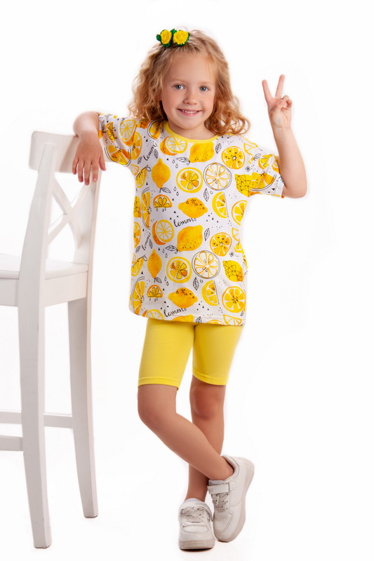 Стильний базовий комплект для дівчаток, складається з подовженої футболки oversize, виконаної з принтованого куліру якості пеньє, а також велосипедок з еластичного однотонного стрейч-куліру. Футболка з округлим вирізом і контрастним кантом в тон велосипедок. Комплект представлено в декількох кольорах на будь-який смак. Полотно високої якості, не линяє, не дає усадку при правильному догляді, після прання не втрачає яскравості.