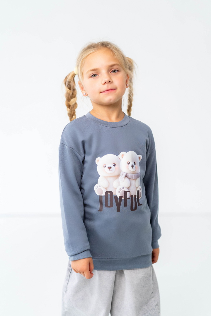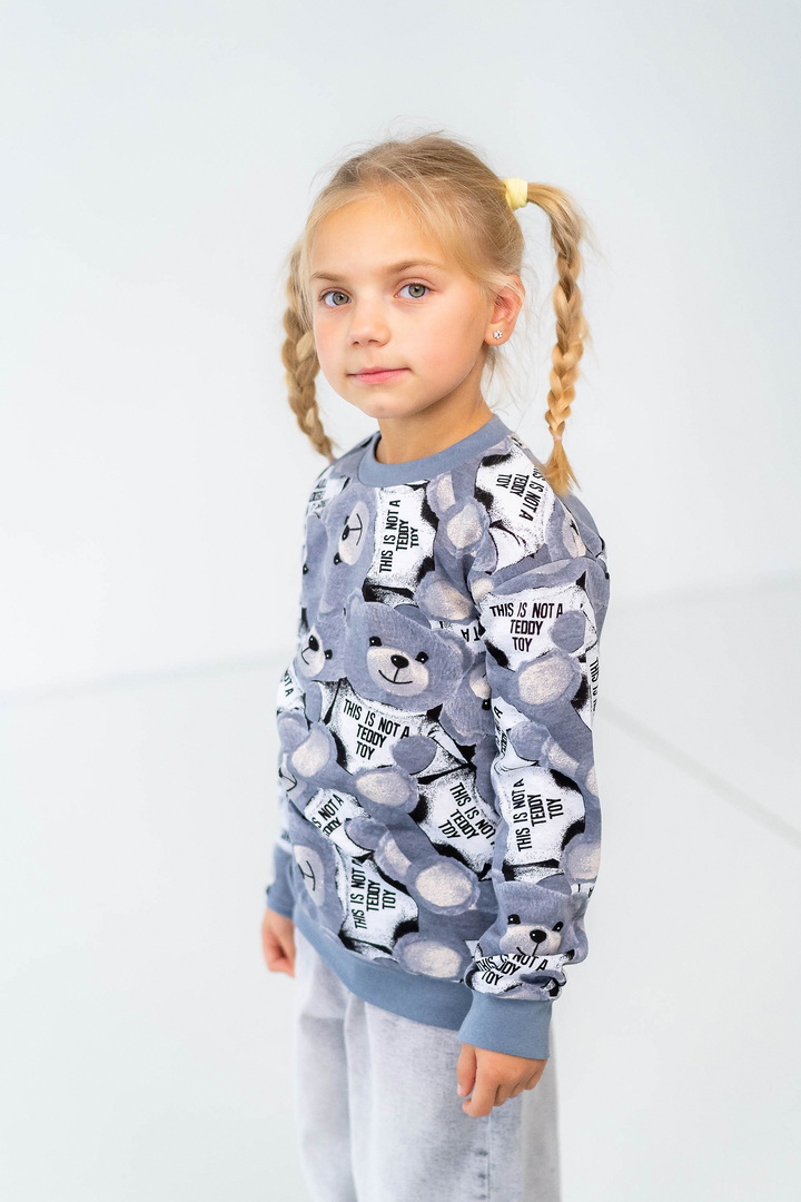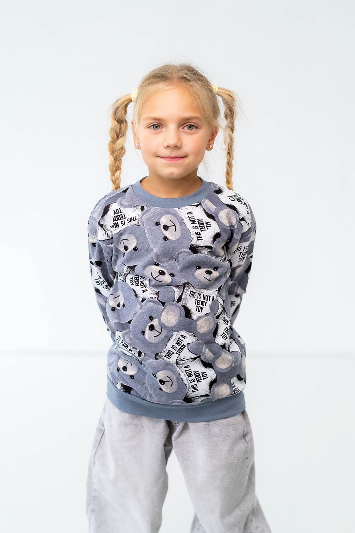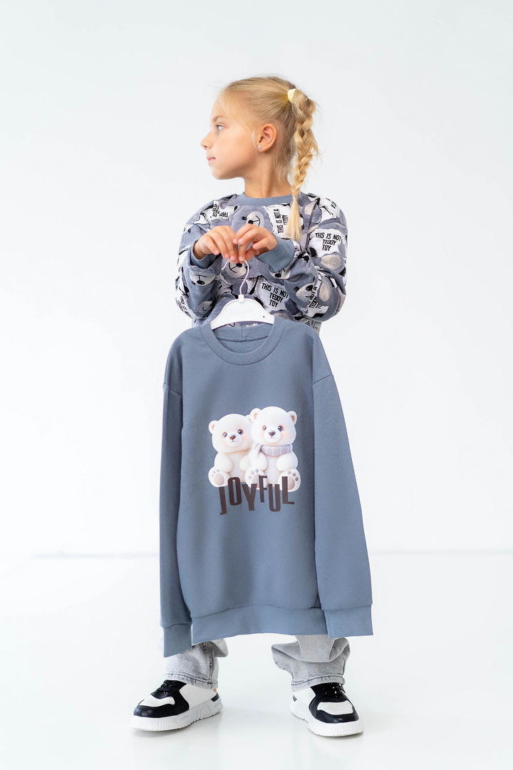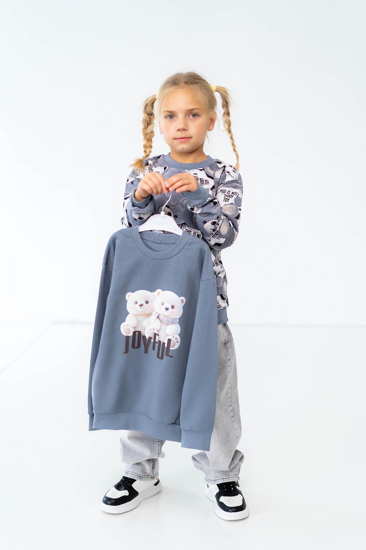 Комплект складається з двох світшотів: один із однотонного, другий - з набивного футера з начосом. Модель вільно крою, з приспущеним рукавом, округлою горловиною. Манжети та горловина виконані зі стрейчу. По переду однотонного світшота нанесений накат методом шовкотрафаретного друку. Модель представлена в актуальних у цьому сезоні кольорах. Полотно якісне, з натуральним складом, має гарну теплоізоляцію, м'який начіс приємний до тіла.