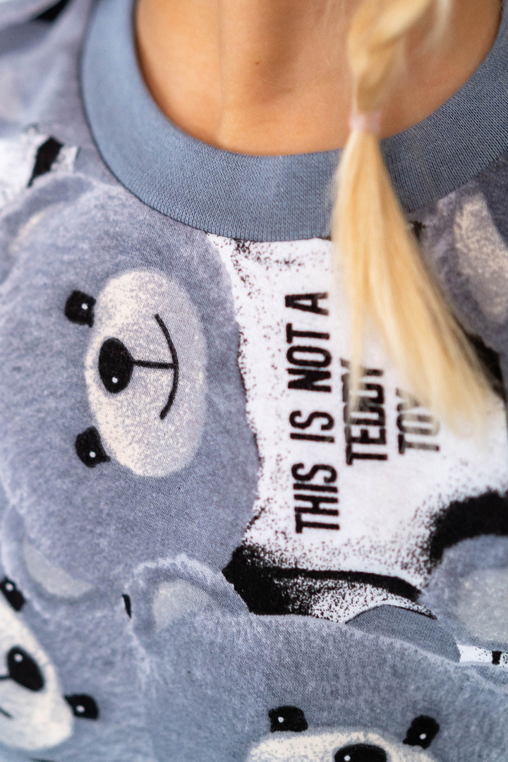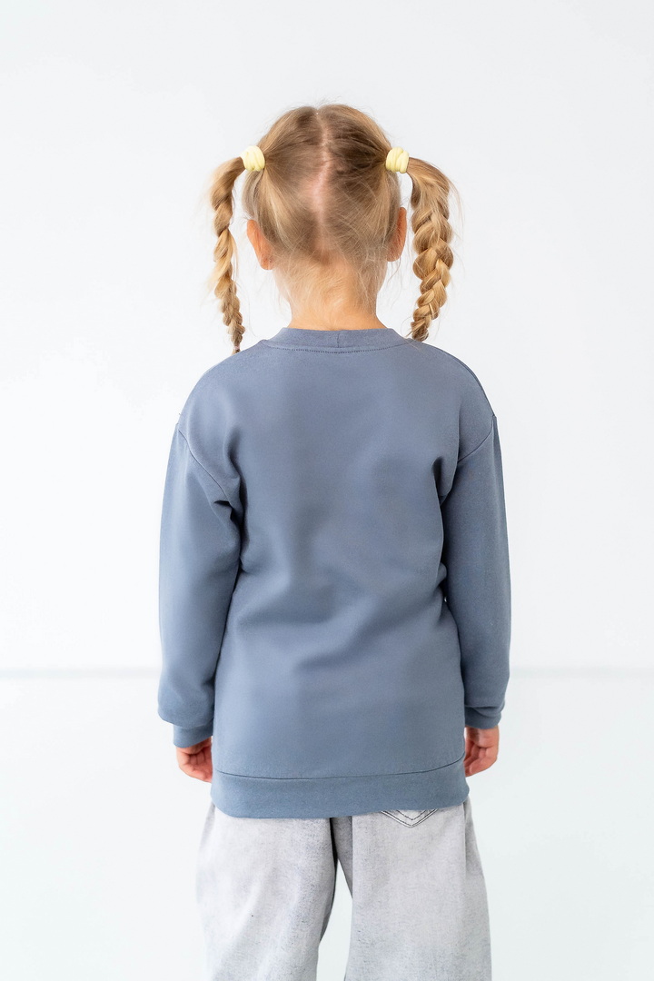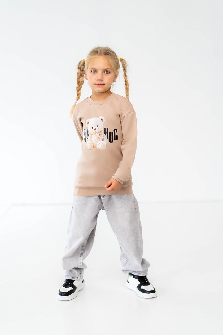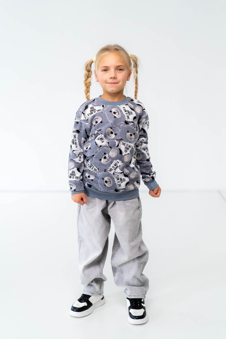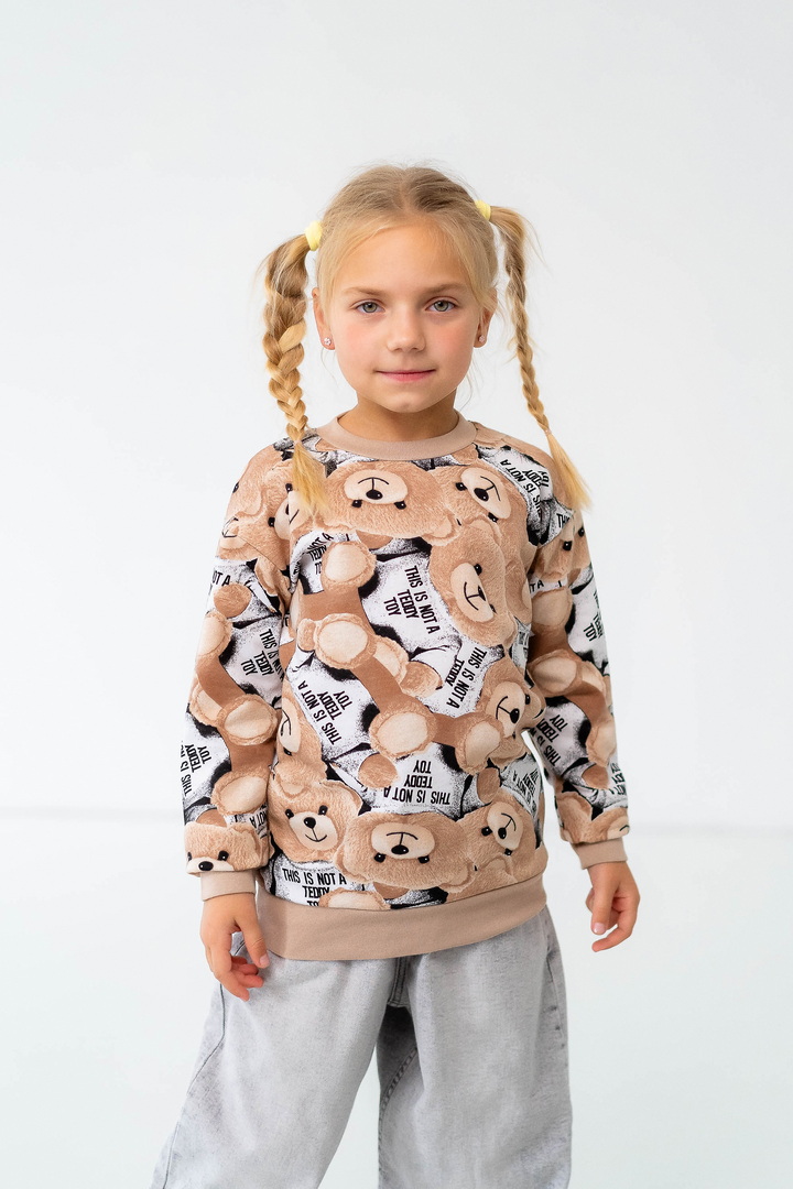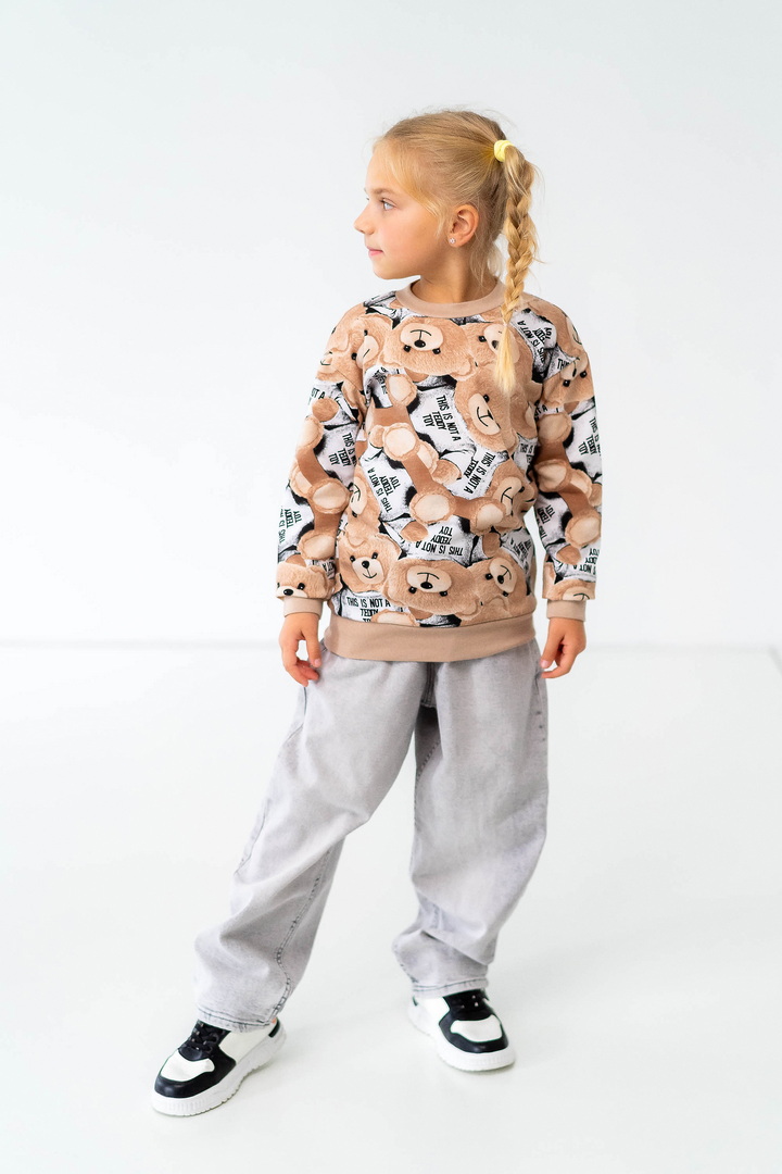 Комплект складається з двох світшотів: один із однотонного, другий - з набивного футера з начосом. Модель вільно крою, з приспущеним рукавом, округлою горловиною. Манжети та горловина виконані зі стрейчу. По переду однотонного світшота нанесений накат методом шовкотрафаретного друку. Модель представлена в актуальних у цьому сезоні кольорах. Полотно якісне, з натуральним складом, має гарну теплоізоляцію, м'який начіс приємний до тіла.