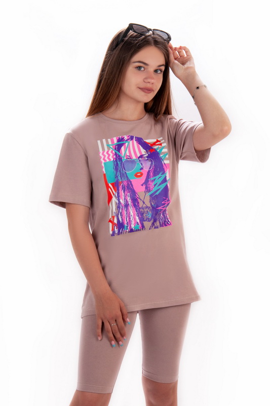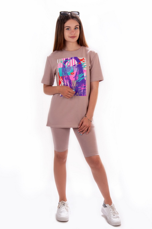 Легкий літній комплект для дівчат-підлітків з еластичного стрейч-куліру, складається з подовженої вільної футболки "Оversize" з округлою горловиною і принтом, виконаним методом шовкотрафаретного друку, а також велосипедок. Стильний костюм стане незамінним в гардеробі юних модниць спекотним літом, доповнити модний образ рекомендується кросівками, кедами або спортивними босоніжками. Полотно відмінної якості, при правильному догляді не дає усадку, завдяки наявності еластану в складі не витягуєтьтся.