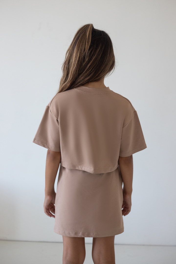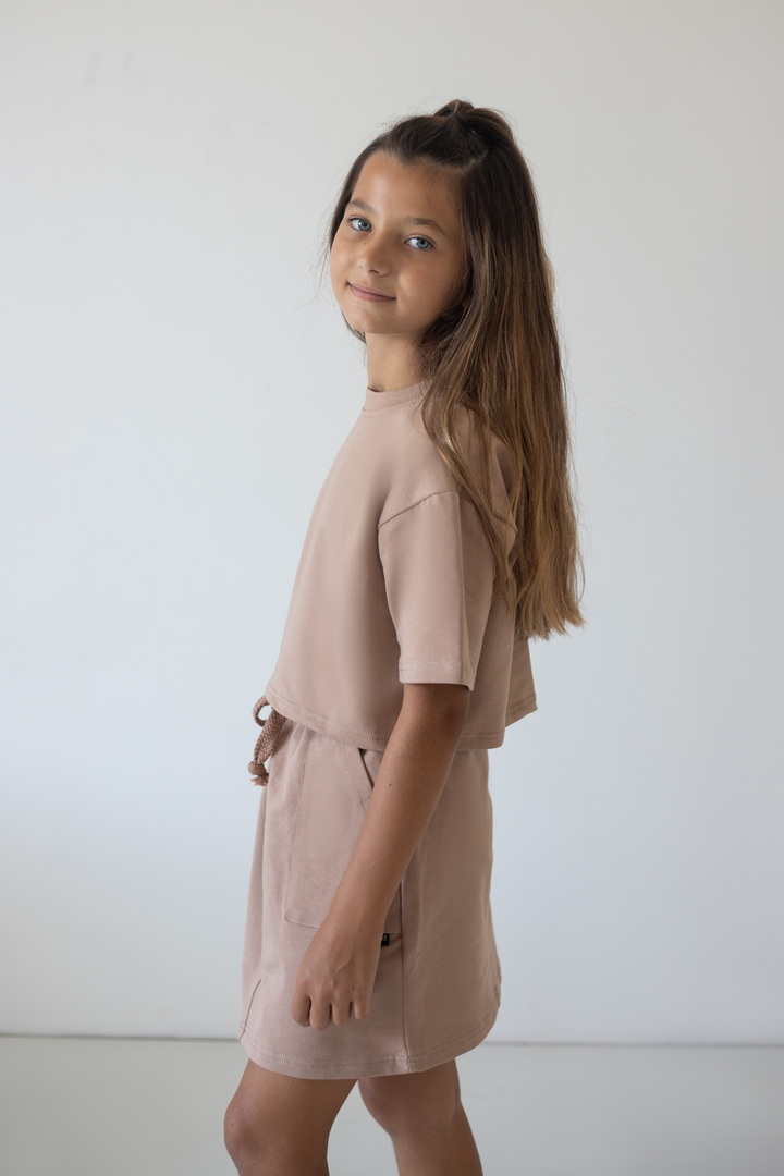 Комплект для дівчаток-підлітків із двониткового футера, в який входить укорочена футболка та спідниця. Футболка вільного крою, з короткими рукавами та округлим вирізом, з лаконічним одноколірним принтом у вигляді напису. Спідниця довжиною до коліна, притачним поясом із широкою гумкою, відстрочкою та шнурком, а також модними "стрілками", має кишені. Доповнити образ рекомендується стильними кросівками, кедами, спортивними босоніжками. Полотно гарної якості, не скочується, не линяє, може давати усадку після прання через високий відсоток бавовни у складі.
