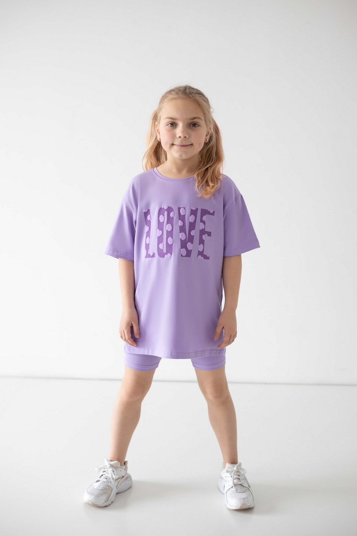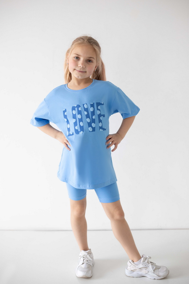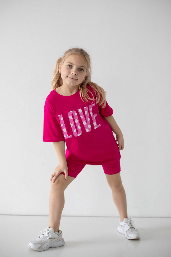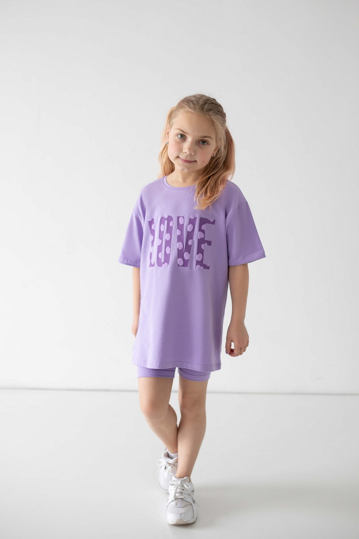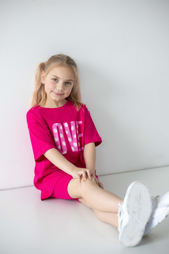 Яскравий, стильний і неймовірно зручний комплект для маленьких модниць, які обожнюють рух, комфорт і красиві деталі. Насичений, трендовий, яскравий принт одразу привертає увагу і додає образу грайливості та ніжності. Футболка подовженого крою дарує свободу та виглядає сучасно — її можна носити як туніку. Лаконічний дизайн гармонійно поєднується з велосипедками, які ідеально сідають по фігурі. Матеріал — стрейч-кулір пеньє — це якісний бавовняний трикотаж з додаванням еластану. Полотно м’яке, гладеньке, приємне до тіла та добре пропускає повітря. Обирайте комфорт, який підкреслює індивідуальність вашої маленької модниці — стильний комплект, що дарує свободу рухів і яскравий настрій.