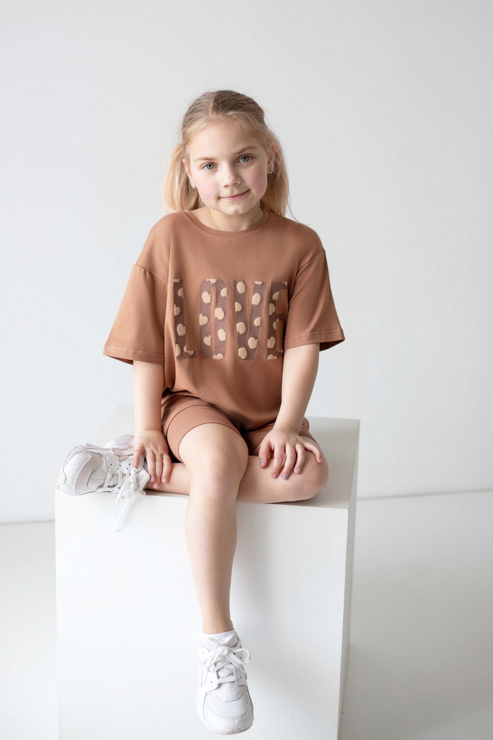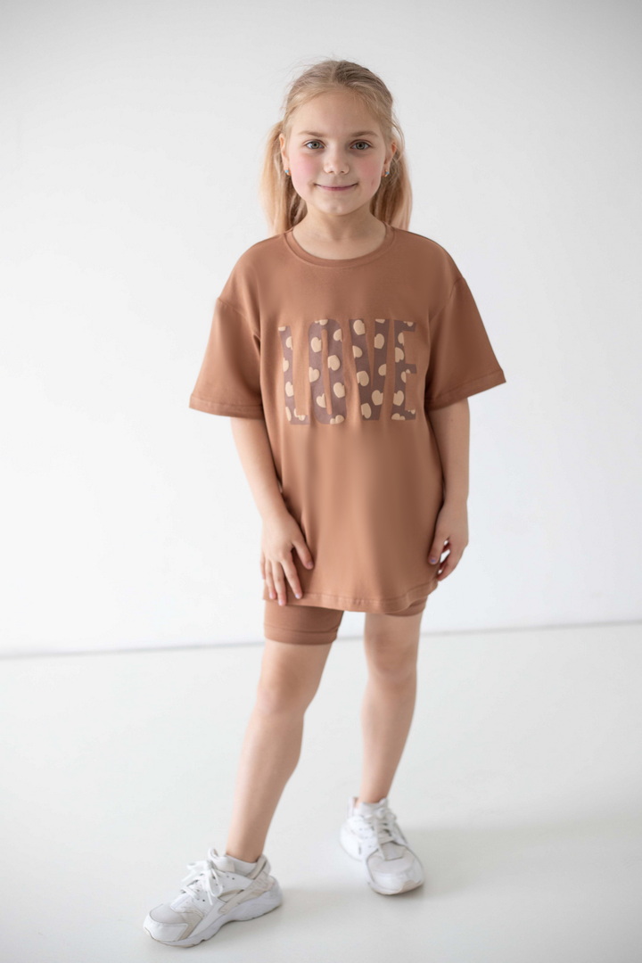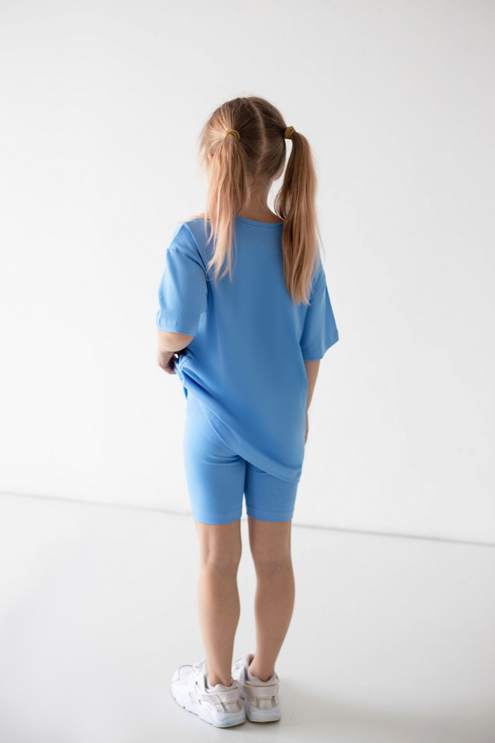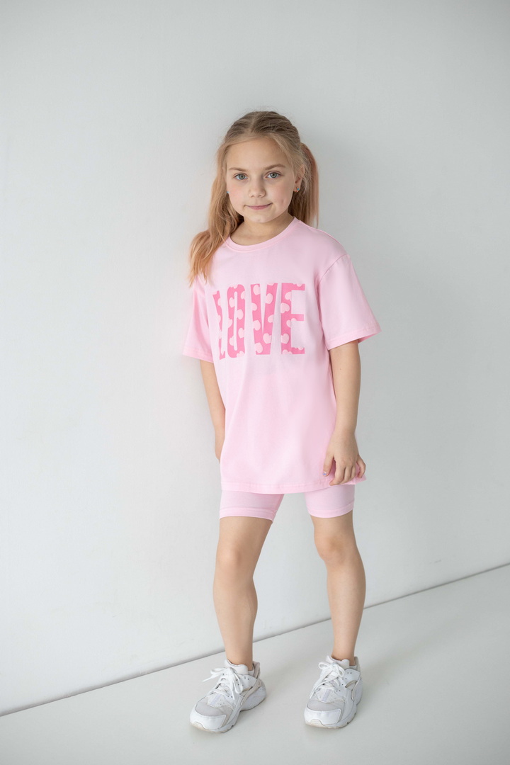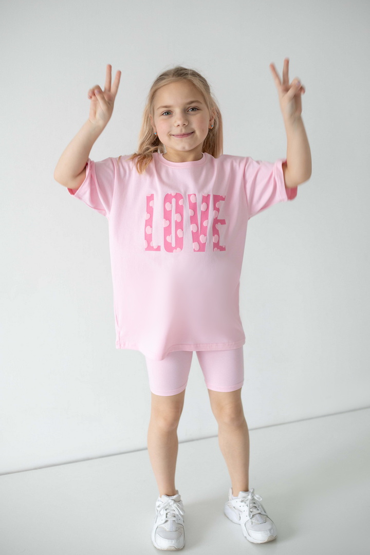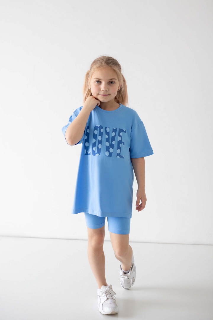 Яскравий, стильний і неймовірно зручний комплект для маленьких модниць, які обожнюють рух, комфорт і красиві деталі. Насичений, трендовий, яскравий принт одразу привертає увагу і додає образу грайливості та ніжності. Футболка подовженого крою дарує свободу та виглядає сучасно — її можна носити як туніку. Лаконічний дизайн гармонійно поєднується з велосипедками, які ідеально сідають по фігурі. Матеріал — стрейч-кулір пеньє — це якісний бавовняний трикотаж з додаванням еластану. Полотно м’яке, гладеньке, приємне до тіла та добре пропускає повітря. Обирайте комфорт, який підкреслює індивідуальність вашої маленької модниці — стильний комплект, що дарує свободу рухів і яскравий настрій.