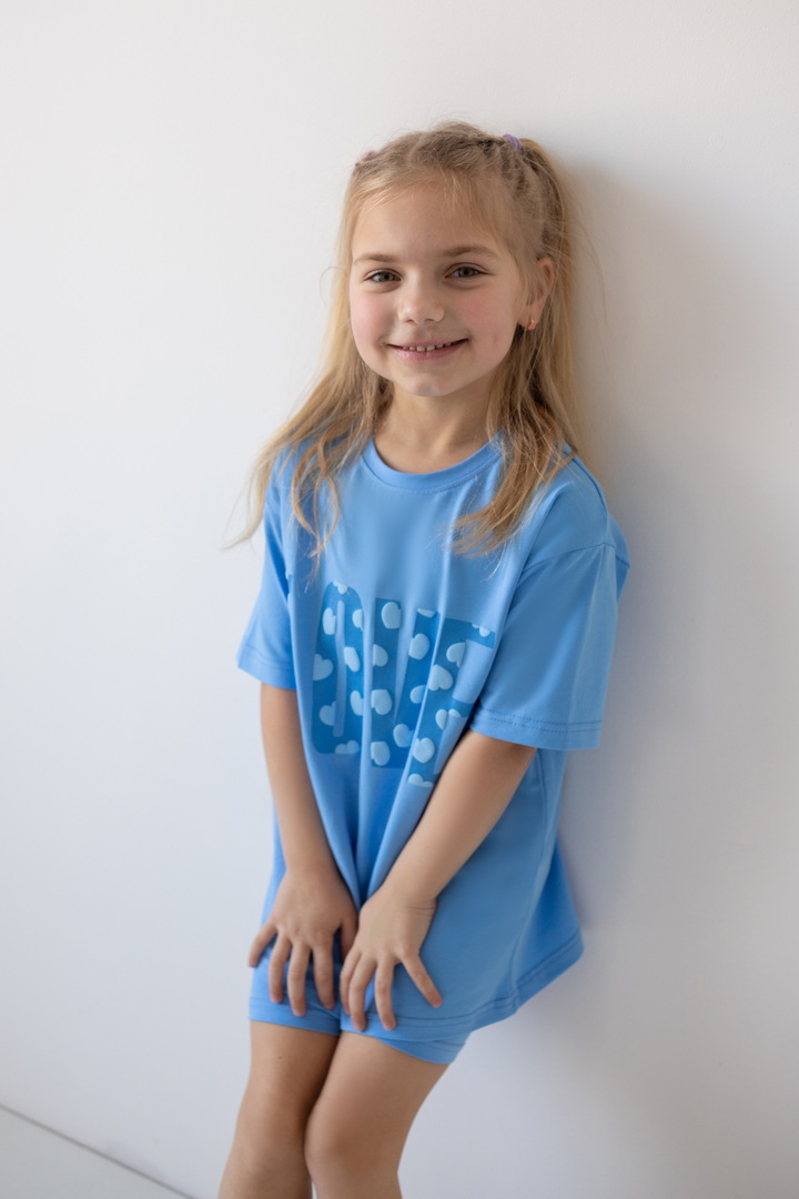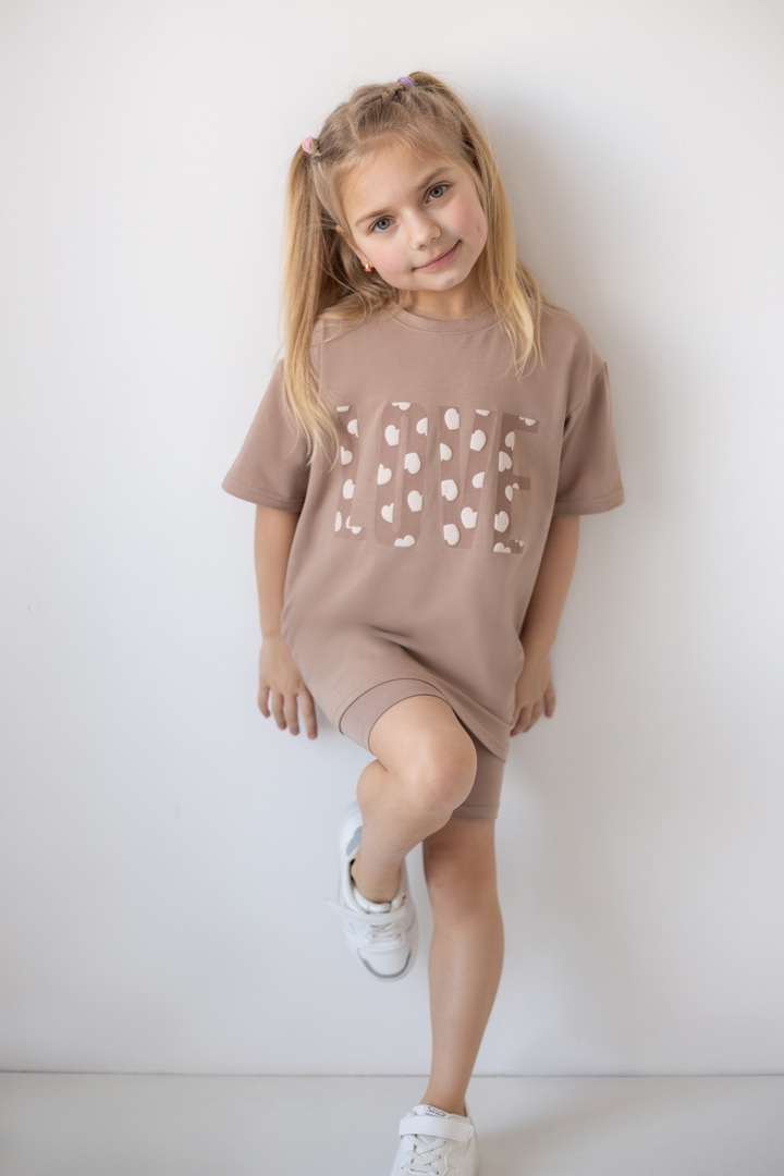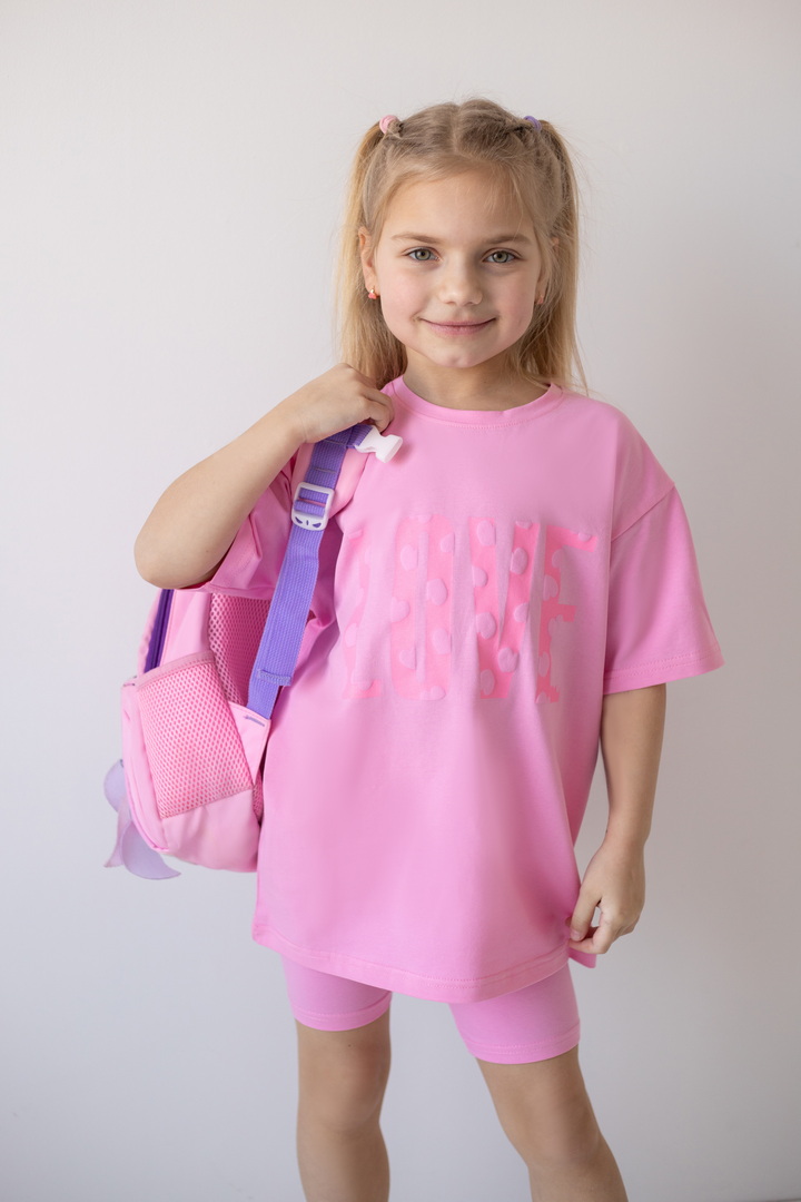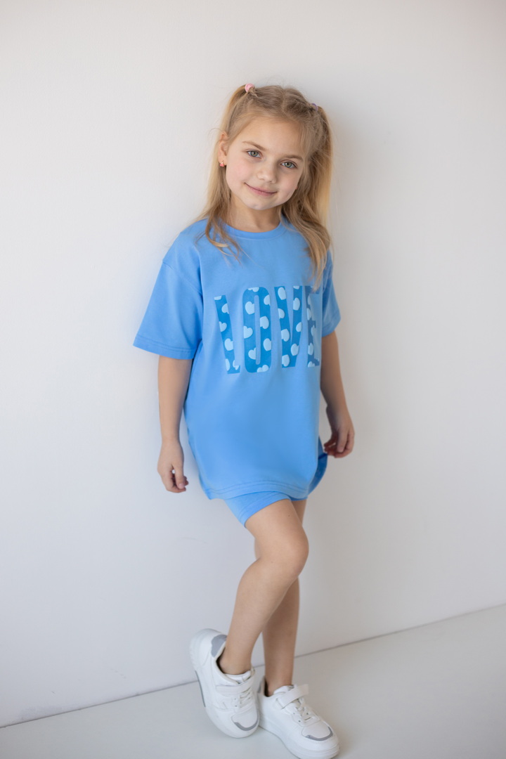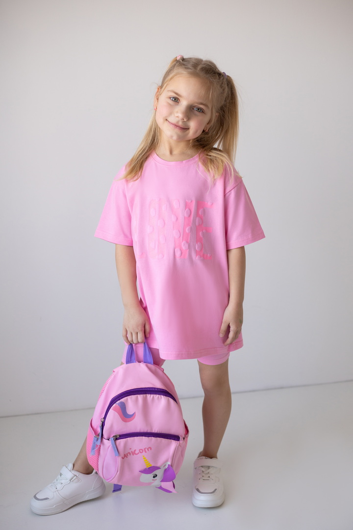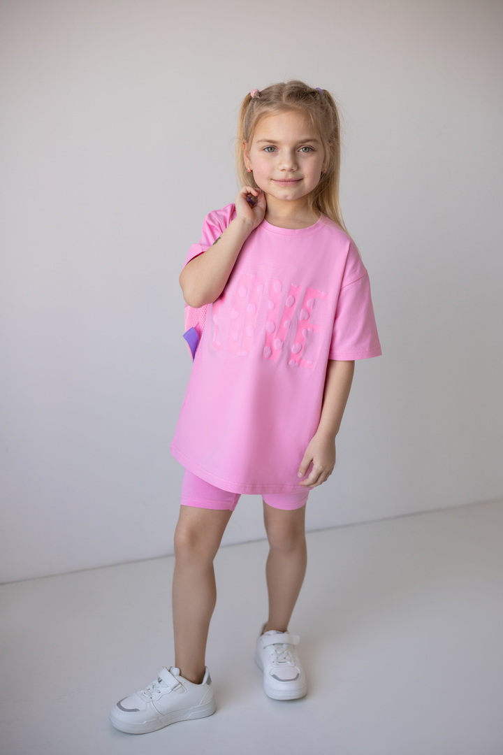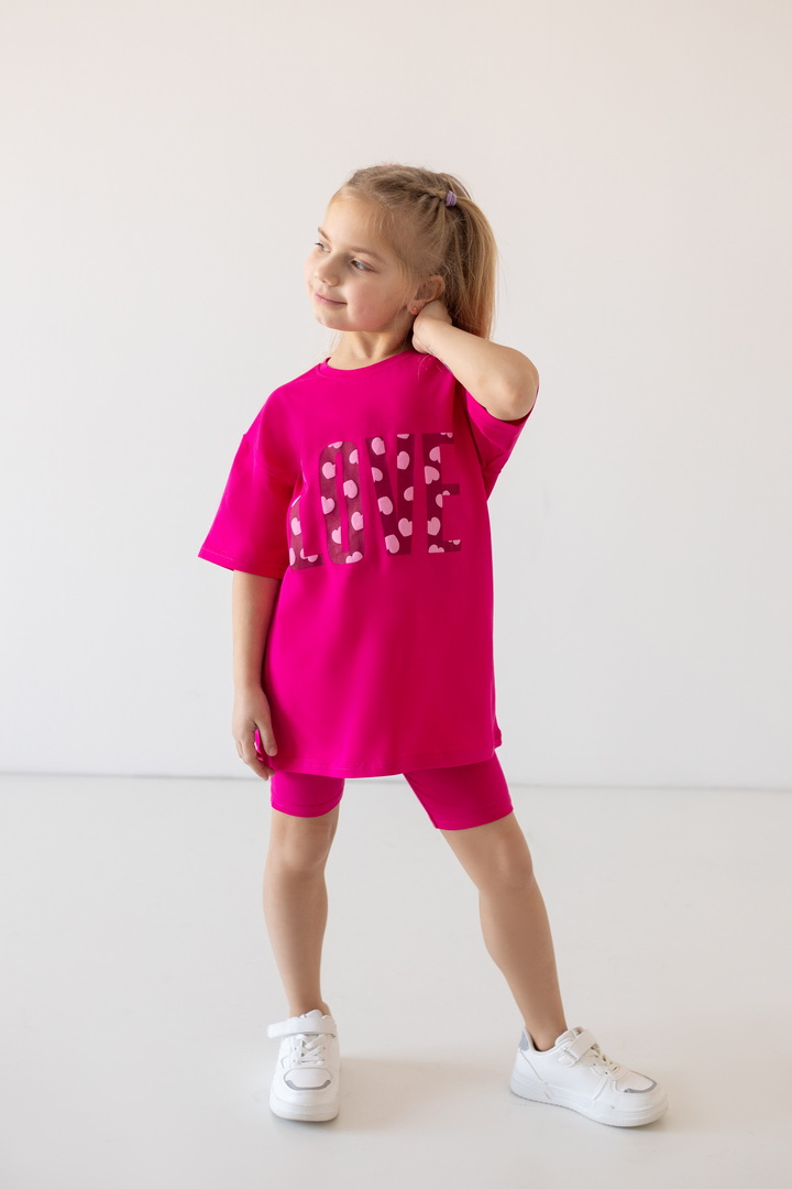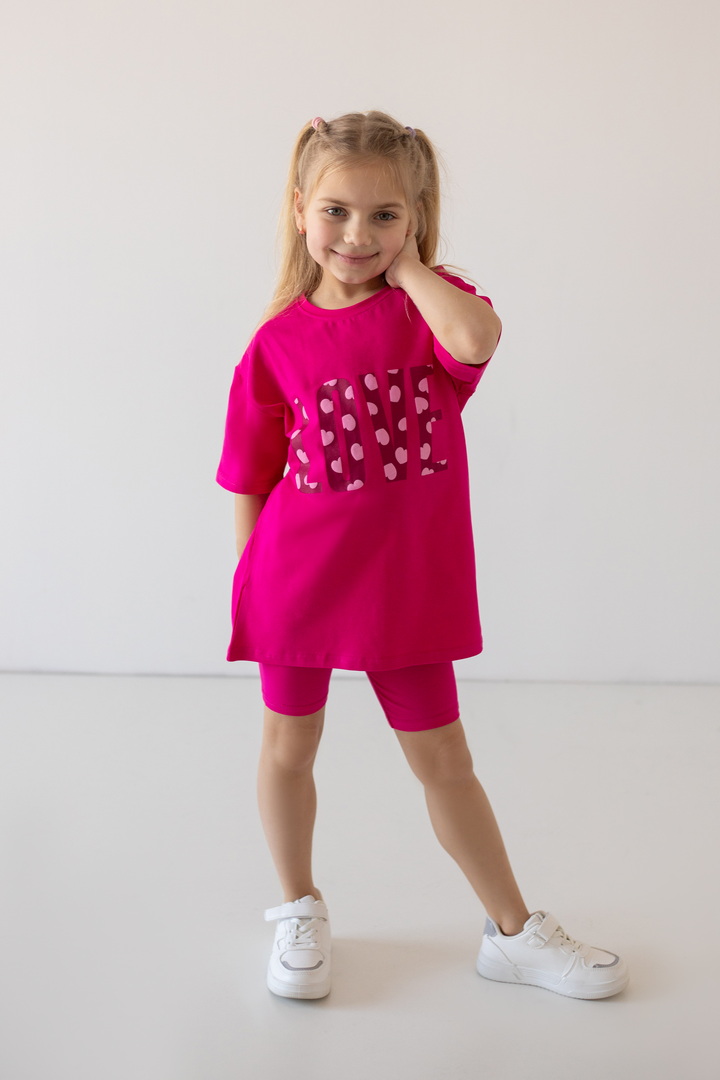 Стильний базовий комплект для дівчаток зі стрейч-куліру, складається з подовженої футболки "oversize", виконаної у яскравому кольорі з барвистим принтом, а також велосипедок в тон полотна. Полотно високої якості, не линяє, після прання не втрачає яскравості.