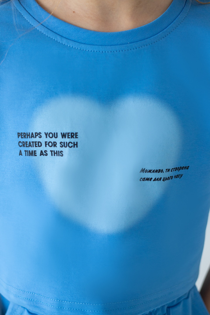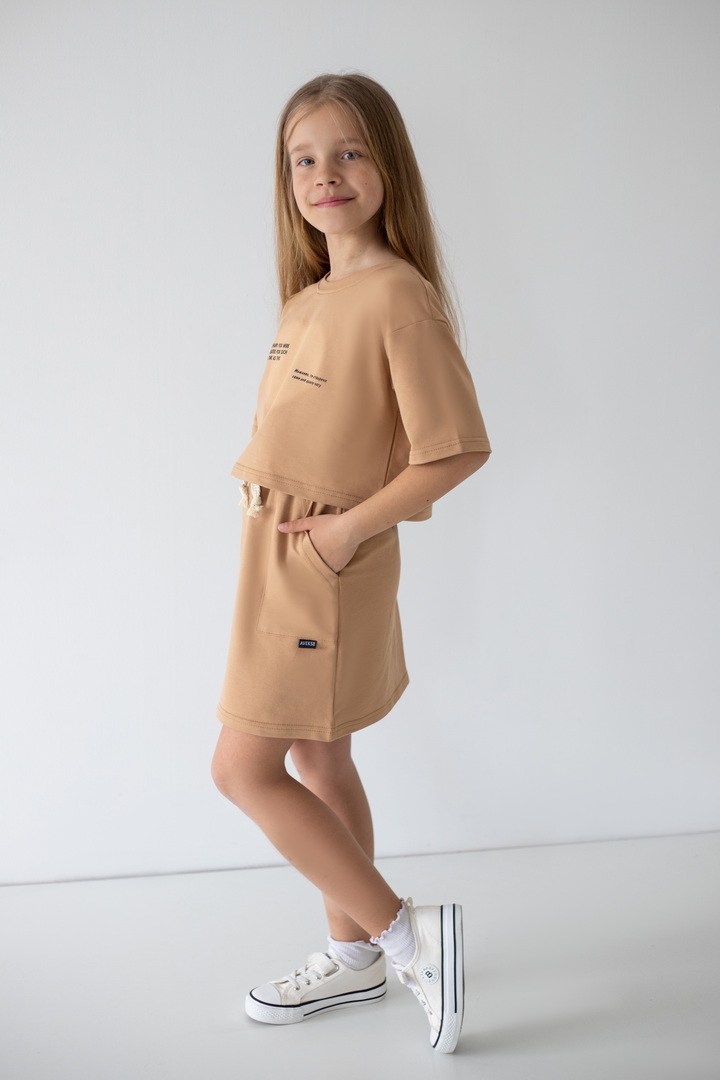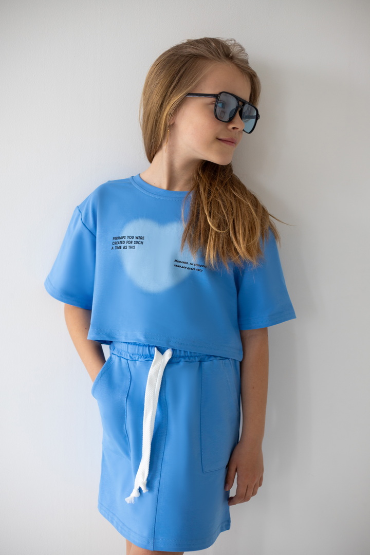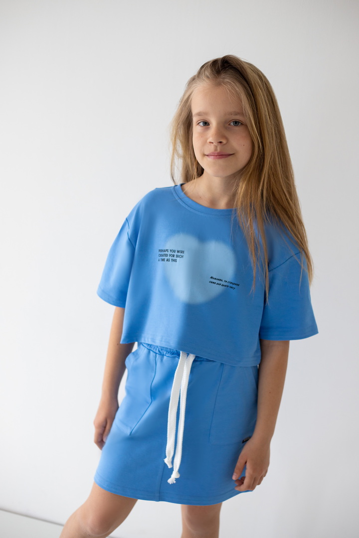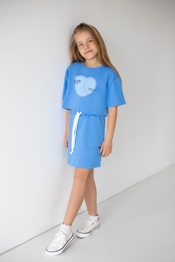 Комплект для дівчаток-підлітків із двониткового футера, в який входить укорочена футболка та спідниця. Футболка вільного крою, з короткими рукавами та округлим вирізом, з лаконічним одноколірним принтом у вигляді напису. Спідниця довжиною до коліна, притачним поясом із широкою гумкою, відстрочкою та шнурком, а також модними "стрілками", має кишені. Доповнити образ рекомендується стильними кросівками, кедами, спортивними босоніжками. Полотно гарної якості, не скочується, не линяє, може давати усадку після прання через високий відсоток бавовни у складі.