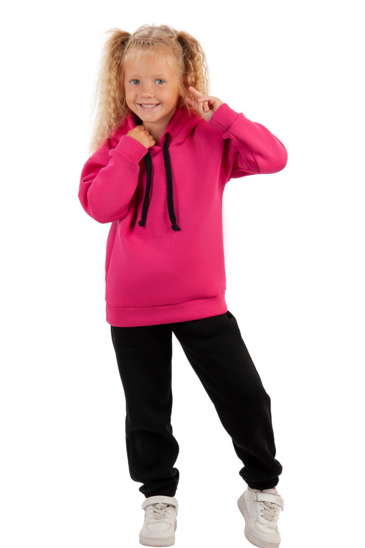 Базовий спортивний костюм для дівчаток виконаний з триниткового футера з начосом. Полотно щільне, тепле, добре зберігає тепло. Модель складається із худі та брюк. Худі з капюшоном, для зручності вставлений шнурок. Штани з кишенями, широким відстроченим поясом та шнурком. При правильному догляді полотно може дати незначну усадку.