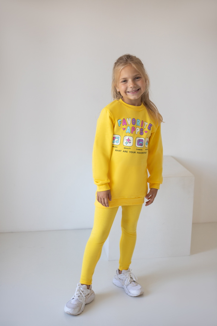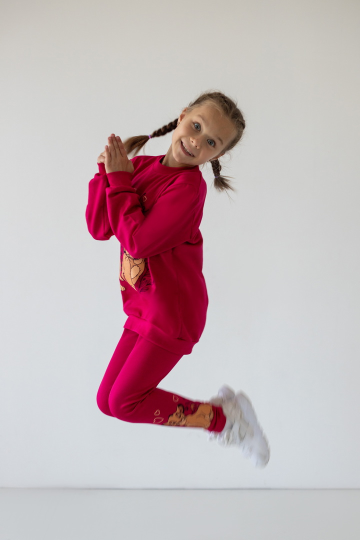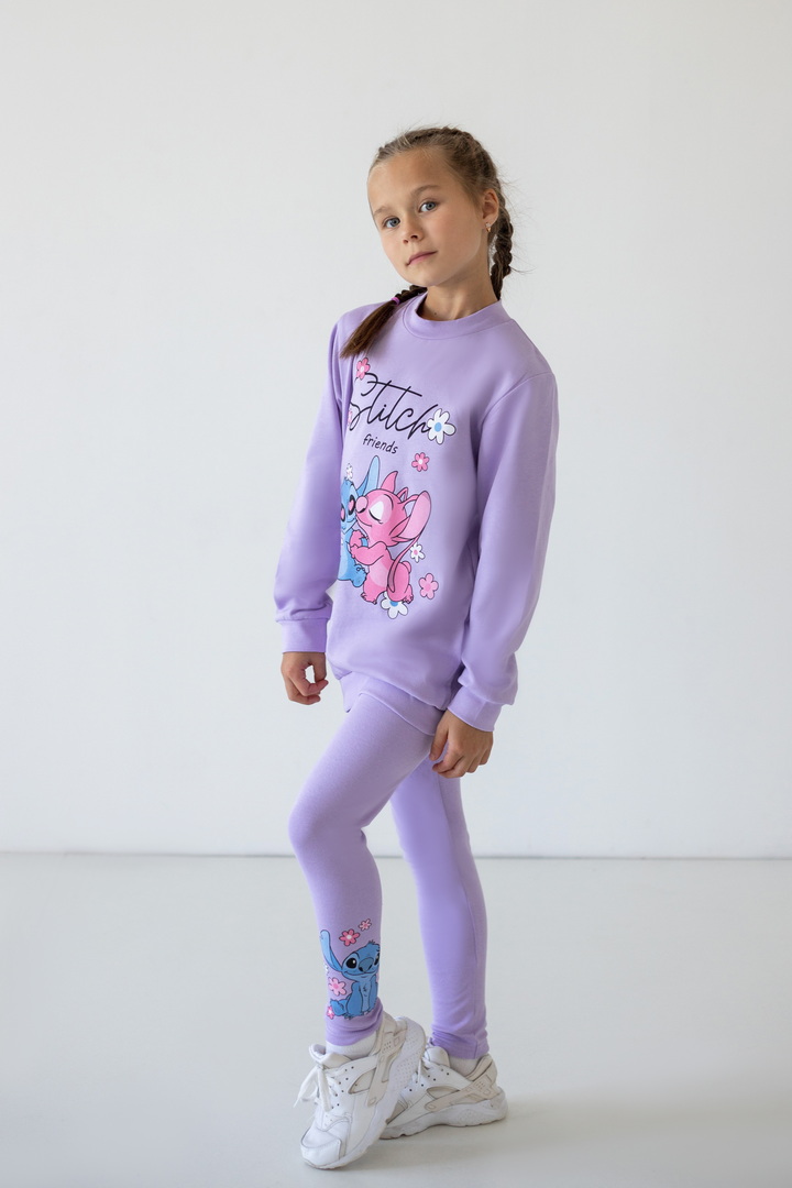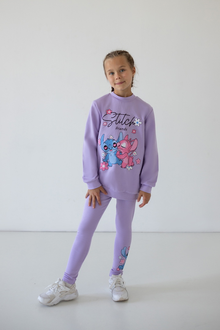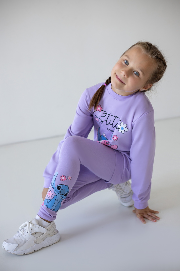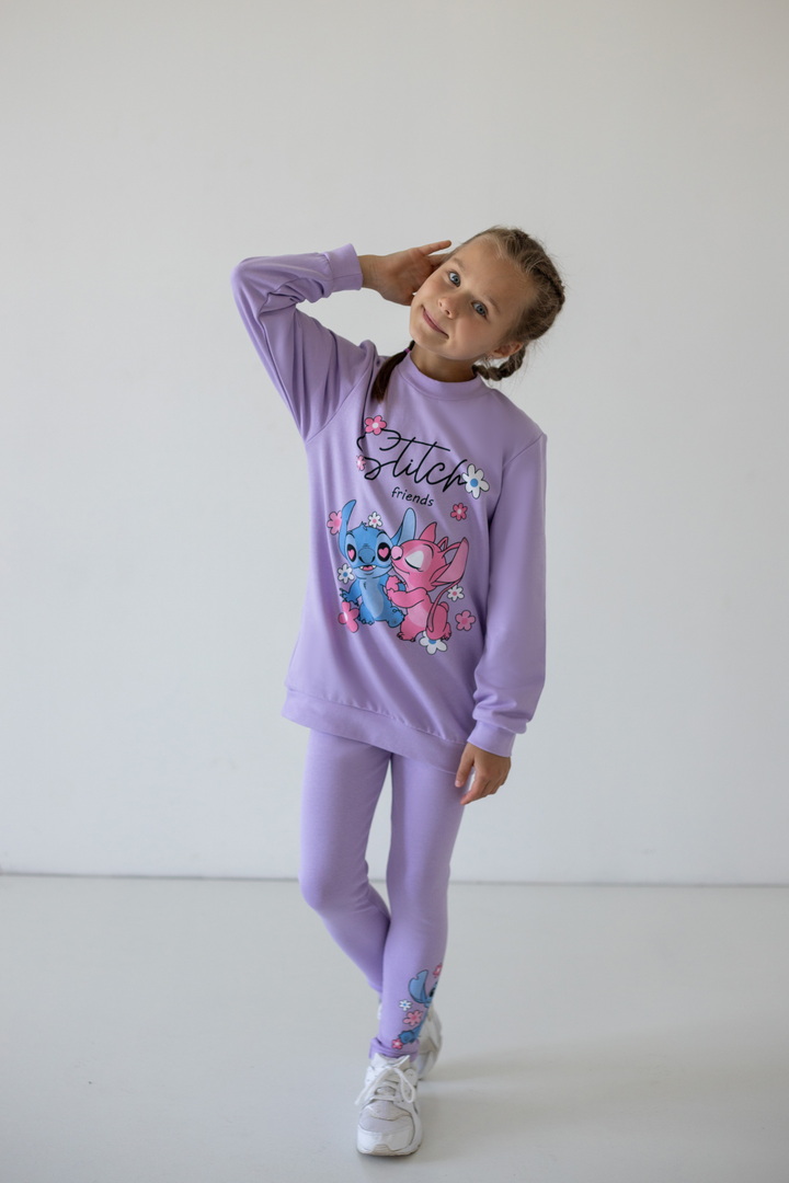 Стильний дитячий костюм, що складається зі світшоту (полотно "Футер з начосом") та легінсів (полотно "Стрейч"). Світшот прикрашений яскравим принтом, що надають образу грайливості та позитиву. Легінси доповнені принтом у нижній частині, створюючи гармонійний комплект. Костюм виготовлений із м’якої та приємної на дотик трикотажної тканини, яка забезпечує комфорт протягом дня. Ідеальний варіант для активних ігор, прогулянок чи щоденного носіння.Полотно: стрейч/футер з начосом.