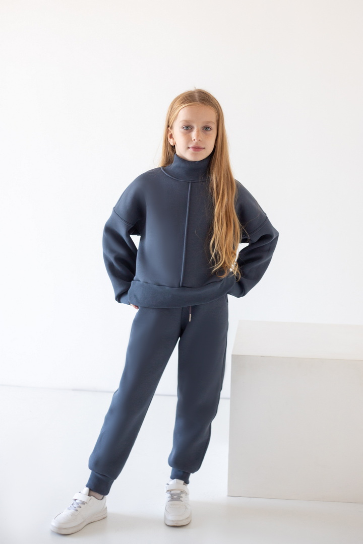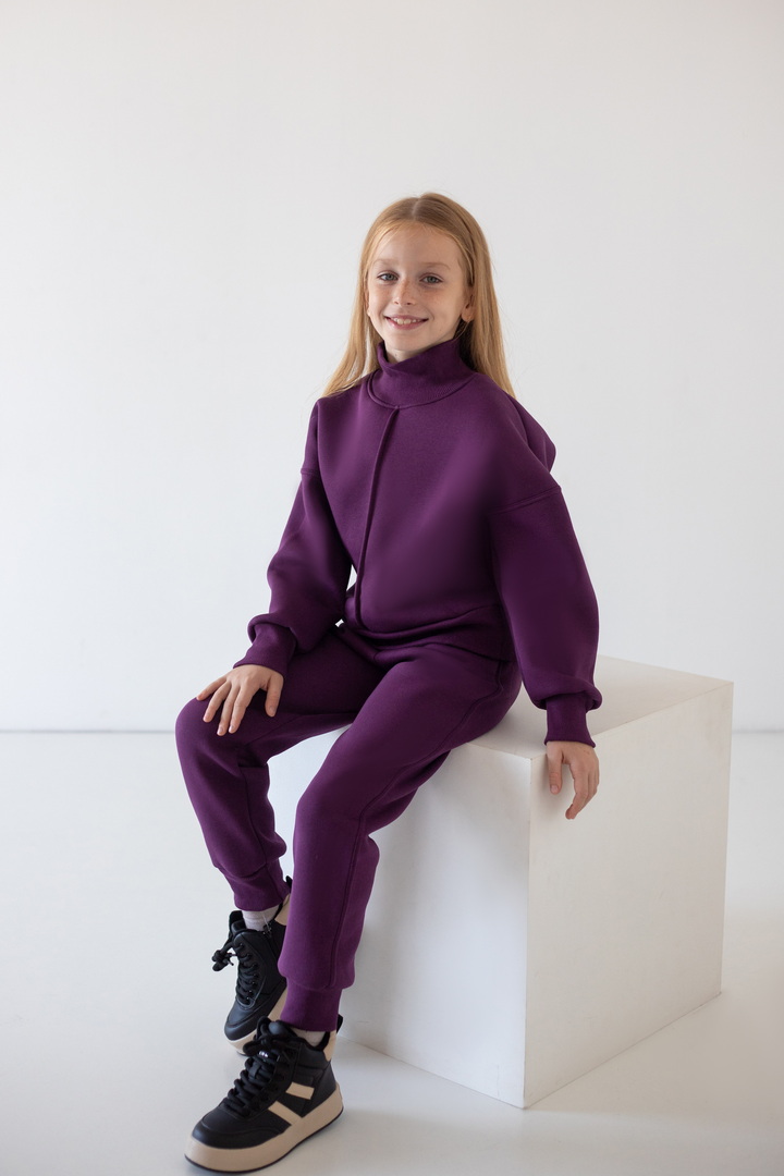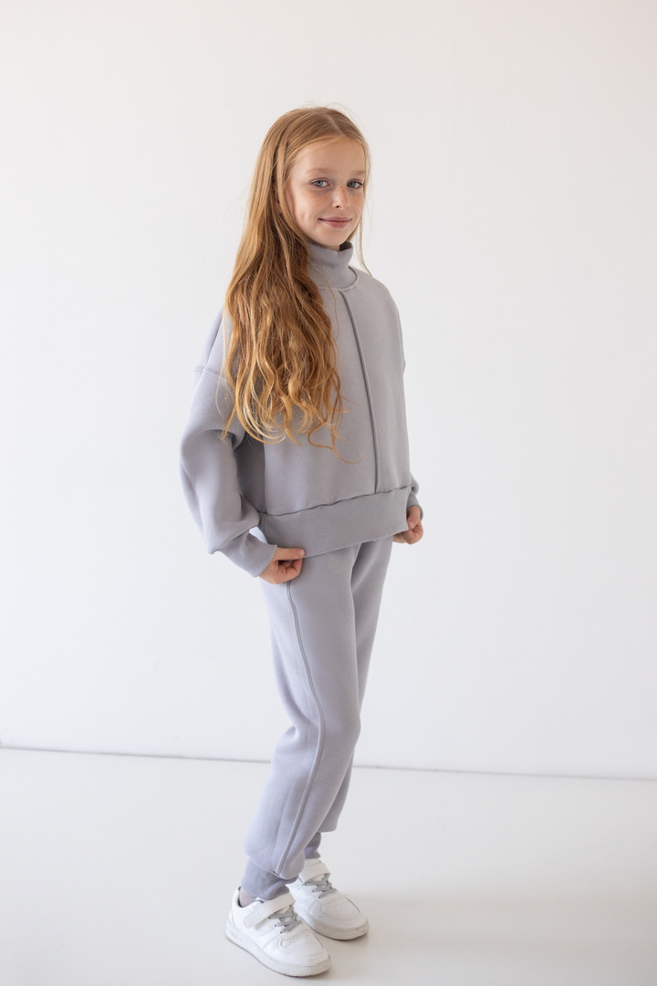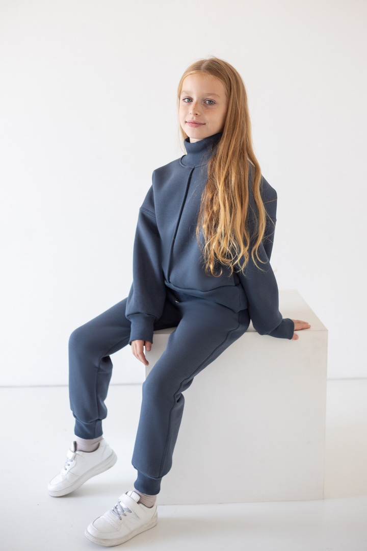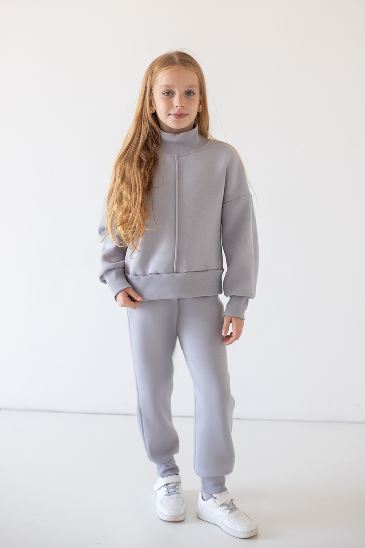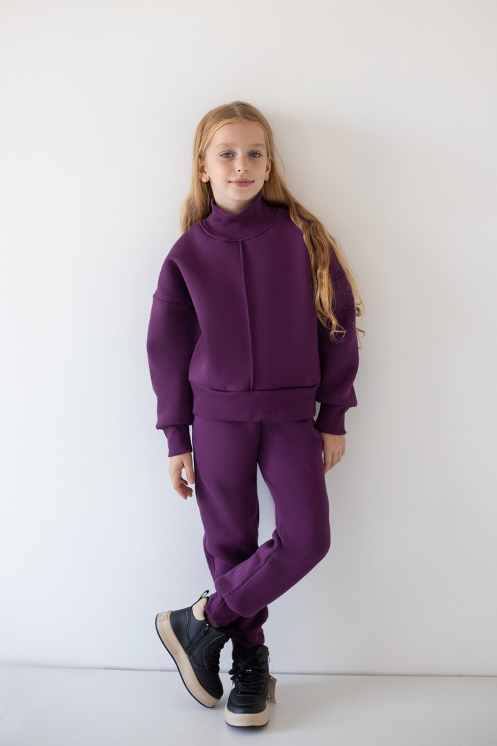 Стильний, однотонний костюм для дівчат - підлітків виготовлений з полотна "Тринитковий футер з начосом", складається з світшоту та брюк вільного крою. Рукава та низ штанини на манжетах, на поясі штанів є шнурок для зручності у використанні, також на поясі штанів є широка еластична резинка. Такий теплий комплект стане незамінним в холодну пору року, мінімалістичний, простий дизайн дозволить створити юним модницям стильний образ навіть восени і взимку.