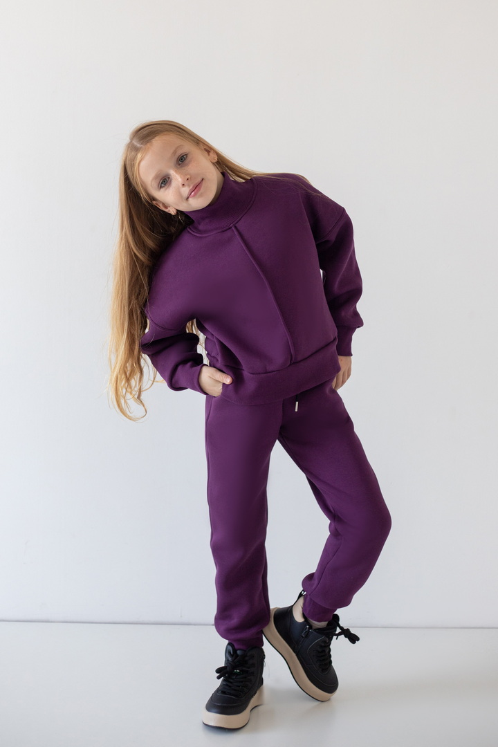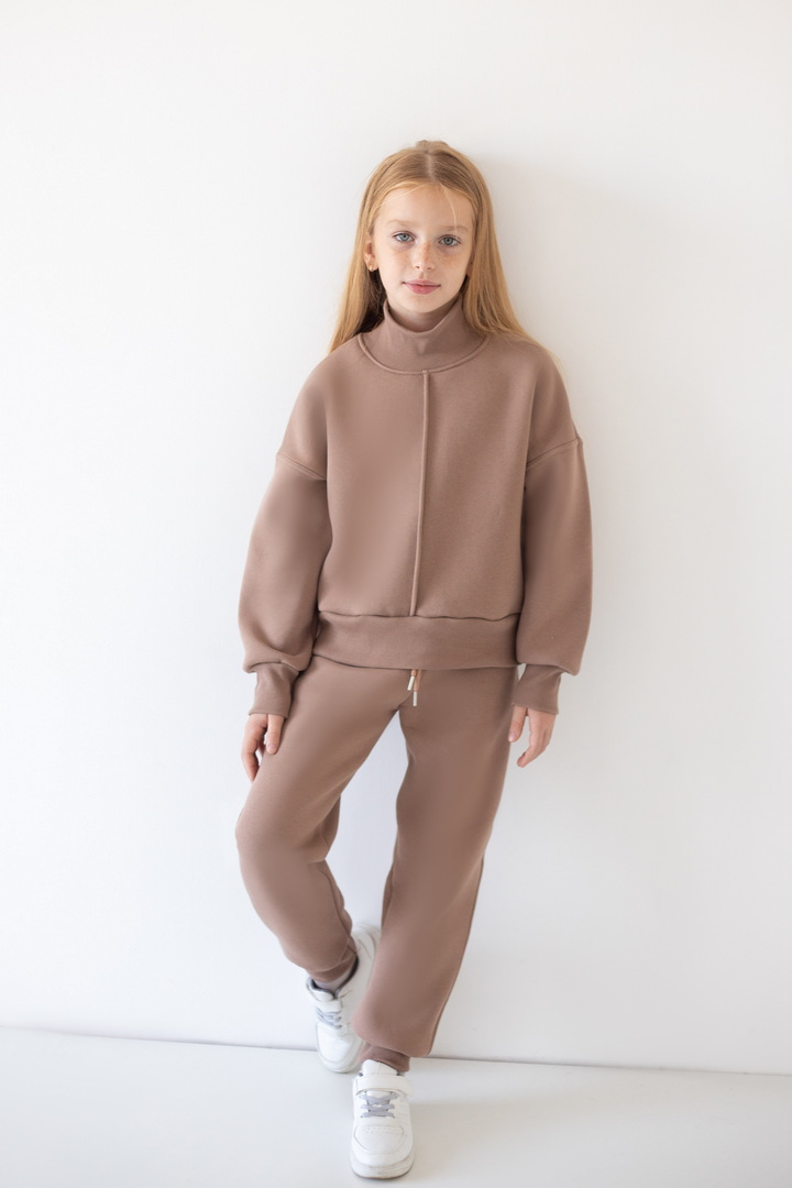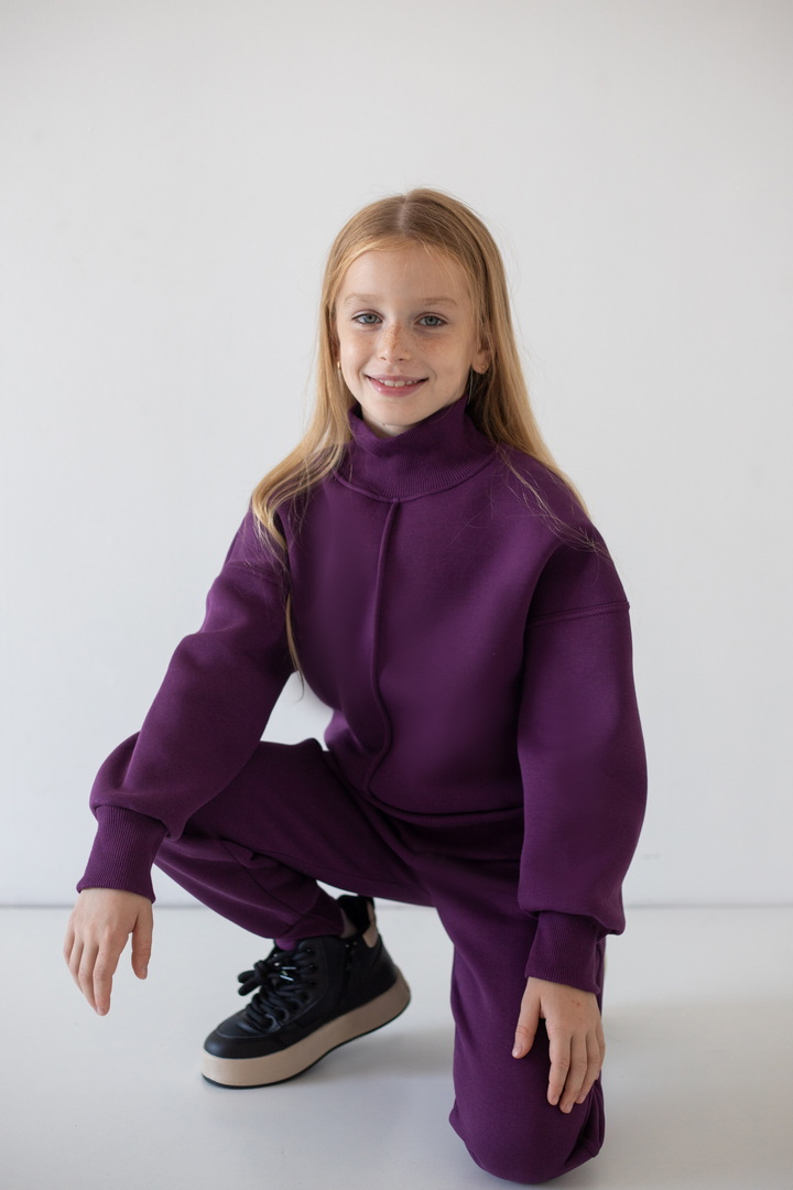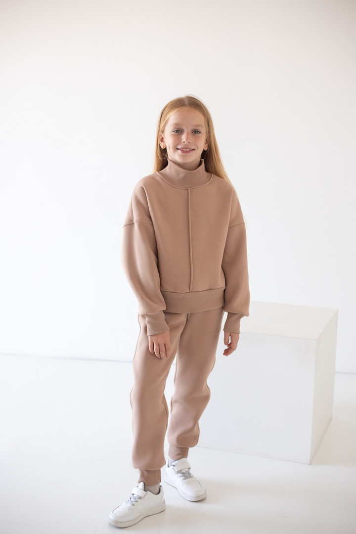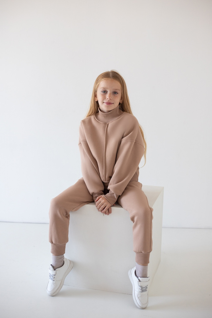 Стильний, однотонний костюм для дівчат - підлітків виготовлений з полотна "Тринитковий футер з начосом", складається з світшоту та брюк вільного крою. Рукава та низ штанини на манжетах, на поясі штанів є шнурок для зручності у використанні, також на поясі штанів є широка еластична резинка. Такий теплий комплект стане незамінним в холодну пору року, мінімалістичний, простий дизайн дозволить створити юним модницям стильний образ навіть восени і взимку.