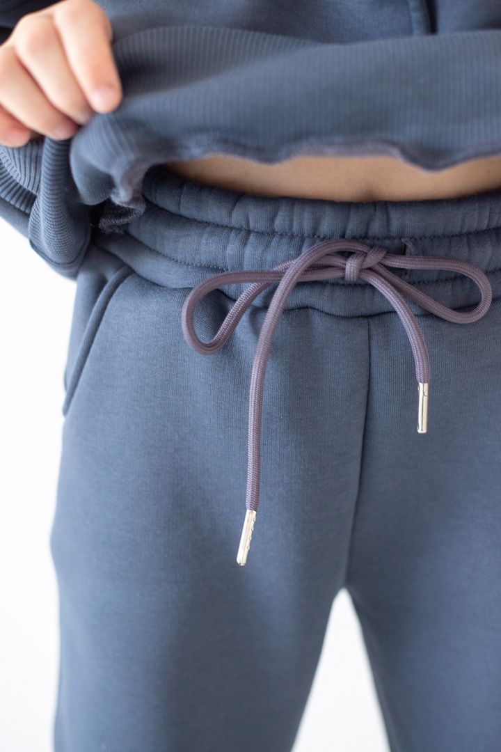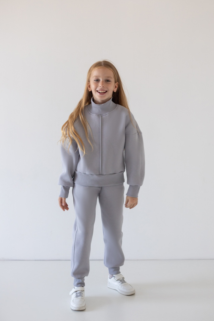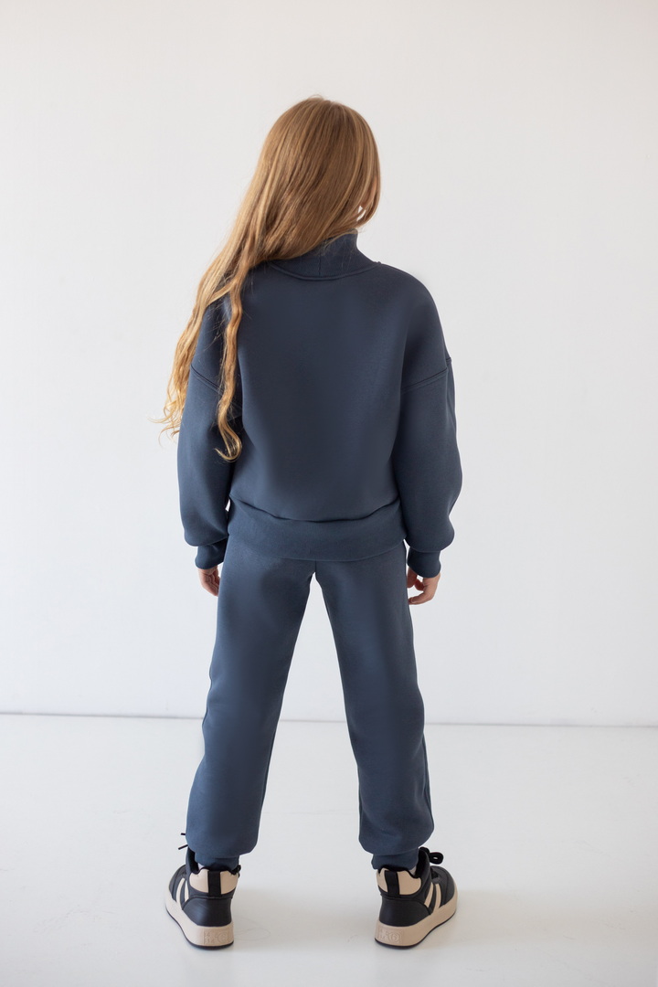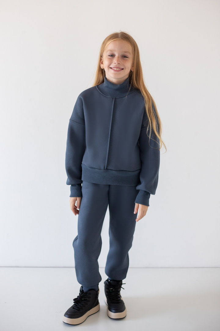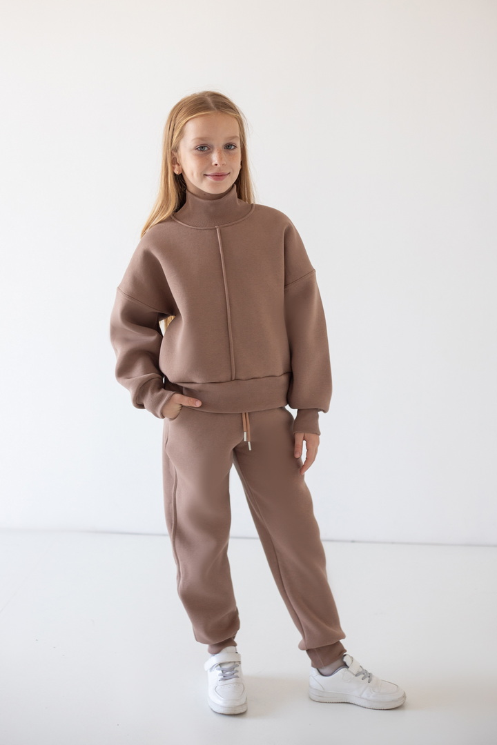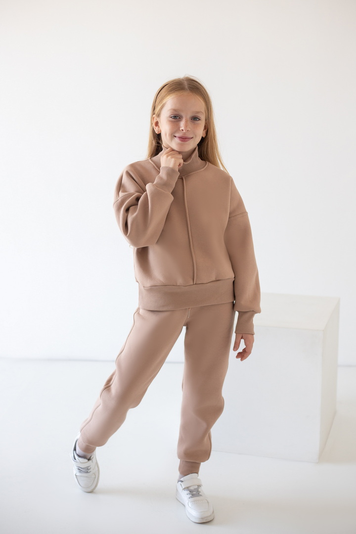 Стильний, однотонний костюм для дівчат - підлітків виготовлений з полотна "Тринитковий футер з начосом", складається з світшоту та брюк вільного крою. Рукава та низ штанини на манжетах, на поясі штанів є шнурок для зручності у використанні, також на поясі штанів є широка еластична резинка. Такий теплий комплект стане незамінним в холодну пору року, мінімалістичний, простий дизайн дозволить створити юним модницям стильний образ навіть восени і взимку.