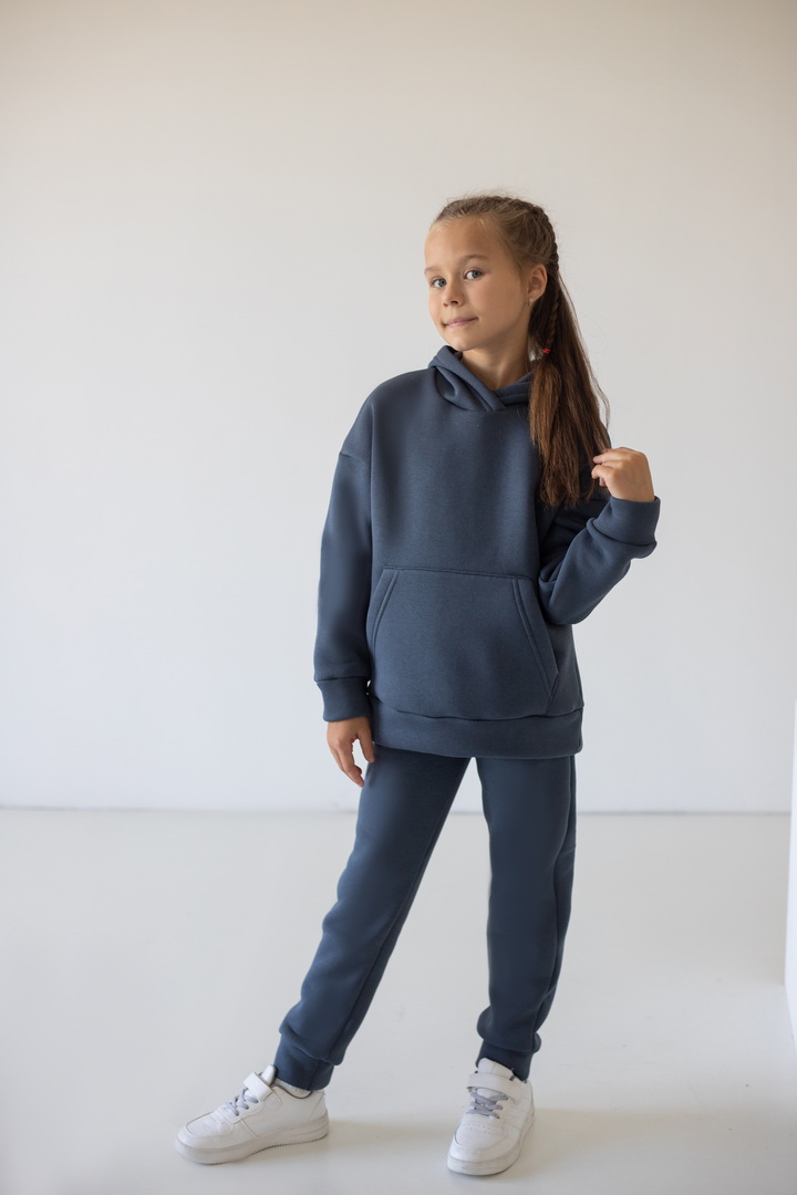 Сучасний костюм виконаний з триниткового футера з начосом. Модель складається з худі вільного крою та штанів. Худі з капюшоном, штани з кишенями, рукави та низ штанини на манжетах, для зручності всередині штанів вставлений шнурок. Полотно високої якості, з хорошим начосом по вивороті, має хороші теплоізоляційні властивості.