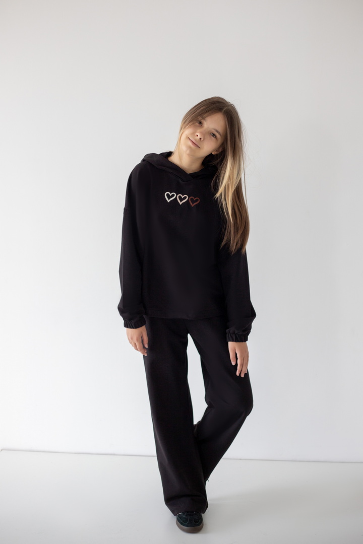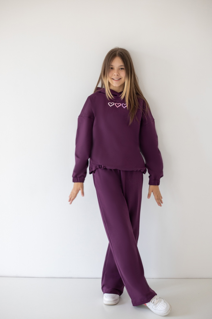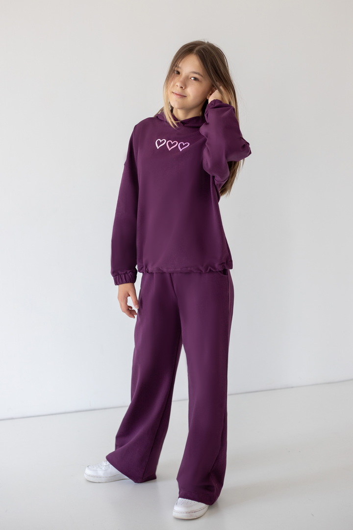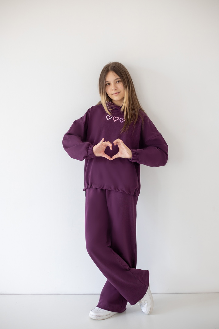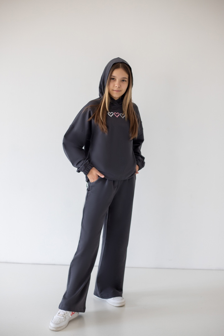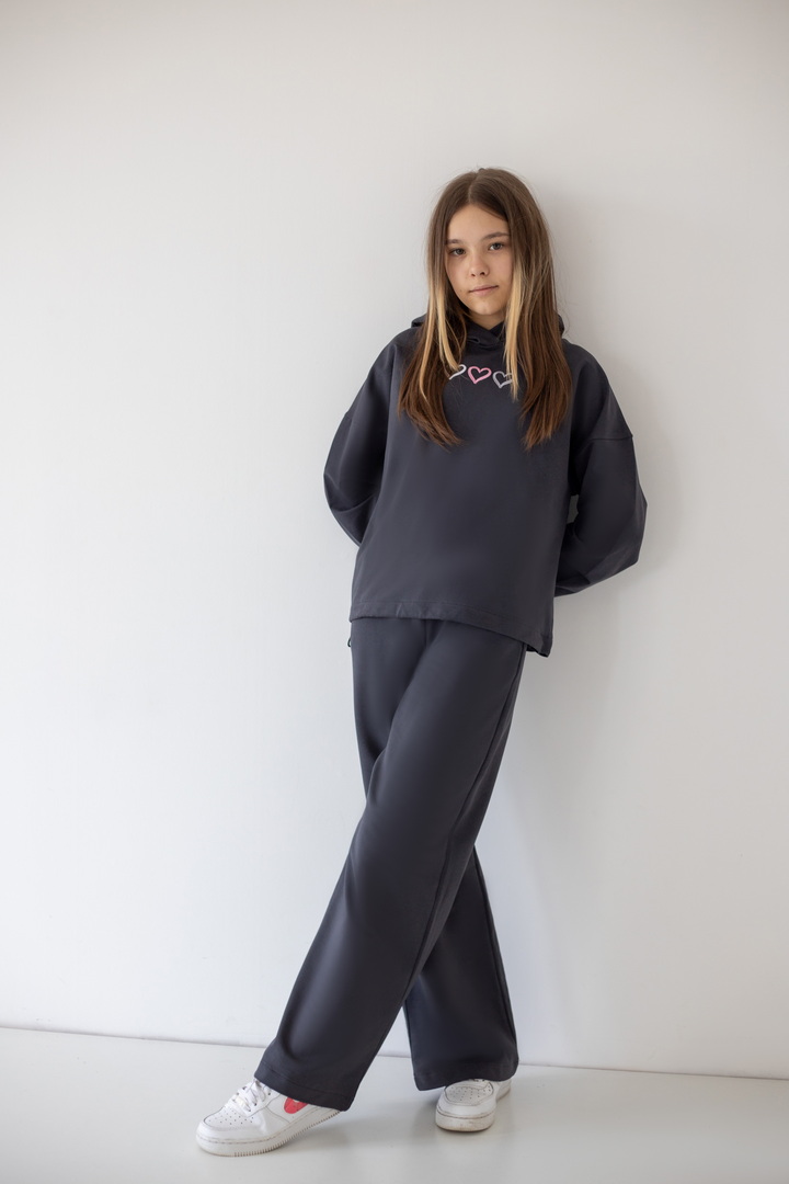 Ультрамодний костюм для дівчаток-підлітків виконаний із двониткового футера. Модель складається з худі та штанів, худі з капюшоном, по низу худі вставлений шнурок для регулювання ширини та затяжки. Штани донизу злегка розкльошені, з кишенями. Костюм прикрашений вишивкою. Полотно досить щільне, не деформується та не скочується.