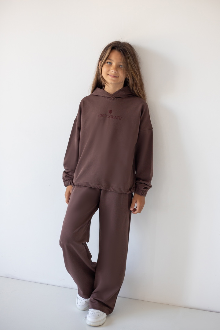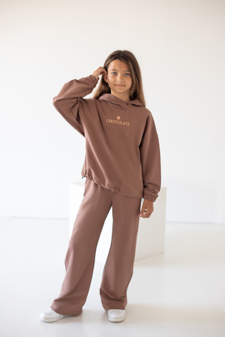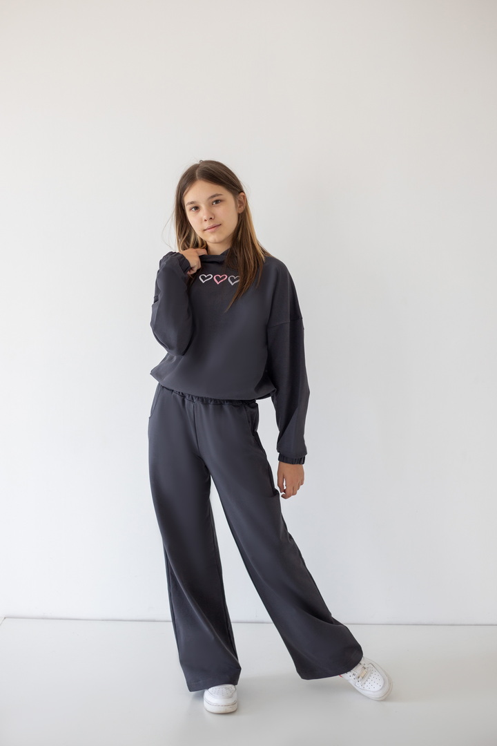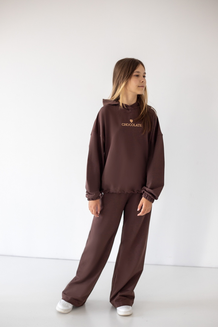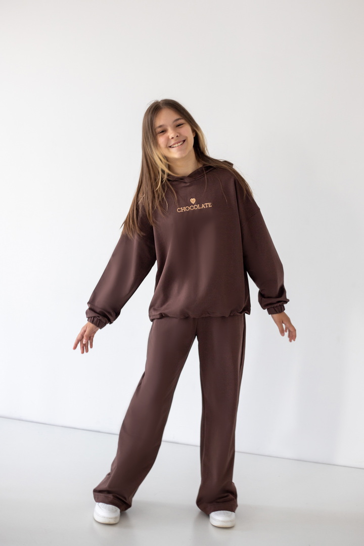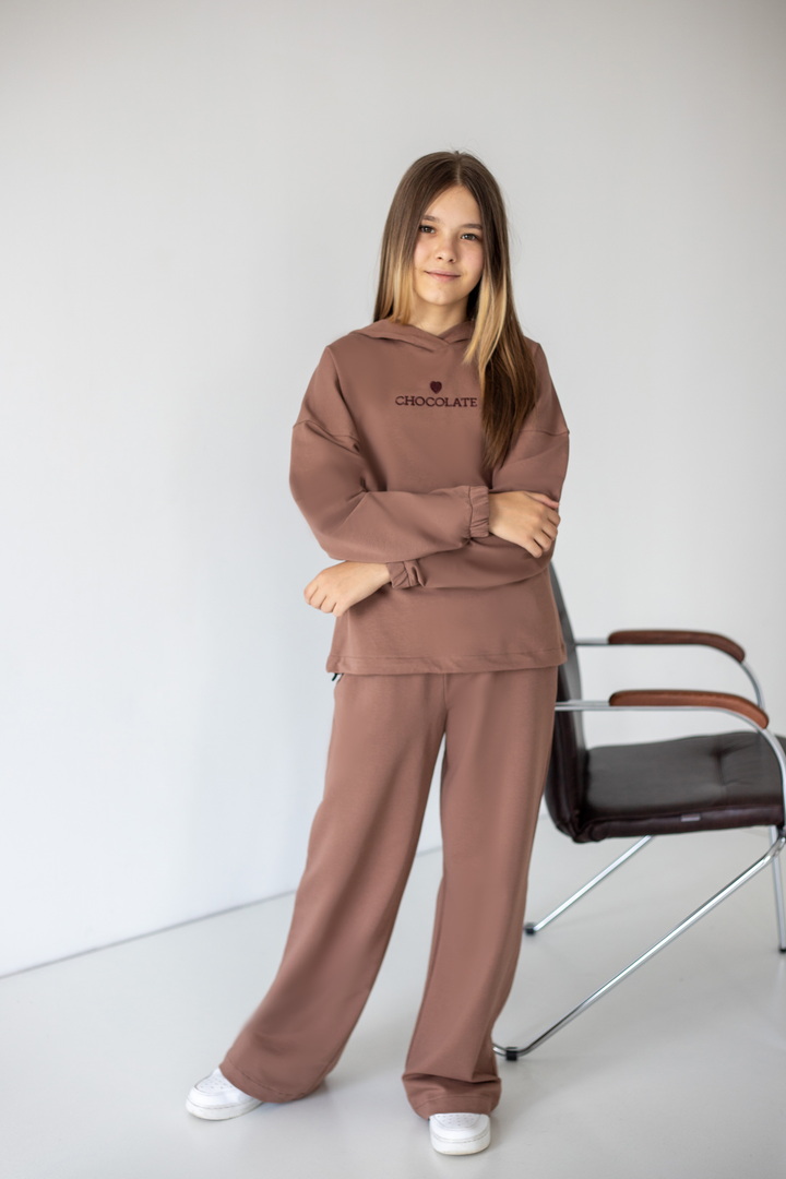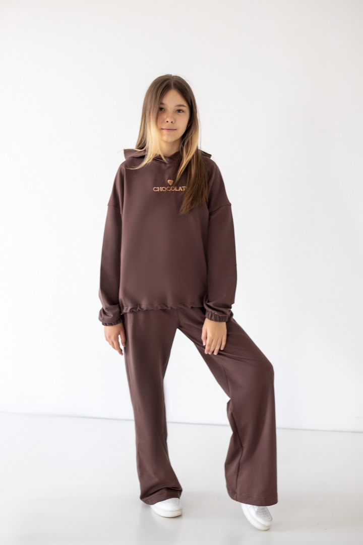 Ультрамодний костюм для дівчаток-підлітків виконаний із двониткового футера. Модель складається з худі та штанів, худі з капюшоном, по низу худі вставлений шнурок для регулювання ширини та затяжки. Штани донизу злегка розкльошені, з кишенями. Костюм прикрашений вишивкою. Полотно досить щільне, не деформується та не скочується.